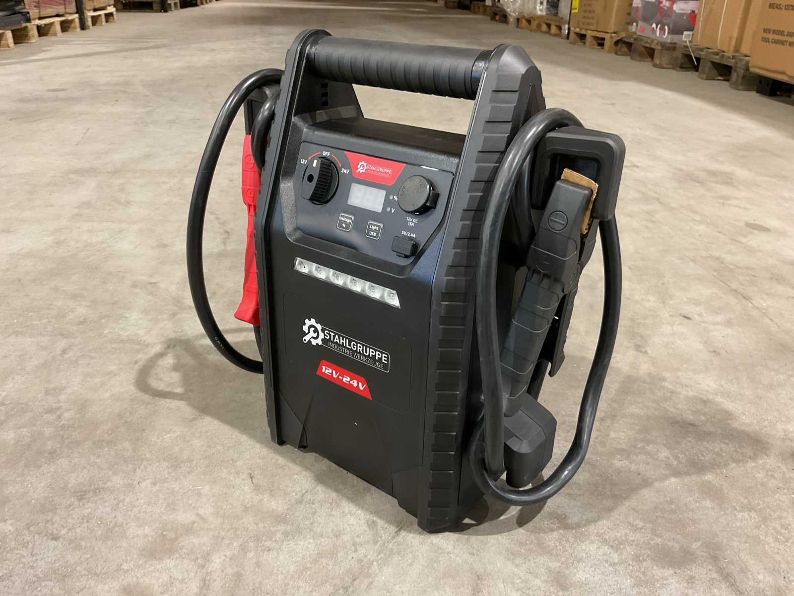 Voorzien van USB lader; 12V lader; led werklamp met diverse standen; 12V 2200A/4400A; 24V 800A/1600A; ongebruikt in doos Merk: Stahlgruppe Type: 4400A Bouwjaar: 2025 Laadstroom: 4400A Aansluiting: 230V Eigen gewicht: 22kg Totale afmeting L: 500mm Totale afmeting Breedte: 300mm Totale afmeting Hoogte: 500mm