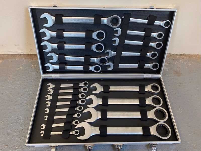 Voorzien van steek met ringratel sleutel set; maten 6, 7, 8, 9, 10, 11, 12, 13, 14, 15, 16, 17, 18, 19, 20, 21, 22, 23, 24, 27, 30, 32; ongebruikt in verpakking Merk: Stahlgruppe Set: true Delig: 22 Bouwjaar: 2024 Type: 22 delig