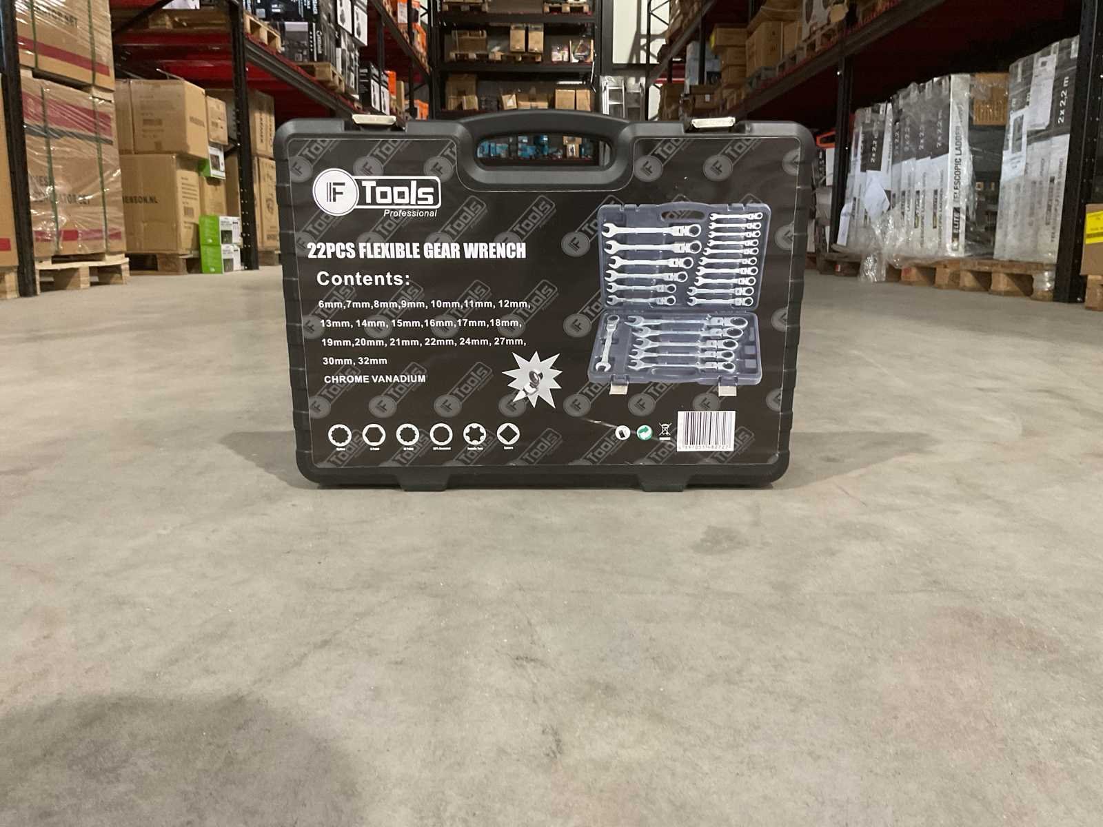 Voorzien van Steek/Ratelringsleutel maten: 6, 7, 8, 9, 10, 11, 12, 13, 14, 15, 16, 17, 18, 19, 20, 21, 22, 23, 24, 27, 30, 32mm; Kunstof koffer; Ongebruikt (Transport Afmeting 500 x 70 x 360mm, Gewicht: 8,84 kg) Merk: F Tools Professional Set: true Delig: 22 Bouwjaar: 2025 Type: 22PCS Flexible Gear Wrench