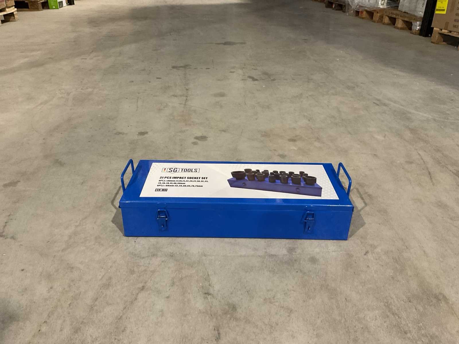 Voorzien van Krachtdoppenset; 3/4" maten: 17, 19, 21, 22, 24, 27, 30, 32, 33, 34, 36, 38, 41, 46, 50 mm; 1" doppen: 52, 55, 60, 65, 70, 75 mm; Ongebruikt in doos (gewicht inclusief verpakking 22,90 kg) Merk: SG Tools Delig: 21 Krachtdop uitvoering: true Type: 21 PCS impact Socket Set1 Bouwjaar: 2025