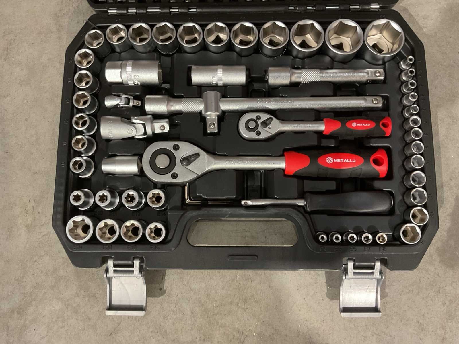 Voorzien van 1/4" Doppen 4-4.5-5-5.5-6-7-8-9-10-11-12-13-14mm; 1/4" Lange doppen 6-7-8-9-10-11-12-13mm; 1/4" Torx doppen E4-E5-E6-E7-E8; 1/4" Inbus op dop 3-4-5-6mm; 1/4" Philips op dop PH.1-PH.2; 1/4" Pozidriv op dop PZ.1-PZ.2 1/4" Platte bit op dop 4-5.5-6.5mm; 1/4" Torx op dop T8-T10-T15-T20-T25-T27-T30; 1/4" Ratel 72 tanden Quick release; 1/4" Verlengstukken 50-100mm; 1/4" Kniegewricht; 1/4'' T Hendel; 1/4" Spinner; 1/2" Doppen 10-11-12-13-14-15-16-17-18-19-20-21-22-24-27-30-32mm; 1/2" Lange doppen 14-15-17-19-22mm; 1/2" Torx doppen E10-E11-E12-E14-E16-E18-E20-E24; 1/2" Inbus bitten 7-8-10-12-14mm; 1/2" Philips bitten PH.3-PH.4; 1/2" Pozidriv bitten PZ.3-PZ.4; 1/2" Platte bitten 8-10-12mm; 1/2" Torx bitten T40-T45-T50-T55-T60; 1/2" Bit houder; 1/2" Ratel 72 tanden Quick release; 1/2" Verlengstukken 125-250mm; 1/2" Bougiedoppen 16-21mm; 1/2" Kniegewricht; Inbus L-sleutels 1.5-2-2.5mm; Ongebruikt in doos (Transport Afmeting 380 x 80 x 290, Gewicht 6.52kg) Merk: Metallo Met koffer: true Delig: 108 Type: META-108W Bouwjaar: 2025