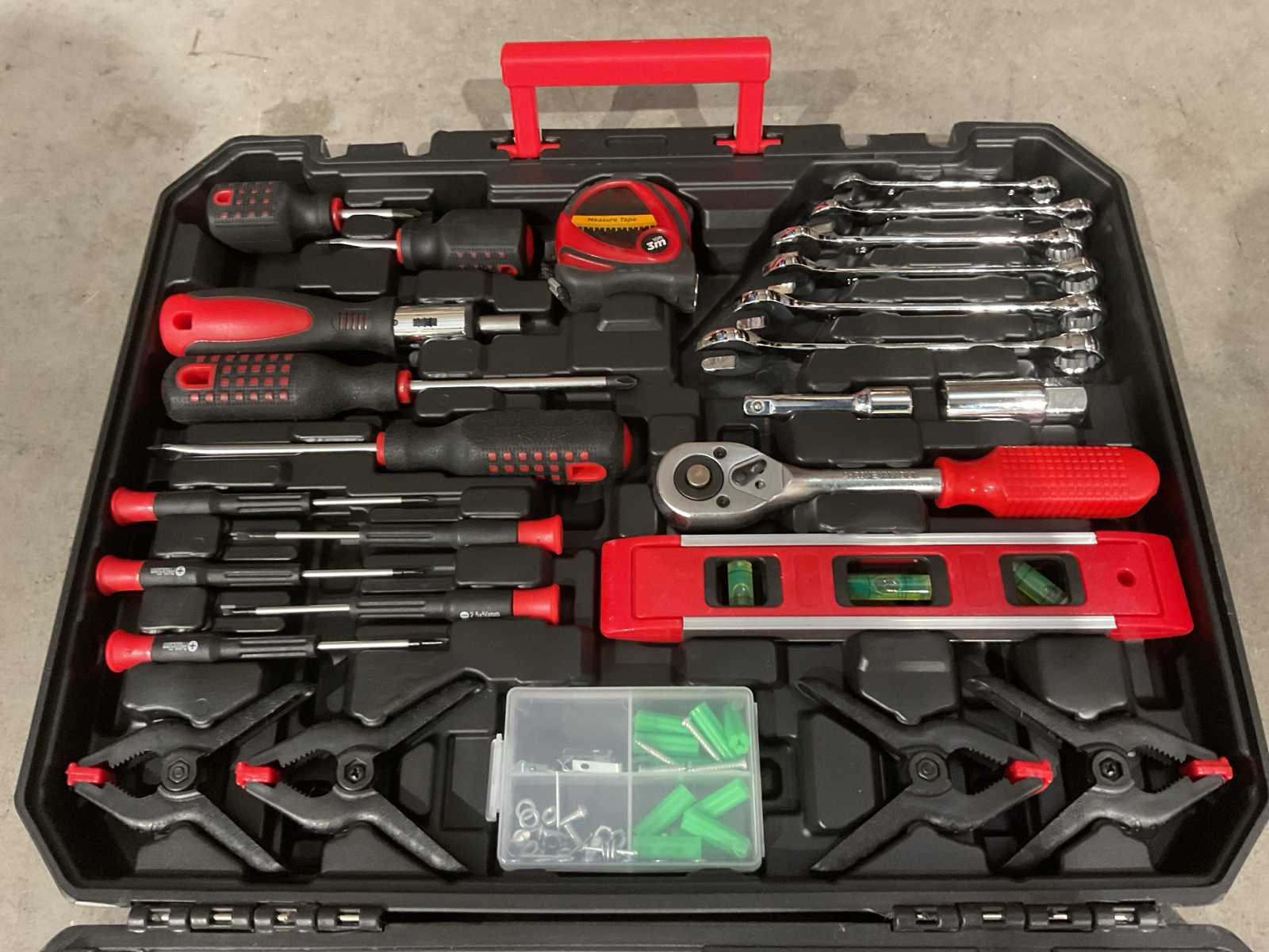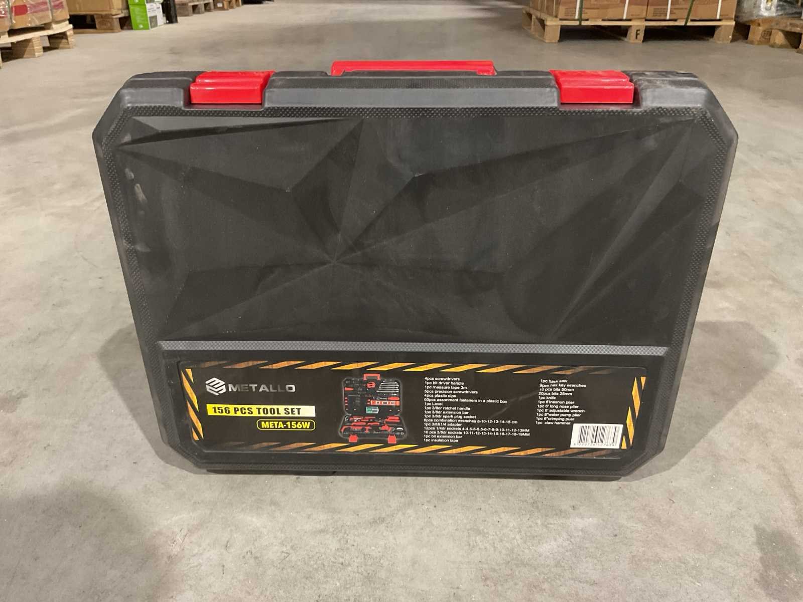 Voorzien van 4 stuks schroevendraaiers SL6*38, SL6*100; PH2*38, PH2*100; 1 stuk bit driver handvat; 1 stuk meetlint 3m; 5 stuks precisieschroevendraaiers; 4 stuks plastic dips; 60 stuks assortiment bevestigingsmiddelen in een doos; 1 stuk Niveau; 1 stuk 3/8dr ratelhandvat; 1 stuk 3/8dr verlengstuk; 1 stuk 3/8dr bougiedop; 6 ringsteeksleutels 8-10-12-13-14-15 cm; 1 stuk 3/8&1/4 adapter; 12 stuks 1/4dr doppen 4-4.5-5-5.5-6-7-8-9-10-11-12-13MM; 10 stuks 3/8dr doppen 10-11-12-13-14-15-16-17-18-19MM; 1 stuk bitverlengstuk; 1 stuk isolatietape; 1 stuk ijzerzaag; 9 stuks inbussleutels 1.5-2-2.5-3-4-5-6-8-10mm; 10 stuks bits 50 mm; 20 stuks bits 25mm; 1 stuk mes; 1 stuk 6'lnesnun tang; 1 stuk 6' langbektang; 1 stuks 6' verstelbare sleutel;1 stuk 8''waterpomptang; 1 stuk 6'' krimptang; 1 stuks klauwhamer; Ongebruikt in doos (Transport afmeting 450 x 90 x 360, Gewicht 5.58 KG) Merk: Metallo Met koffer: true Delig: 156 Type: META-156W Bouwjaar: 2025