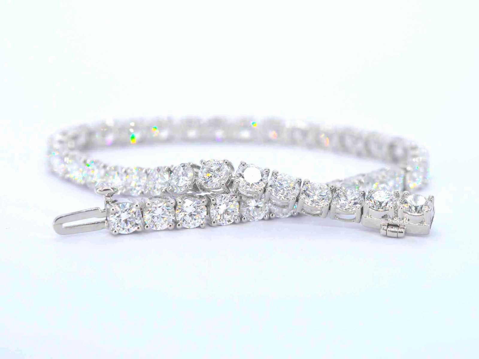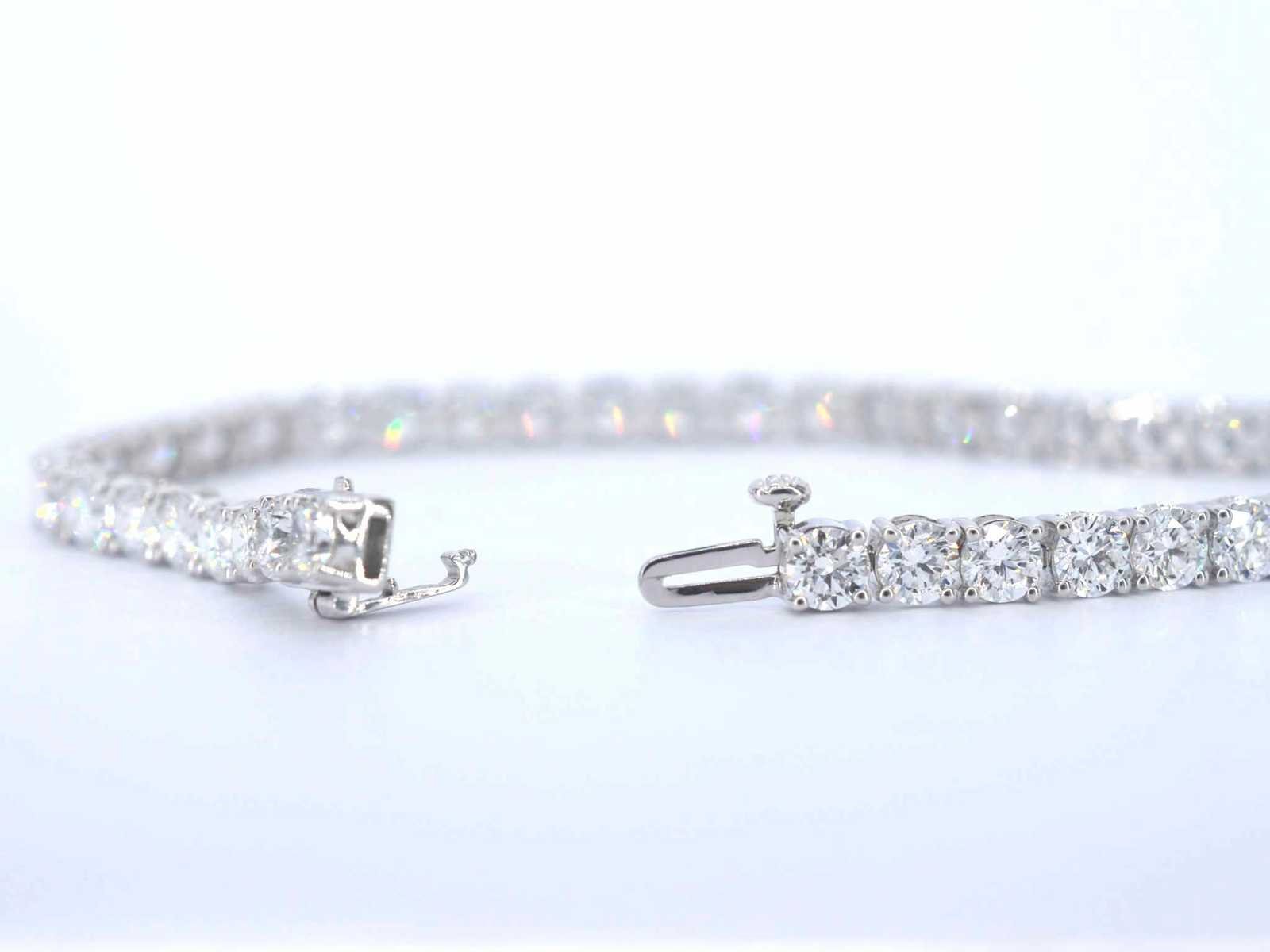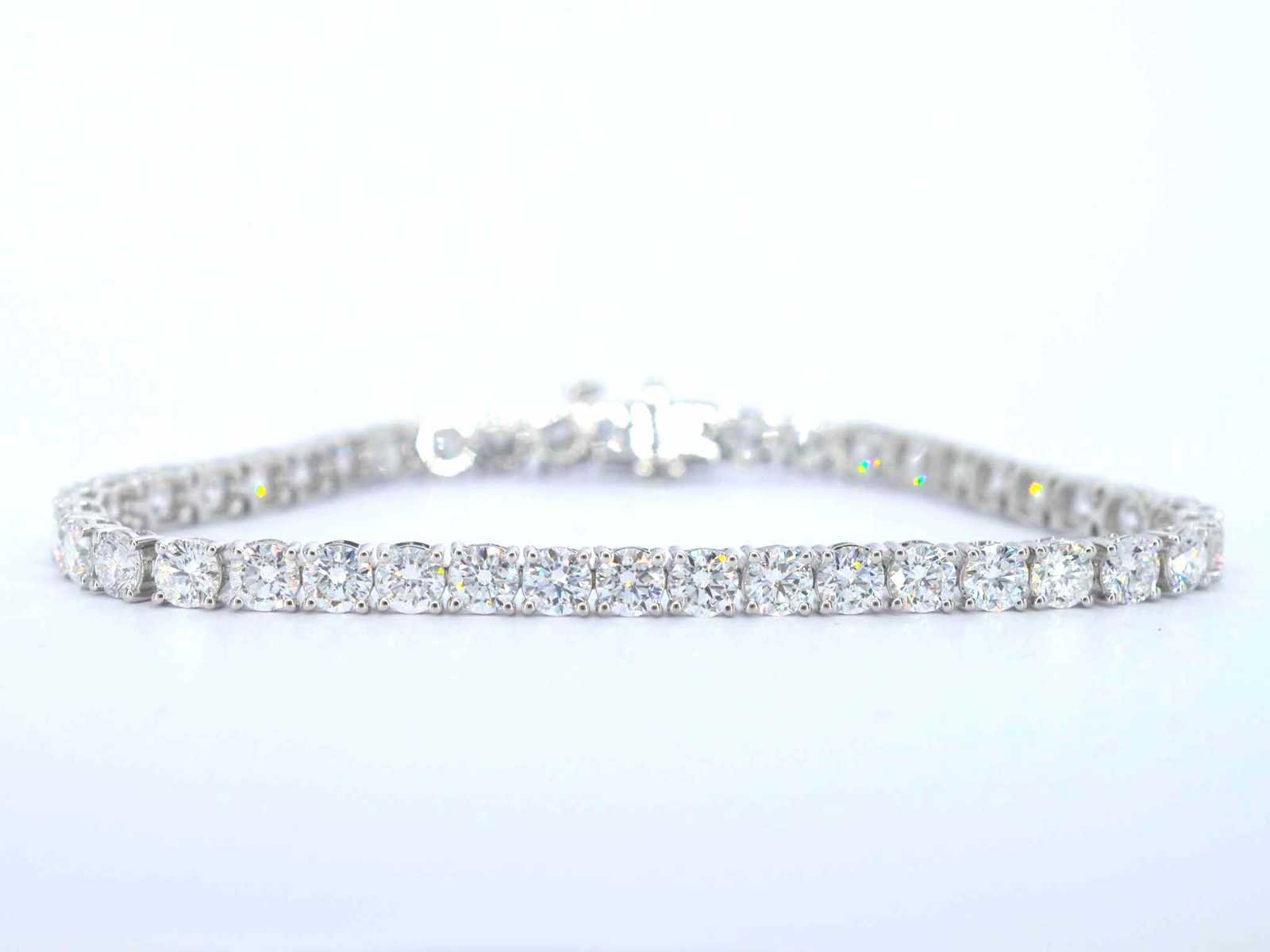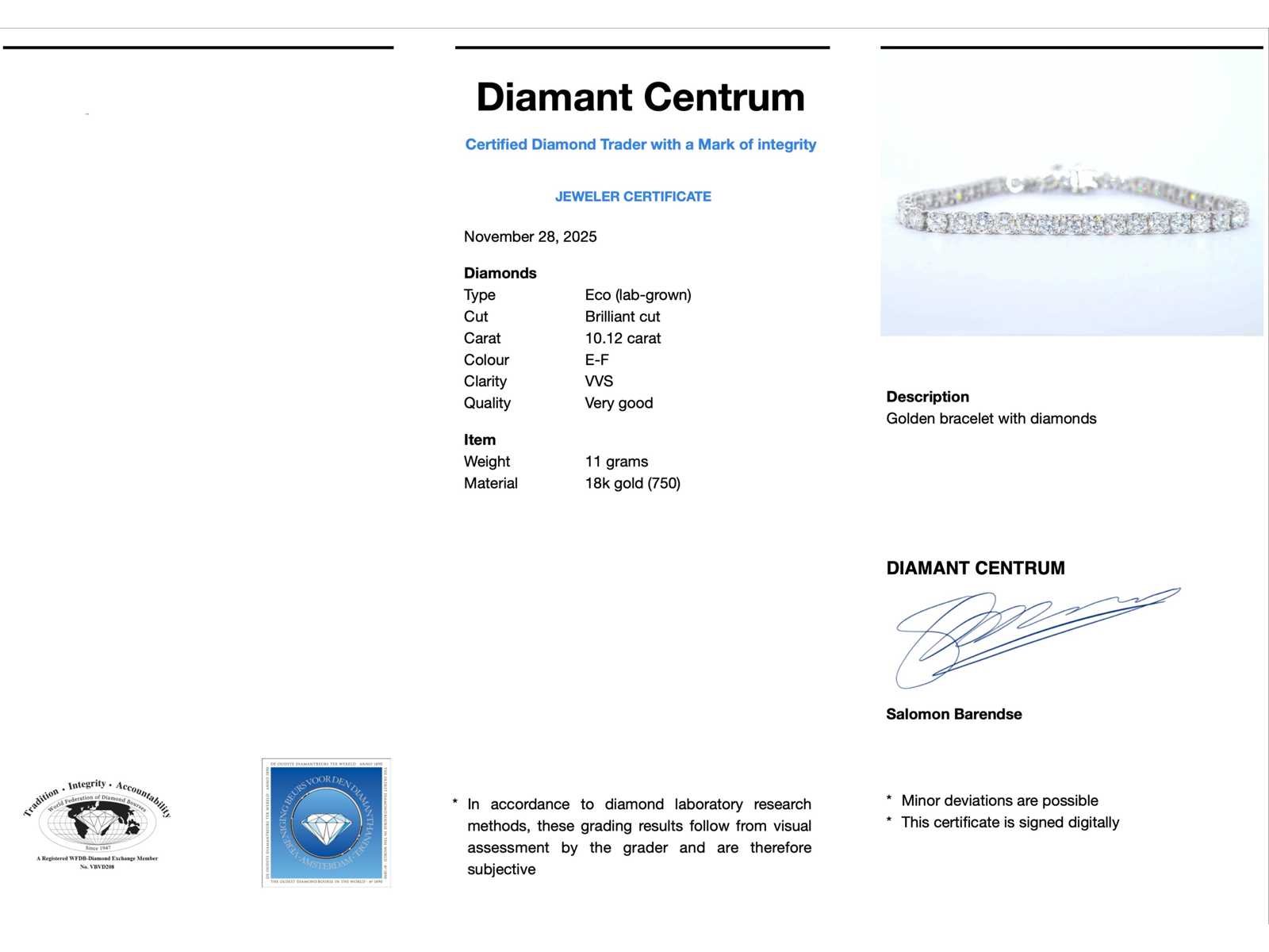Samenvatting van gegevens 18 karaat witgouden tennisarmband met briljant geslepen diamanten 10 carat Diamant: Eco (lab-grown); Slijpvorm: Briljant geslepen; Gewicht (carat): 10.12 carat; Kleur: E-F; Zuiverheid: VVS; Slijpkwaliteit: Excellent; Juweel: Armbanden; Gewicht: 11 gram; Afmetingen/lengte: 17.5 cm; Materiaal: 18k goud (750); Conditie: Nieuw; Verpakking: Luxe sieradendoos; Toelichting: De kwaliteit is overgenomen van het rapport behorend bij item. De waardebepaling is een beoordeling van een gecertificeerde diamantair, gebaseerd op consumentenprijzen.; Consumentenprijs: € 24.000,- Within 14 days Materiaal: Goud Voornaamste diamant: Eco (lab-grown) Kleur diamant: E-F Gewicht diamant: 10.12ct Slijpvorm diamant: Briljant geslepen Slijpkwaliteit diamant: Excellent Zuiverheidsgraad diamant: VVS Totaal gewicht: 11g Keurmerk: 750