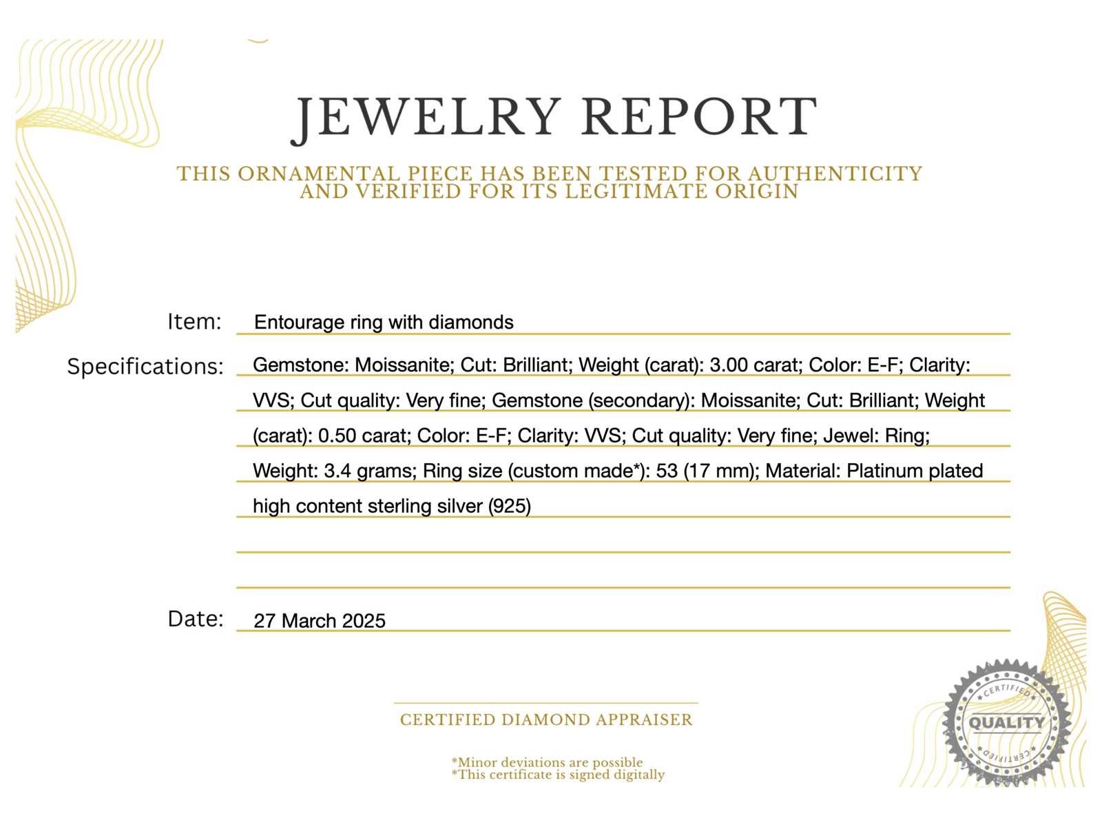 Samenvatting van gegevens Entourage ring met briljanten Edelsteen: Moissaniet; Slijpvorm: Briljant geslepen; Gewicht (carat): 3.00 carat; Kleur: E-F; Zuiverheid: VVS; Slijpkwaliteit: Zeer mooi; Edelsteen (secundair): Moissaniet; Slijpvorm: Briljant; Gewicht (carat): 0.50 carat; Kleur: E-F; Zuiverheid: VVS; Slijpkwaliteit: Zeer mooi; Juweel: Ring; Merk: Harmony; Gewicht: 3.4 gram; Ringmaat (op maat gemaakt*): 53 (17 mm); Materiaal: Geplatineerd hoog gehalte sterling zilver (925); Conditie: Nieuw; Verpakking: Sieradendoos of fluwelen etui; Toelichting: De kwaliteit is overgenomen van het rapport behorend bij item. De waardebepaling is een beoordeling van een gecertificeerde diamantair, gebaseerd op consumentenprijzen.; Extra informatie: Het gemeten gewicht van de edelstenen is volgens diamant maten; Consumentenprijs: € 1.400,- Within 14 days Materiaal: Zilver Edelsteen: Moissaniet Totaal gewicht: 3.4g Keurmerk: 925 Kleur edelsteen: E-F Slijpvorm edelsteen: Briljant geslepen Slijpkwaliteit edelsteen: Zeer mooi Zuiverheidsgraad edelsteen: VVS