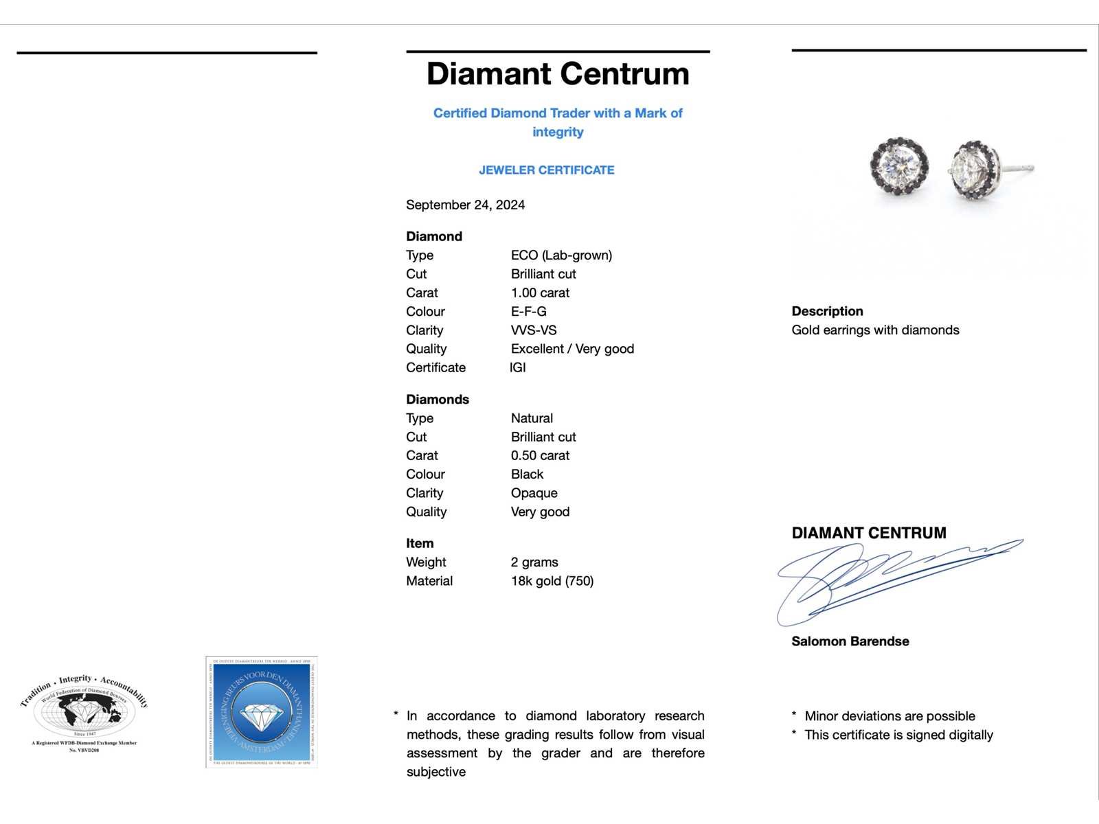 Samenvatting van gegevens Witgouden oorbellen met diamanten van 1.00 carat omringt door zwarte diamanten Diamant: Eco (Lab-grown); Aantal: 2 stuks; Slijpvorm: Briljant geslepen; Gewicht (carat): 1.00 carat; Kleur: E-F-G; Zuiverheid: VVS-VS; Slijpkwaliteit: Excellent / Very good; Certificaat: IGI; Diamant (secundair): Natuurlijk; Aantal diamanten: 32 stuks; Slijpvorm: Briljant geslepen; Gewicht (carat): 0.50 carat; Kleur: Zwart (enhanced); Zuiverheid: Opaak; Slijpkwaliteit: Zeer mooi; Juweel: Oorbellen; Gewicht: 2 gram; Materiaal: 18k goud (750); Conditie: Nieuw; Verpakking: Luxe sieradendoos; Toelichting: De kwaliteit is overgenomen van het rapport behorend bij item. De waardebepaling is een beoordeling van een gecertificeerde diamantair, gebaseerd op consumentenprijzen.; Consumentenprijs: € 6.175,- Within 14 days Materiaal: Goud Voornaamste diamant: Eco (Lab-grown) Kleur diamant: E-F-G Gewicht diamant: 1.00ct Slijpvorm diamant: Briljant geslepen Slijpkwaliteit diamant: Excellent / Very good Zuiverheidsgraad diamant: VVS-VS Totaal gewicht: 2g Keurmerk: 750 Certificaat: IGI
