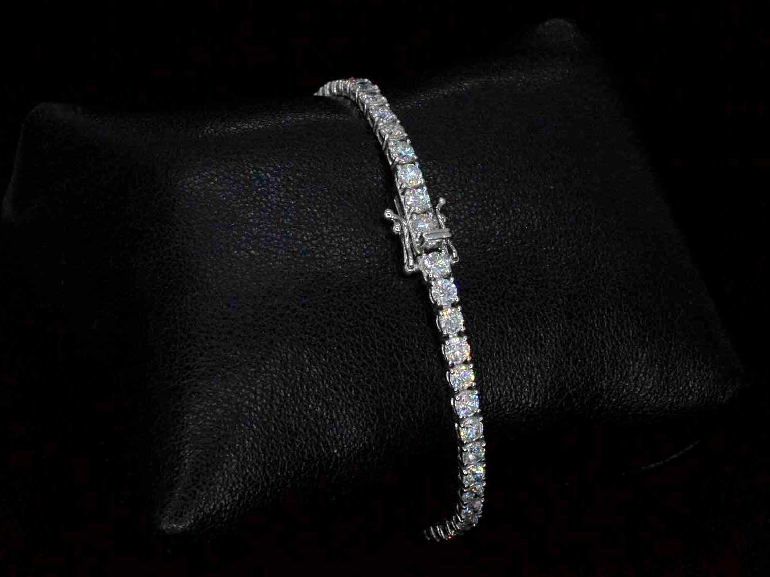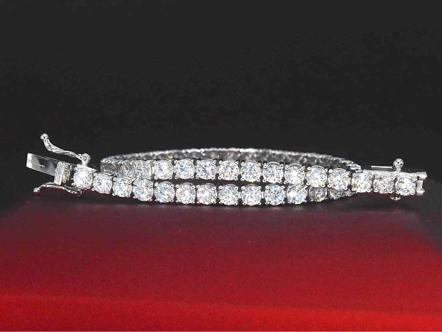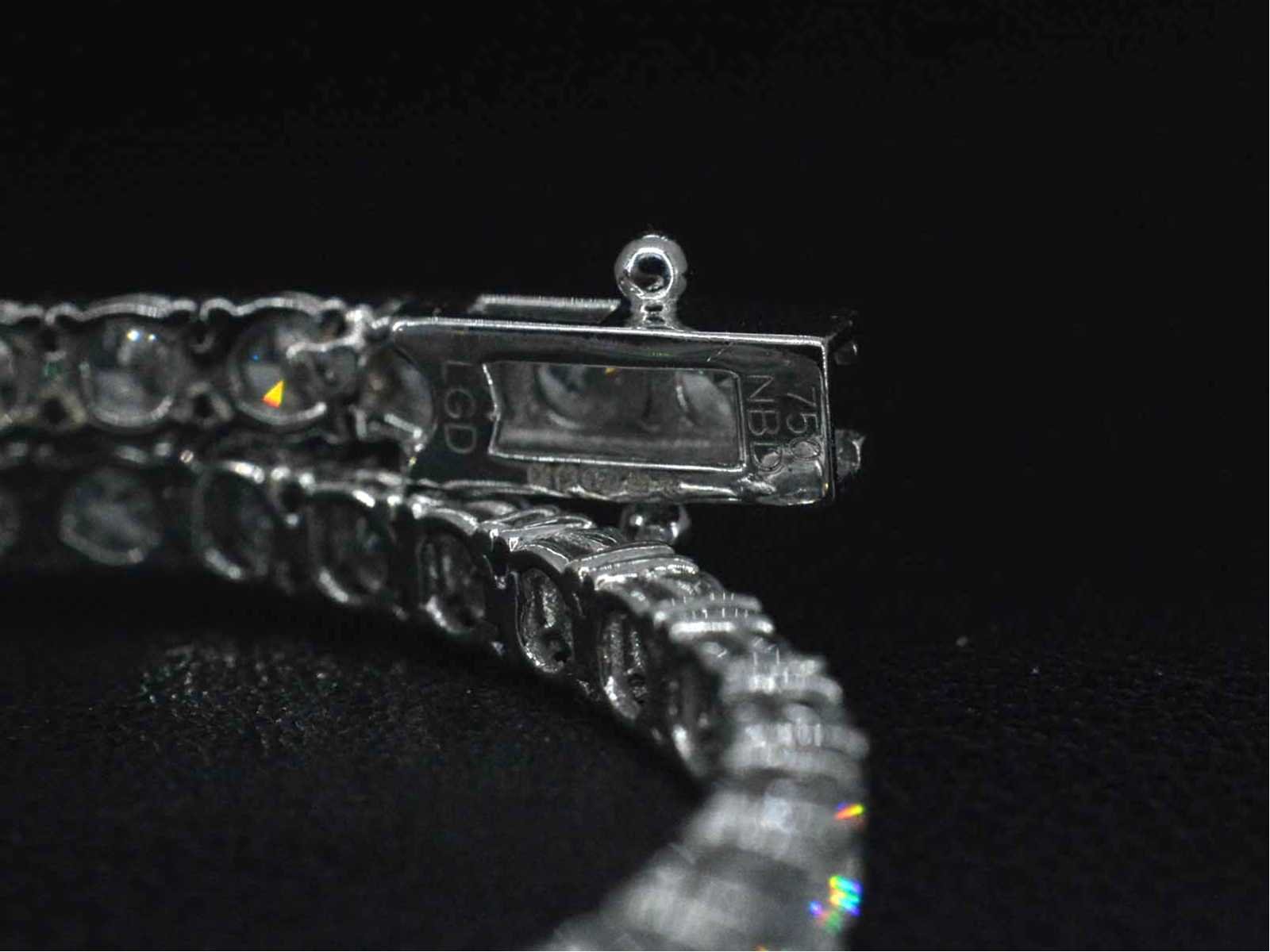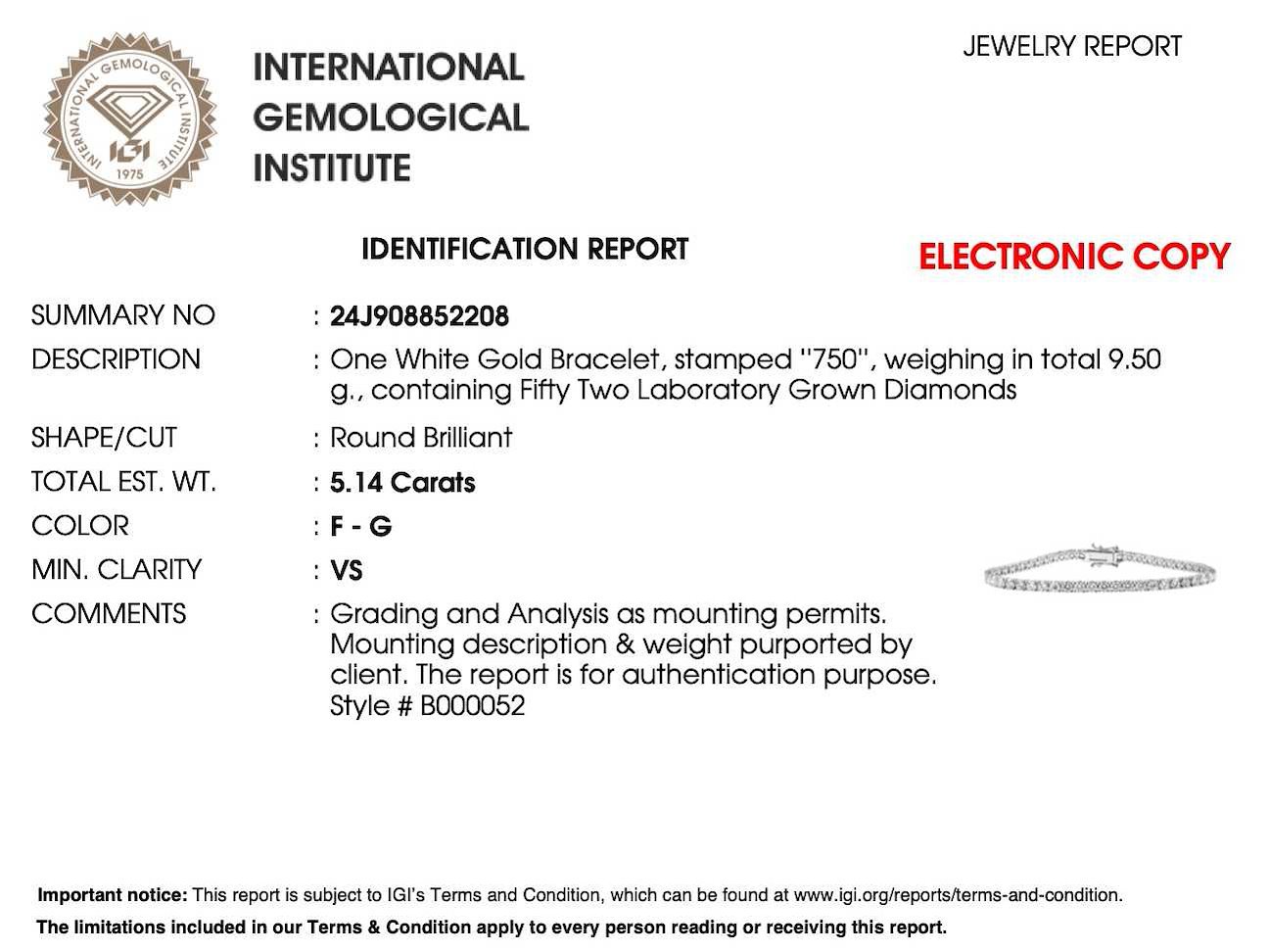 Samenvatting van gegevens Witgouden tennisarmband met briljant geslepen diamanten van 5.14 carat Diamant: Eco (lab-grown); Aantal: 52 stuks; Slijpvorm: Briljant geslepen; Gewicht (carat): 5.14 carat; Kleur: F-G; Zuiverheid: VS; Slijpkwaliteit: Very good; Certificaat: IGI; Certificaat nummer: 24J908852208; Juweel: Armband; Gewicht: 9 gram; Afmetingen/lengte: 17.5 cm; Materiaal: 18K goud (750); Conditie: Nieuw; Verpakking: Luxe sieradendoos; Toelichting: De kwaliteit is overgenomen van het rapport behorend bij item. De waardebepaling is een beoordeling van een gecertificeerde diamantair, gebaseerd op consumentenprijzen.; Consumentenprijs: € 20.400,- Within 14 days Materiaal: Goud Voornaamste diamant: Eco (lab-grown) Kleur diamant: F-G Gewicht diamant: 5.14ct Slijpvorm diamant: Briljant geslepen Slijpkwaliteit diamant: Very good Zuiverheidsgraad diamant: VS Totaal gewicht: 9g Certificaat: IGI Keurmerk: 750