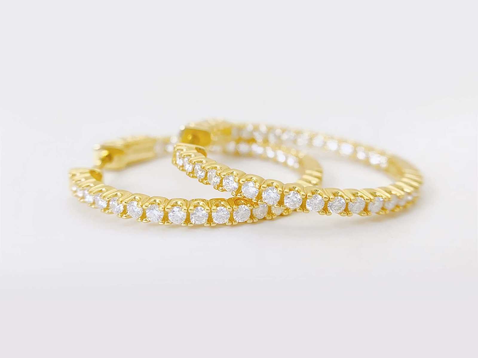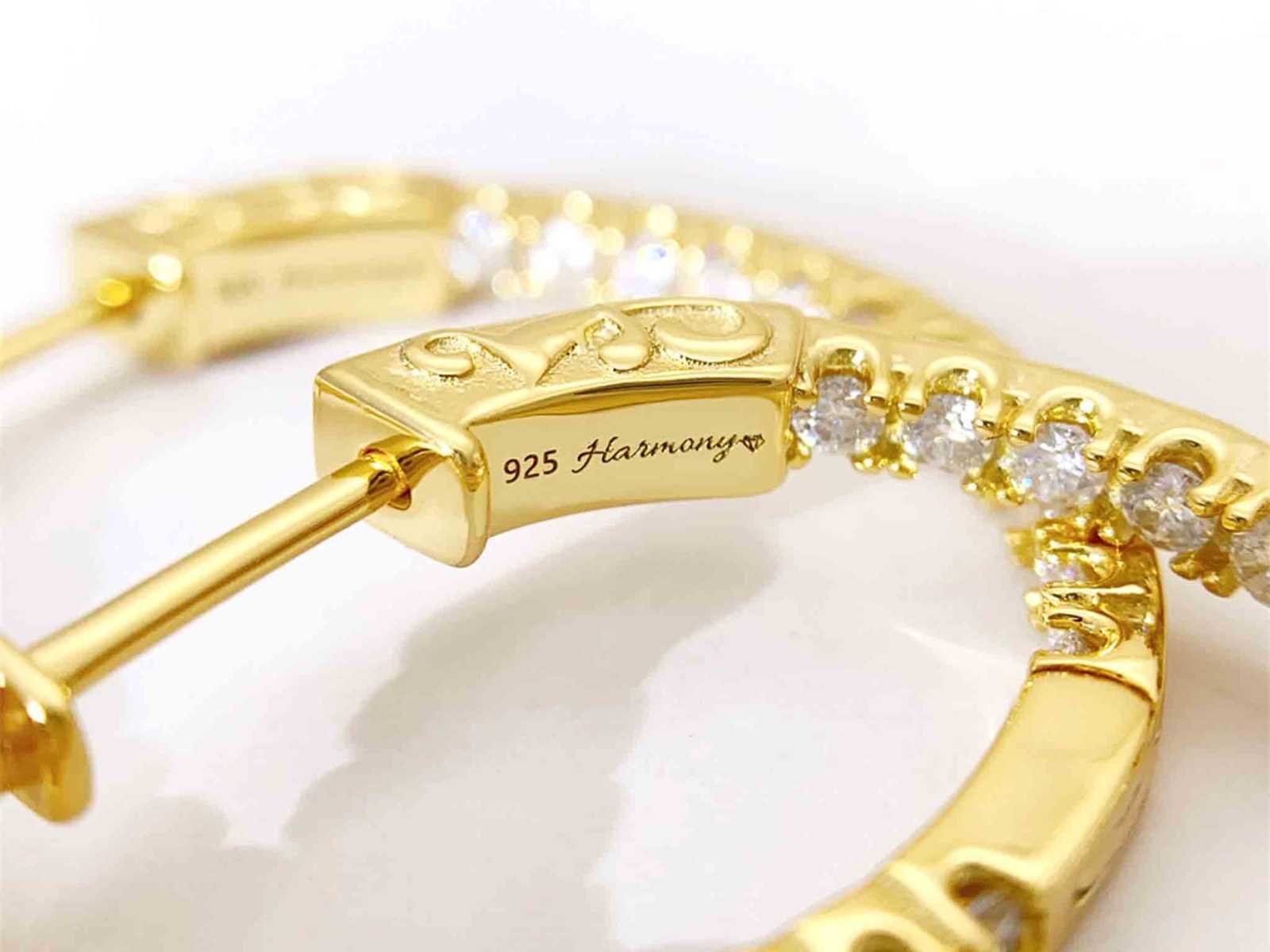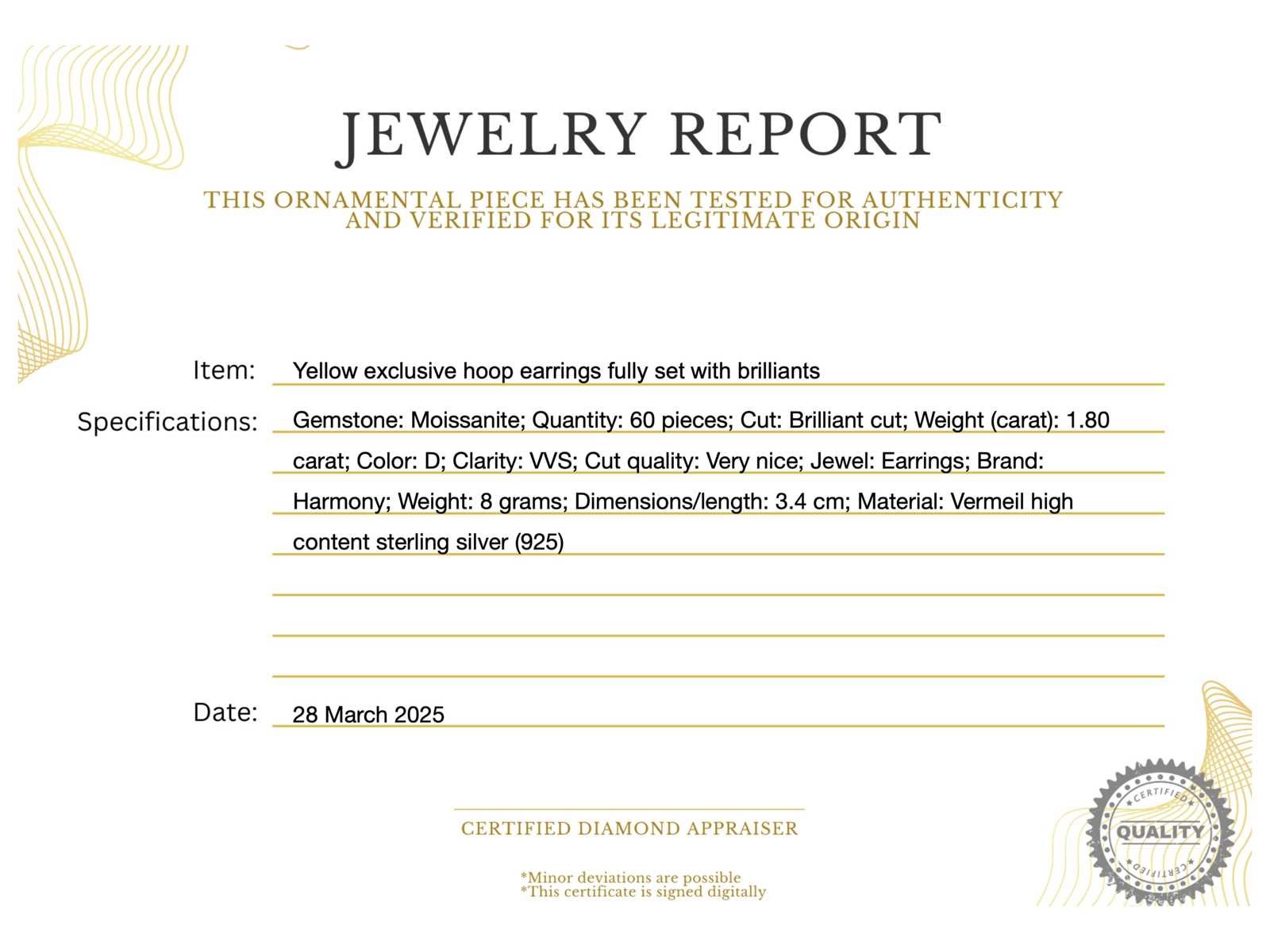 Samenvatting van gegevens Gele exclusieve creolen volledig gezet met briljanten Edelsteen: Moissaniet; Aantal: 60 stuks; Slijpvorm: Briljant geslepen; Gewicht (carat): 1.80 carat; Kleur: D; Zuiverheid: VVS; Slijpkwaliteit: Zeer mooi; Juweel: Oorbellen; Merk: Harmony; Gewicht: 8 gram; Afmetingen/lengte: 3.4 cm; Materiaal: Vermeil hoog gehalte sterling zilver (925); Conditie: Nieuw; Verpakking: Sieradendoos of fluwelen etui; Toelichting: De kwaliteit is overgenomen van het rapport behorend bij item. De waardebepaling is een beoordeling van een gecertificeerde diamantair, gebaseerd op consumentenprijzen..; Extra informatie: Het gemeten gewicht van de edelstenen is volgens diamant maten; Consumentenprijs: € 1.000,- Within 14 days Materiaal: Zilver Edelsteen: Moissaniet Kleur edelsteen: D Slijpvorm edelsteen: Briljant geslepen Slijpkwaliteit edelsteen: Zeer mooi Zuiverheidsgraad edelsteen: VVS Totaal gewicht: 8g Keurmerk: 925