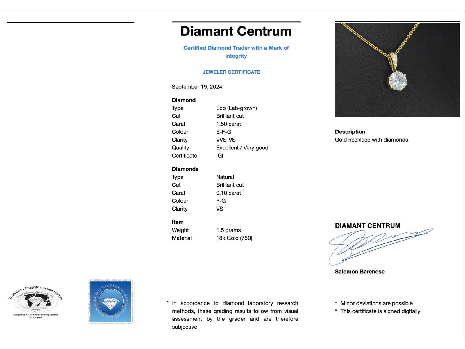 Samenvatting van gegevens Gouden solitaire hanger met een diamant van 1.50 carat Diamant: Eco (Lab-grown); Aantal: 1 stuk; Slijpvorm: Briljant geslepen; Gewicht (carat): 1.50 carat; Kleur: E-F-G; Zuiverheid: VVS-VS; Slijpkwaliteit: Excellent / Very good; Certificaat: IGI; Diamant (secundair): Natuurlijke diamanten; Aantal diamanten: 5 stuks; Slijpvorm: Briljant geslepen; Gewicht (carat): 0.10 carat; Kleur: F-G; Zuiverheid: VS; Slijpkwaliteit: Zeer mooi; Juweel: Hanger (Excl. Ketting); Gewicht: 1.5 gram; Materiaal: 18K goud (750); Conditie: Nieuw; Verpakking: Luxe sieradendoos; Toelichting: De kwaliteit is overgenomen van het rapport behorend bij item. De waardebepaling is een beoordeling van een gecertificeerde diamantair, gebaseerd op consumentenprijzen.; Consumentenprijs: € 6.064,- Within 14 days Materiaal: Goud Voornaamste diamant: Eco (Lab-grown) Kleur diamant: E-F-G Gewicht diamant: 1.50ct Slijpvorm diamant: Briljant geslepen Slijpkwaliteit diamant: Excellent / Very good Zuiverheidsgraad diamant: VVS-VS Totaal gewicht: 1.5g Keurmerk: 750 Certificaat: IGI