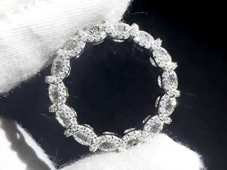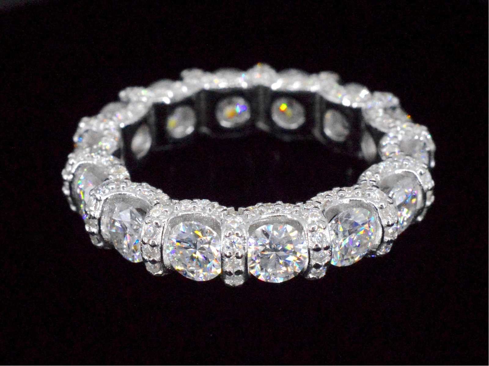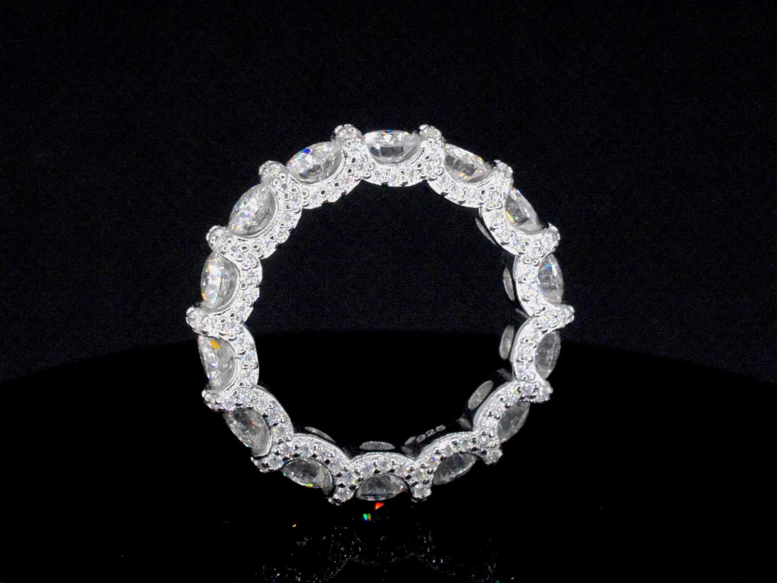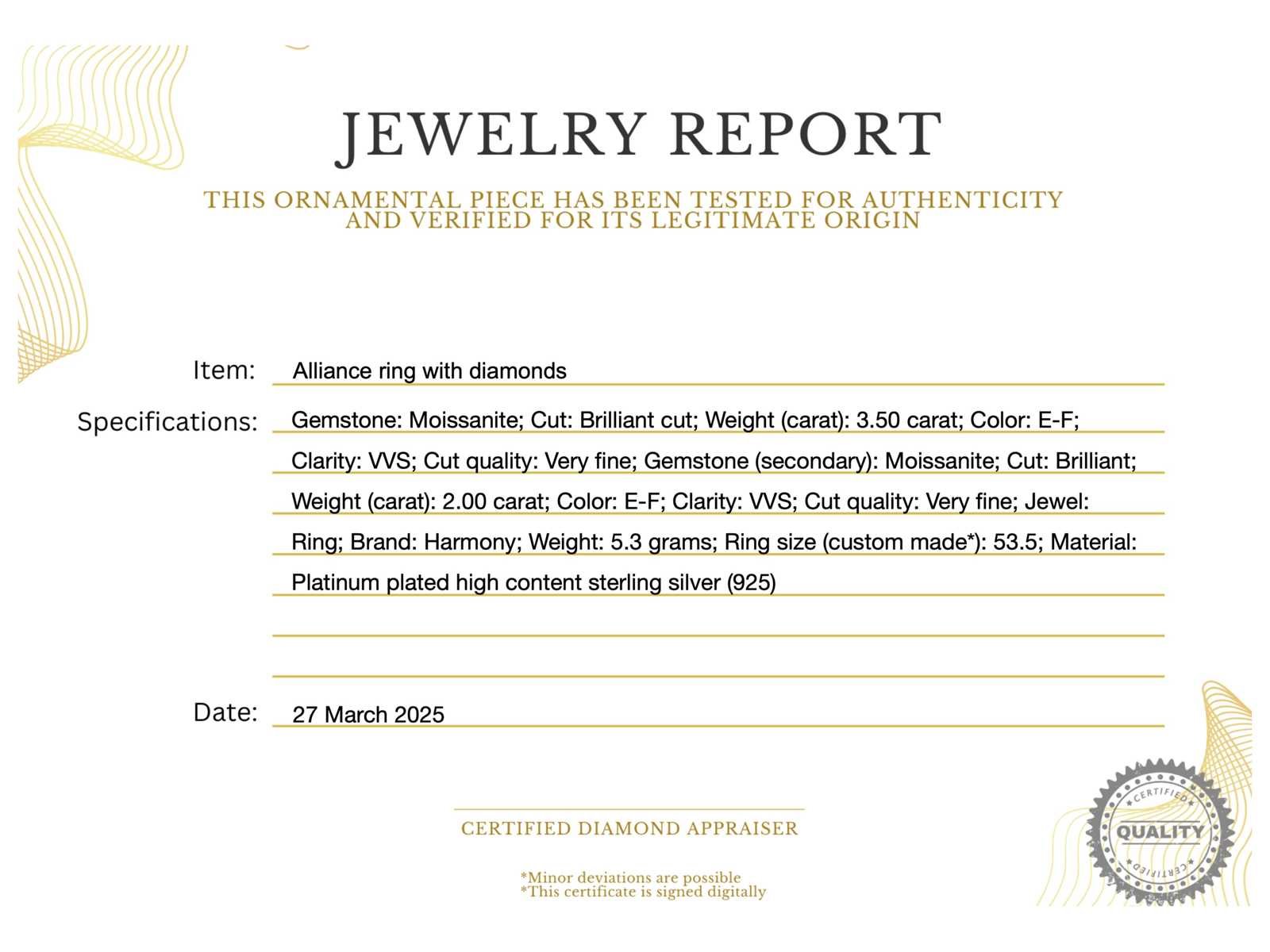 Samenvatting van gegevens Alliance ring met briljanten Edelsteen: Moissaniet; Slijpvorm: Briljant geslepen; Gewicht (carat): 3.50 carat; Kleur: E-F; Zuiverheid: VVS; Slijpkwaliteit: Zeer mooi; Edelsteen (secundair): Moissaniet; Slijpvorm: Briljant; Gewicht (carat): 2.00 carat; Kleur: E-F; Zuiverheid: VVS; Slijpkwaliteit: Zeer mooi; Juweel: Ring; Merk: Harmony; Gewicht: 5.3 gram; Ringmaat (op maat gemaakt*): 54 (17.25 mm); Materiaal: Geplatineerd hoog gehalte sterling zilver (925); Conditie: Nieuw; Verpakking: Sieradendoos of fluwelen etui; Toelichting: De kwaliteit is overgenomen van het rapport behorend bij item. De waardebepaling is een beoordeling van een gecertificeerde diamantair, gebaseerd op consumentenprijzen.; Extra informatie: Het gemeten gewicht van de edelstenen is volgens diamant maten; Consumentenprijs: € 1.000,- Within 14 days Materiaal: Zilver Edelsteen: Moissaniet Totaal gewicht: 5.3g Keurmerk: 925 Kleur edelsteen: E-F Slijpvorm edelsteen: Briljant geslepen Slijpkwaliteit edelsteen: Zeer mooi Zuiverheidsgraad edelsteen: VVS
