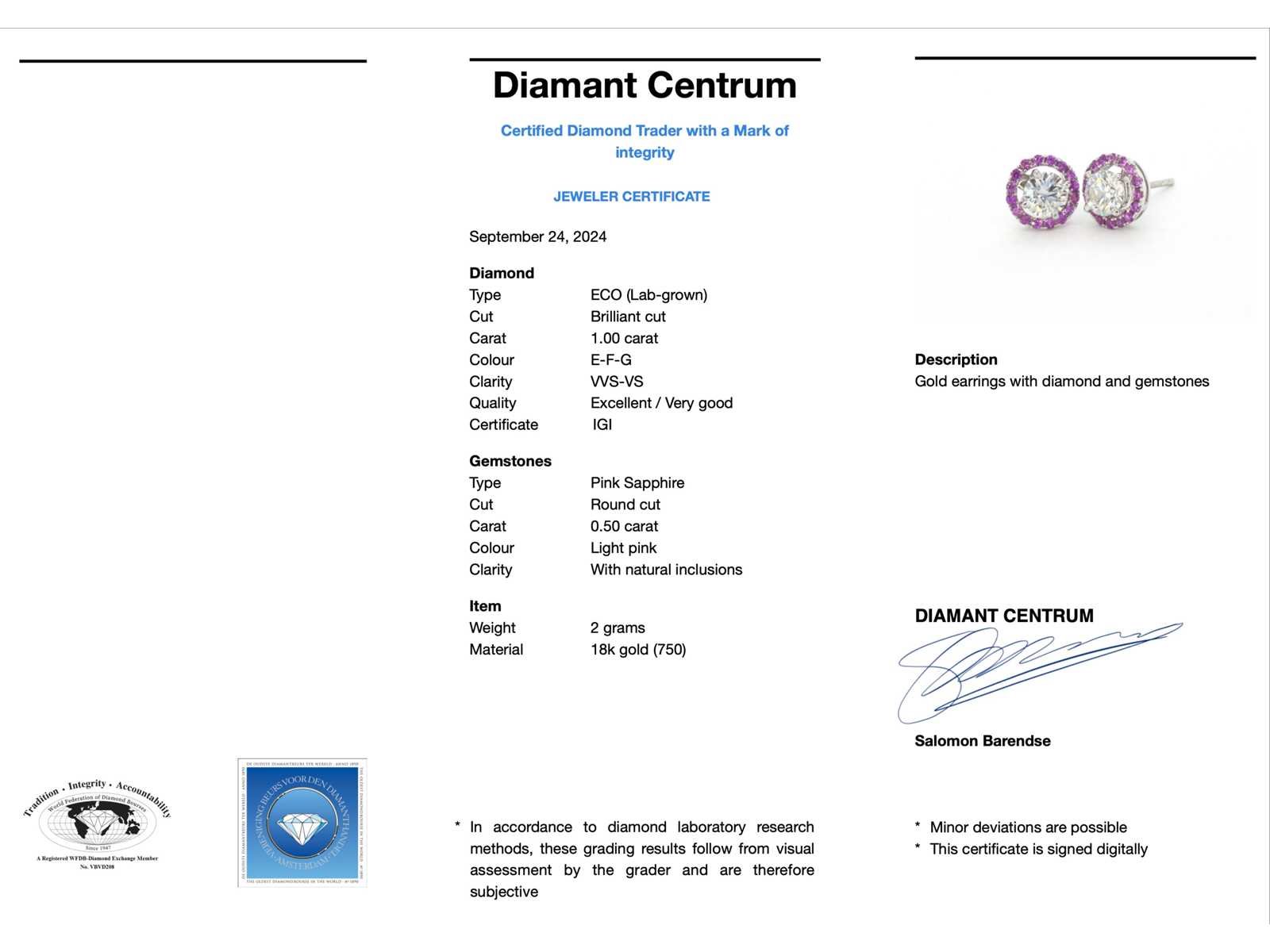 Samenvatting van gegevens Witgouden oorbellen met diamanten en roze saffieren Diamant: Eco (Lab-grown); Aantal: 2 stuks; Slijpvorm: Briljant geslepen; Gewicht (carat): 1.00 carat; Kleur: E-F-G; Zuiverheid: VVS-VS; Slijpkwaliteit: Excellent / Very good; Certificaat: IGI; Edelsteen: Roze saffier; Slijpvorm: Rond geslepen; Gewicht (carat): 0.50 carat; Kleur: Licht roze; Zuiverheid: Met natuurlijke insluitsels; Juweel: Oorbellen; Gewicht: 2 gram; Materiaal: 18k goud (750); Conditie: Nieuw; Verpakking: Luxe sieradendoos; Toelichting: De kwaliteit is overgenomen van het rapport behorend bij item. De waardebepaling is een beoordeling van een gecertificeerde diamantair, gebaseerd op consumentenprijzen.; Consumentenprijs: € 6.175,- Within 14 days Materiaal: Goud Voornaamste diamant: Eco (Lab-grown) Kleur diamant: E-F-G Gewicht diamant: 1.00ct Slijpvorm diamant: Briljant geslepen Slijpkwaliteit diamant: Excellent / Very good Zuiverheidsgraad diamant: VVS-VS Edelsteen: Roze saffier Kleur edelsteen: Licht roze Slijpvorm edelsteen: Rond geslepen Zuiverheidsgraad edelsteen: Met natuurlijke insluitsels Totaal gewicht: 2g Keurmerk: 750 Certificaat: IGI