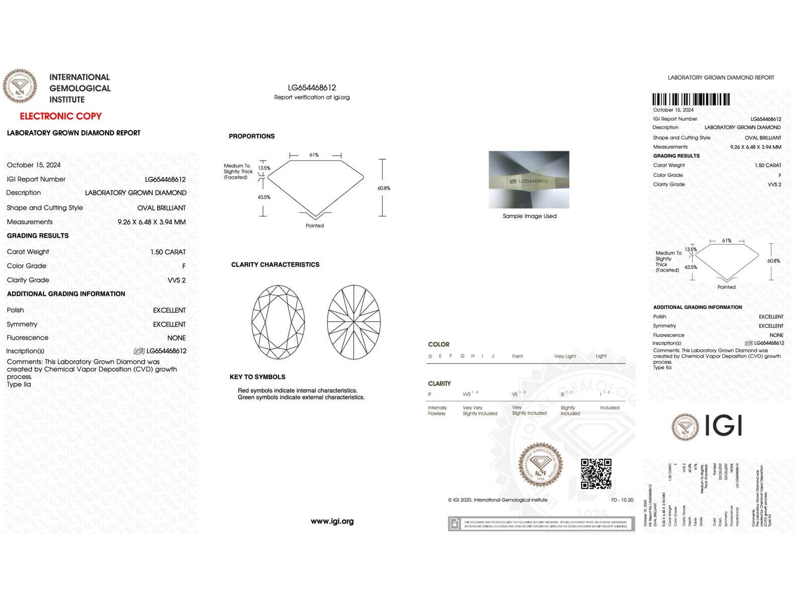 Samenvatting van gegevens Diamant - 1.50 carat Ovaal geslepen diamant (gecertificeerd) Diamant: Eco (lab-grown); Aantal: 1 stuk; Slijpvorm: Ovaal geslepen; Gewicht (carat): 1.50 carat ; Kleur: F; Zuiverheid: VVS2; Certificaat: IGI; Certificaat nummer: LG654468612; Conditie: Nieuw; Verpakking: Komt met een Edelsteendoos ; Toelichting: De kwaliteit is overgenomen van het rapport behorend bij item. De waardebepaling is een beoordeling van een gecertificeerde diamantair, gebaseerd op consumentenprijzen.; Consumentenprijs: € 5.063,- Within 14 days Voornaamste diamant: Eco (lab-grown) Kleur diamant: F Gewicht diamant: 1.50ct Slijpvorm diamant: Ovaal geslepen Zuiverheidsgraad diamant: VVS2 Certificaat: IGI