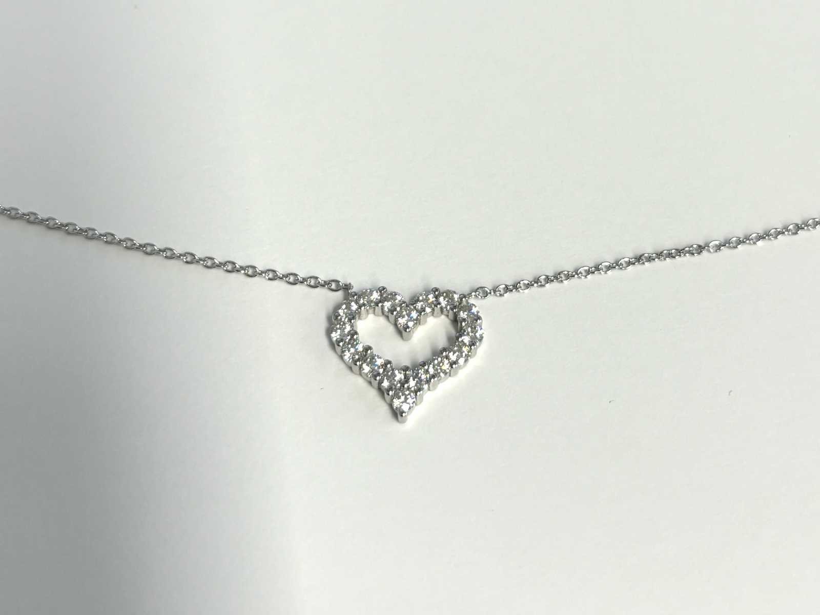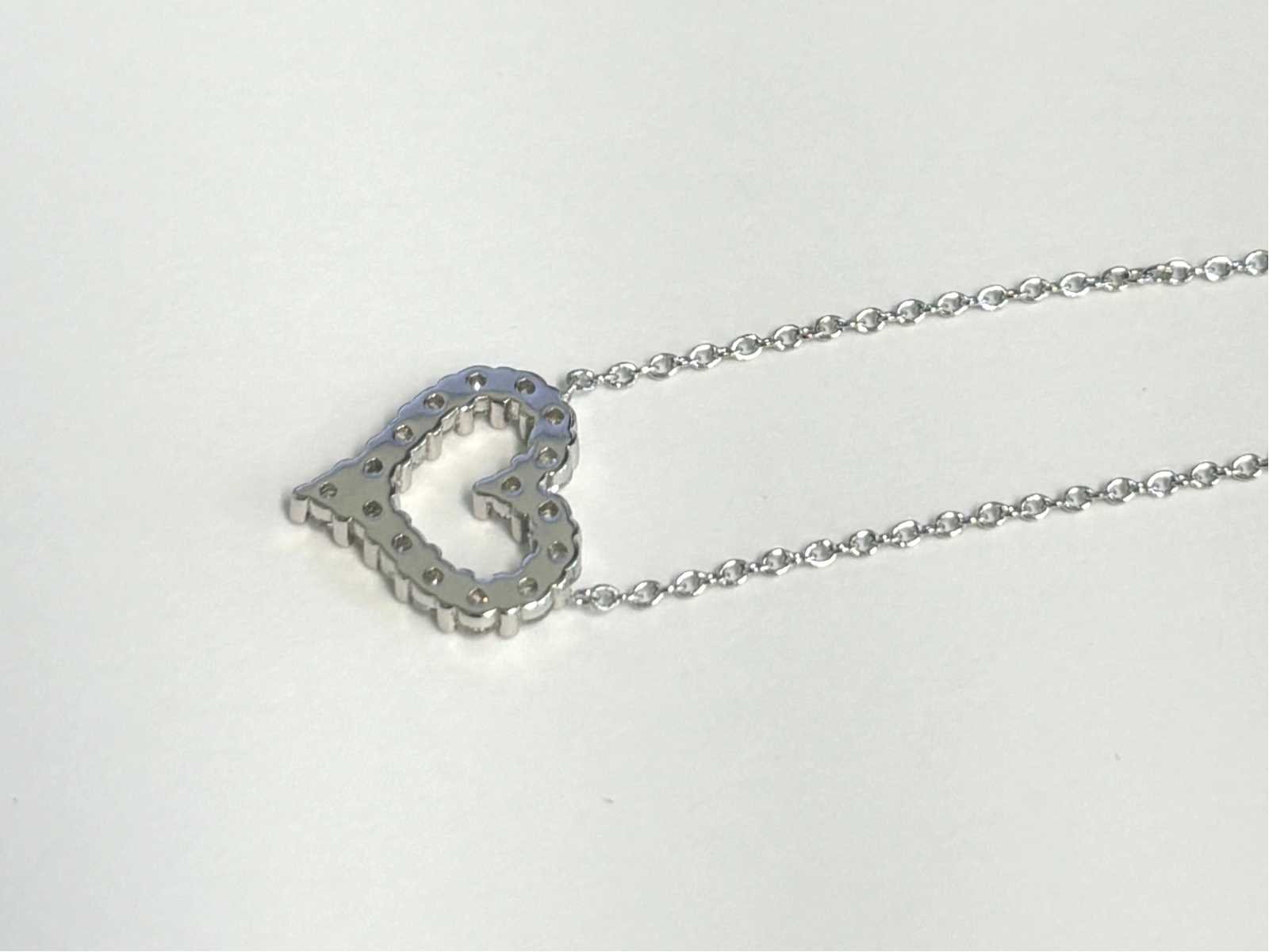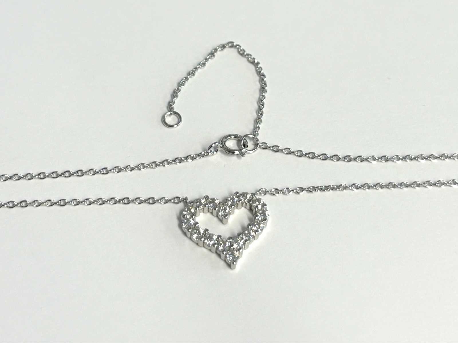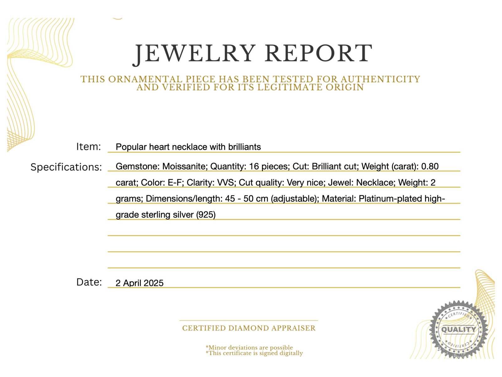 Samenvatting van gegevens Gewilde hart ketting met briljanten Edelsteen: Moissaniet; Aantal: 16 stuks; Slijpvorm: Briljant geslepen; Gewicht (carat): 0.80 carat; Kleur: E-F; Zuiverheid: VVS; Slijpkwaliteit: Zeer mooi; Juweel: Halsketting; Merk: Harmony; Gewicht: 2 gram; Afmetingen/lengte: 45 - 50 cm (verstelbaar); Materiaal: Geplatineerd hoog gehalte sterling zilver (925); Conditie: Nieuw; Verpakking: Sieradendoos of fluwelen etui; Toelichting: De kwaliteit is overgenomen van het rapport behorend bij item. De waardebepaling is een beoordeling van een gecertificeerde diamantair, gebaseerd op consumentenprijzen.; Extra informatie: Het gemeten gewicht van de edelstenen is volgens diamant maten; Consumentenprijs: € 1.500,- Within 14 days Materiaal: Zilver Edelsteen: Moissaniet Kleur edelsteen: E-F Totaal gewicht: 2g Keurmerk: 925 Slijpkwaliteit edelsteen: Zeer mooi Slijpvorm edelsteen: Briljant geslepen Zuiverheidsgraad edelsteen: VVS