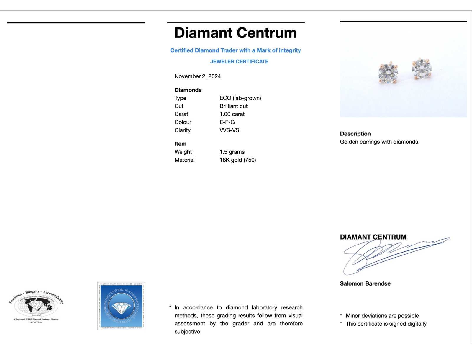 Samenvatting van gegevens Rosegouden solitaire diamanten oorbellen van 1.00 carat Diamant: Eco (Lab-grown); Aantal: 2 stuks; Slijpvorm: Briljant geslepen; Gewicht (carat): 1.00 carat; Kleur: E-F-G; Zuiverheid: VVS-VS; Slijpkwaliteit: Excellent / Very good; Certificaat: IGI; Juweel: Oorbellen; Gewicht: 1.5 gram; Materiaal: 18K goud (750); Conditie: Nieuw; Verpakking: Luxe sieradendoos; Toelichting: De kwaliteit is overgenomen van het rapport behorend bij item. De waardebepaling is een beoordeling van een gecertificeerde diamantair, gebaseerd op consumentenprijzen.; Consumentenprijs: € 4.663,- Within 14 days Materiaal: Goud Voornaamste diamant: Eco (Lab-grown) Kleur diamant: E-F-G Gewicht diamant: 1.00ct Slijpvorm diamant: Briljant geslepen Slijpkwaliteit diamant: Excellent / Very good Zuiverheidsgraad diamant: VVS-VS Totaal gewicht: 1.5g Keurmerk: 750 Certificaat: IGI