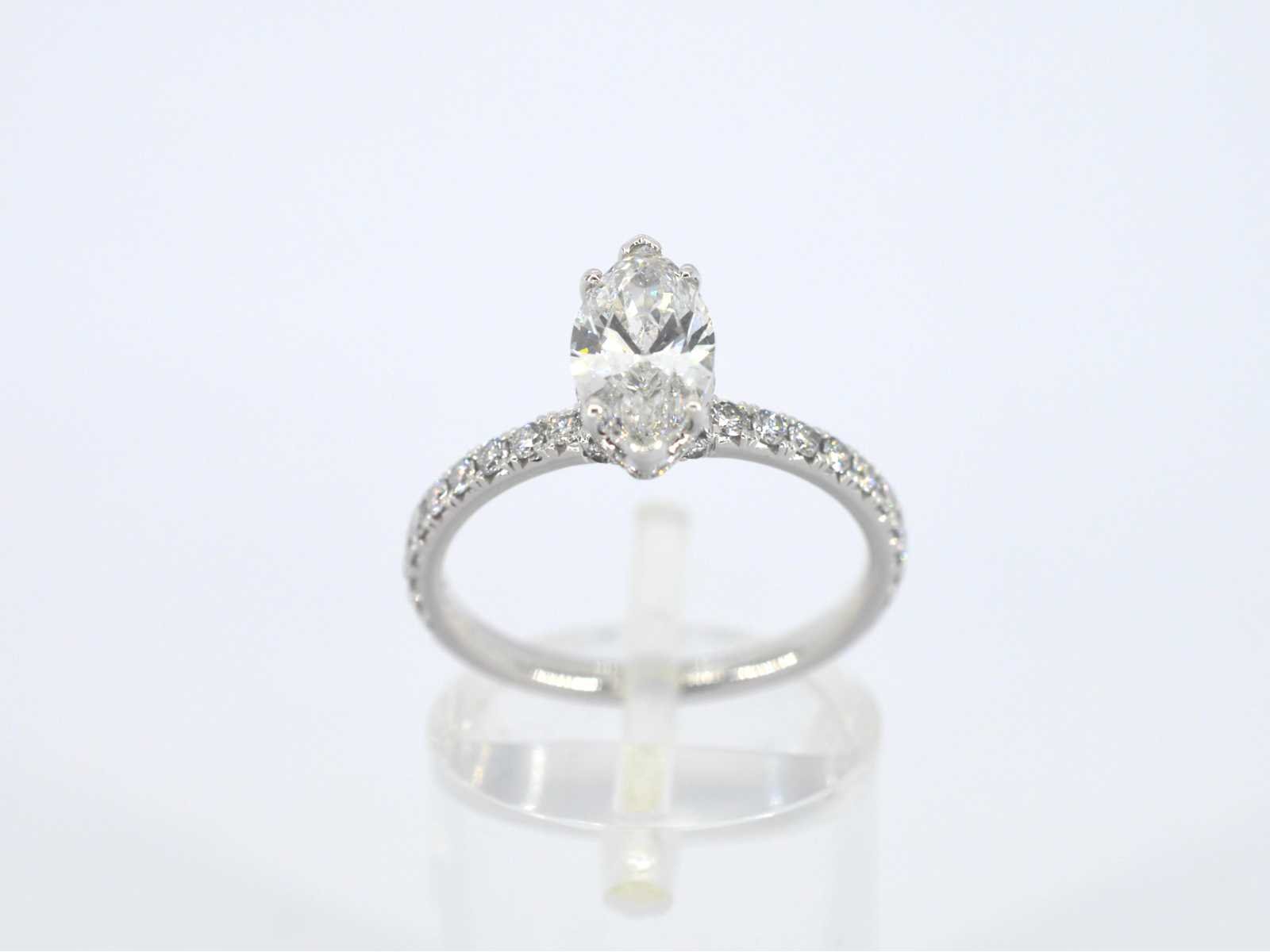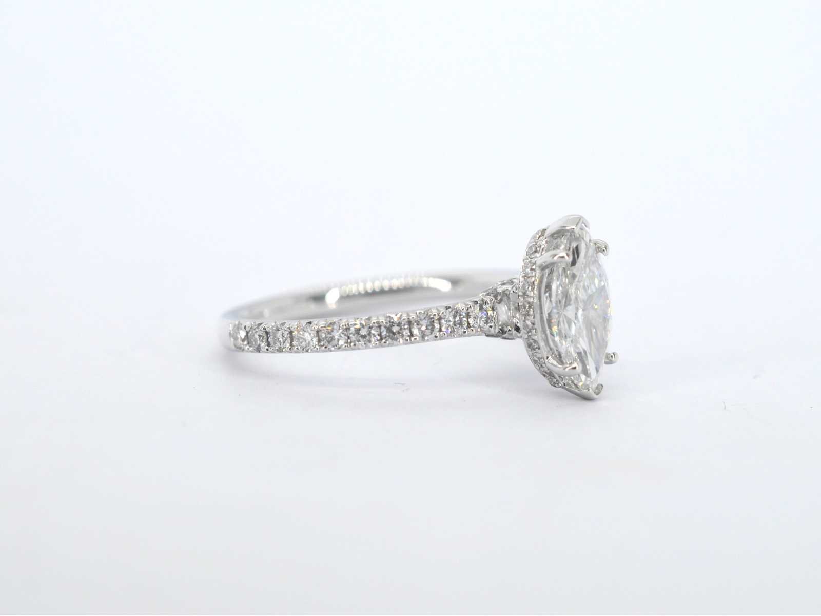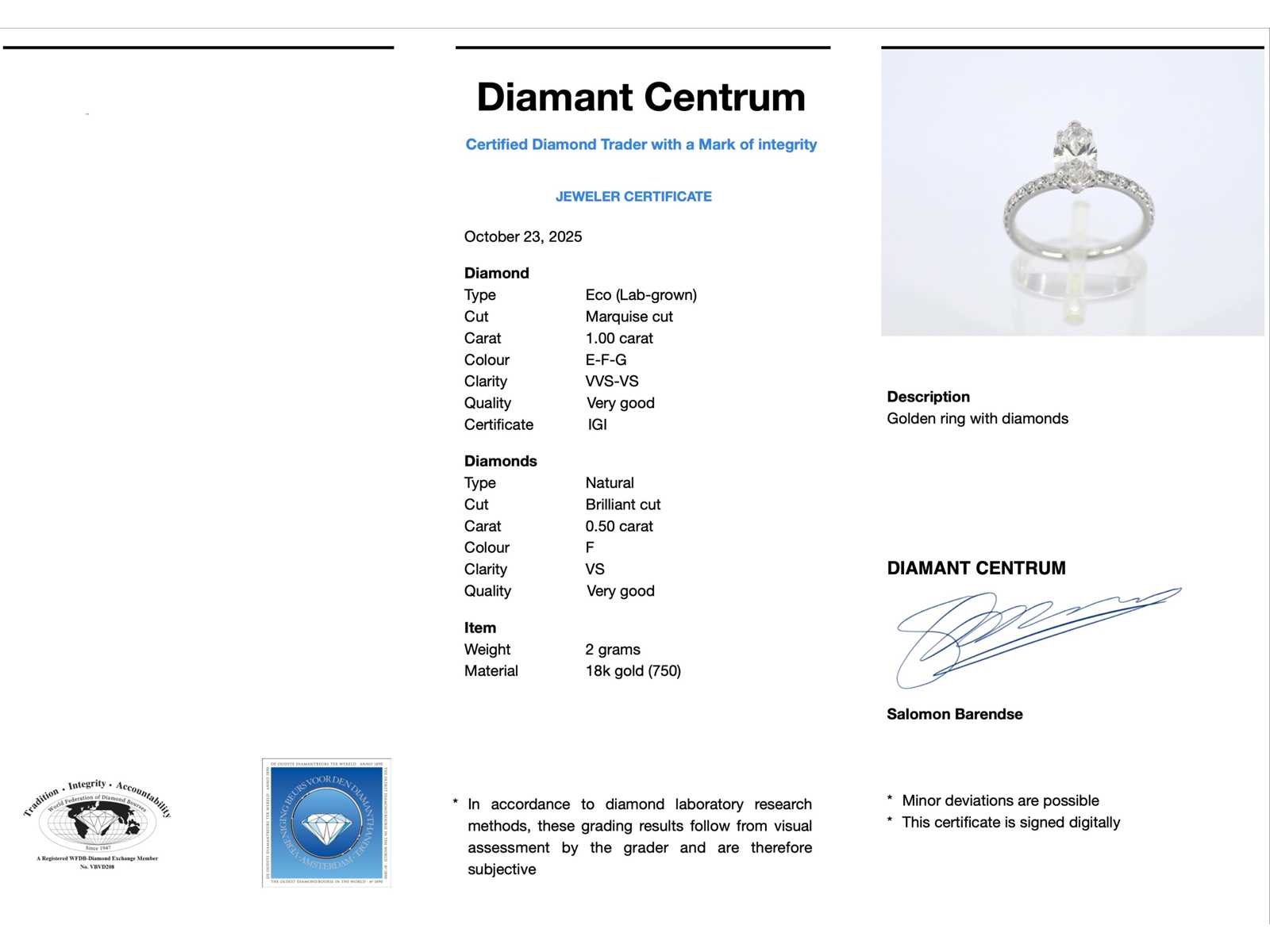 Samenvatting van gegevens Witgouden solitaire ring met een marquise diamant van 1.00 carat met hidden Halo Diamant: Eco (Lab-grown); Aantal: 1 stuk; Slijpvorm: Marquise geslepen; Gewicht (carat): 1.00 carat; Kleur: E-F-G; Zuiverheid: VVS-VS; Slijpkwaliteit: Excellent / Very good; Certificaat: IGI; Diamant (secundair): Natuurlijk; Aantal diamanten: 52 stuks; Slijpvorm: Briljant geslepen; Gewicht (carat): 0.50 carat; Kleur: F; Zuiverheid: VS; Slijpkwaliteit: Zeer mooi; Juweel: Ring; Gewicht: 2 gram; Ringmaat (op maat gemaakt*): 53 (17 mm); Materiaal: 18K goud (750); Conditie: Nieuw; Verpakking: Luxe sieradendoos; Toelichting: De kwaliteit is overgenomen van het rapport behorend bij item. De waardebepaling is een beoordeling van een gecertificeerde diamantair, gebaseerd op consumentenprijzen.; Consumentenprijs: € 7.925,- Within 14 days Materiaal: Goud Voornaamste diamant: Eco (Lab-grown) Gewicht diamant: 1.00ct Totaal gewicht: 2g Keurmerk: 750 Certificaat: IGI Kleur diamant: E-F-G Slijpvorm diamant: Marquise geslepen Slijpkwaliteit diamant: Excellent / Very good Zuiverheidsgraad diamant: VVS-VS
