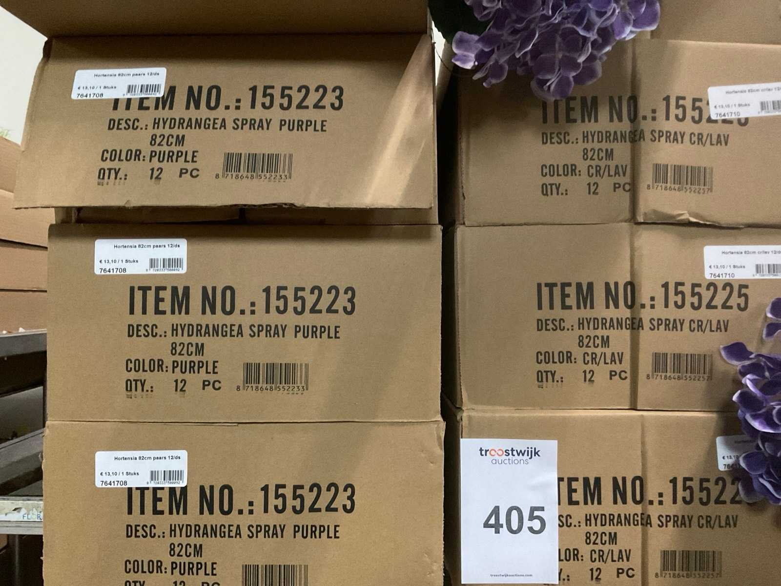 Inhoud kar, diverse soorten Silk_Ka kunstbloemen, o.a. hortensia, violen, bloesem, scabiosa, diverse kleuren, kar niet inbegrepen