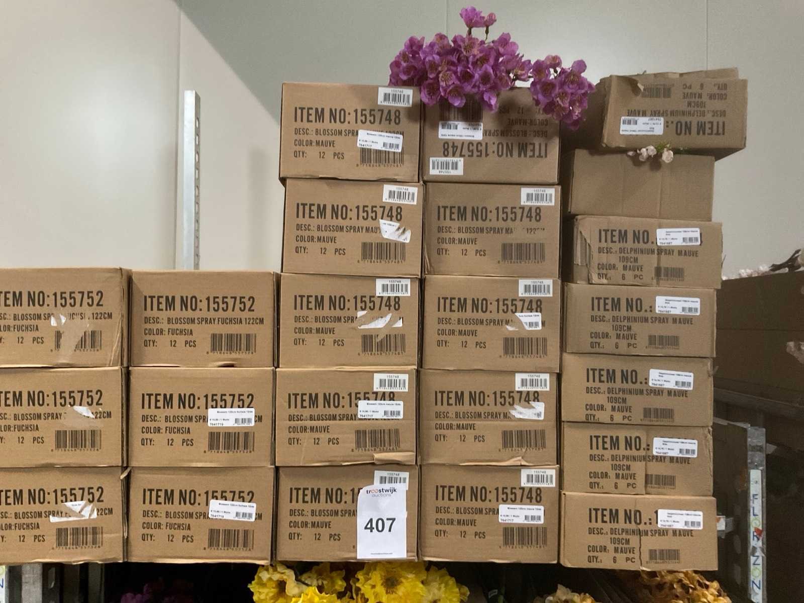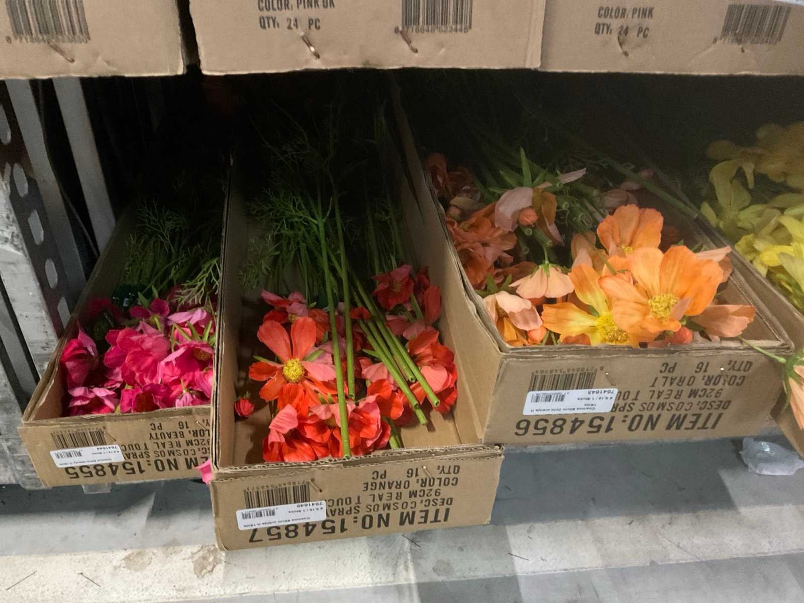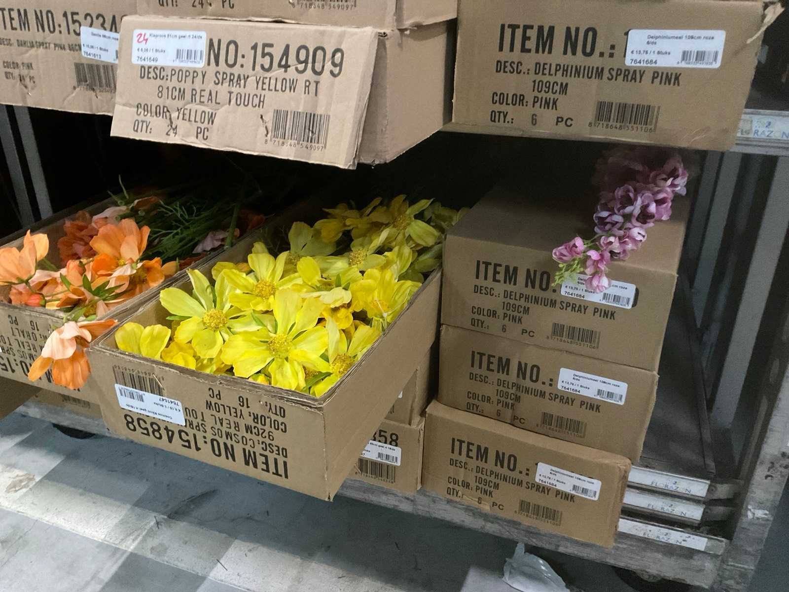 Inhoud kar, diverse soorten Silk_Ka kunstbloemen, o.a. bloesem, klaprozen, dahlia’s, delphinium, cosmos, diverse kleuren, kar niet inbegrepen