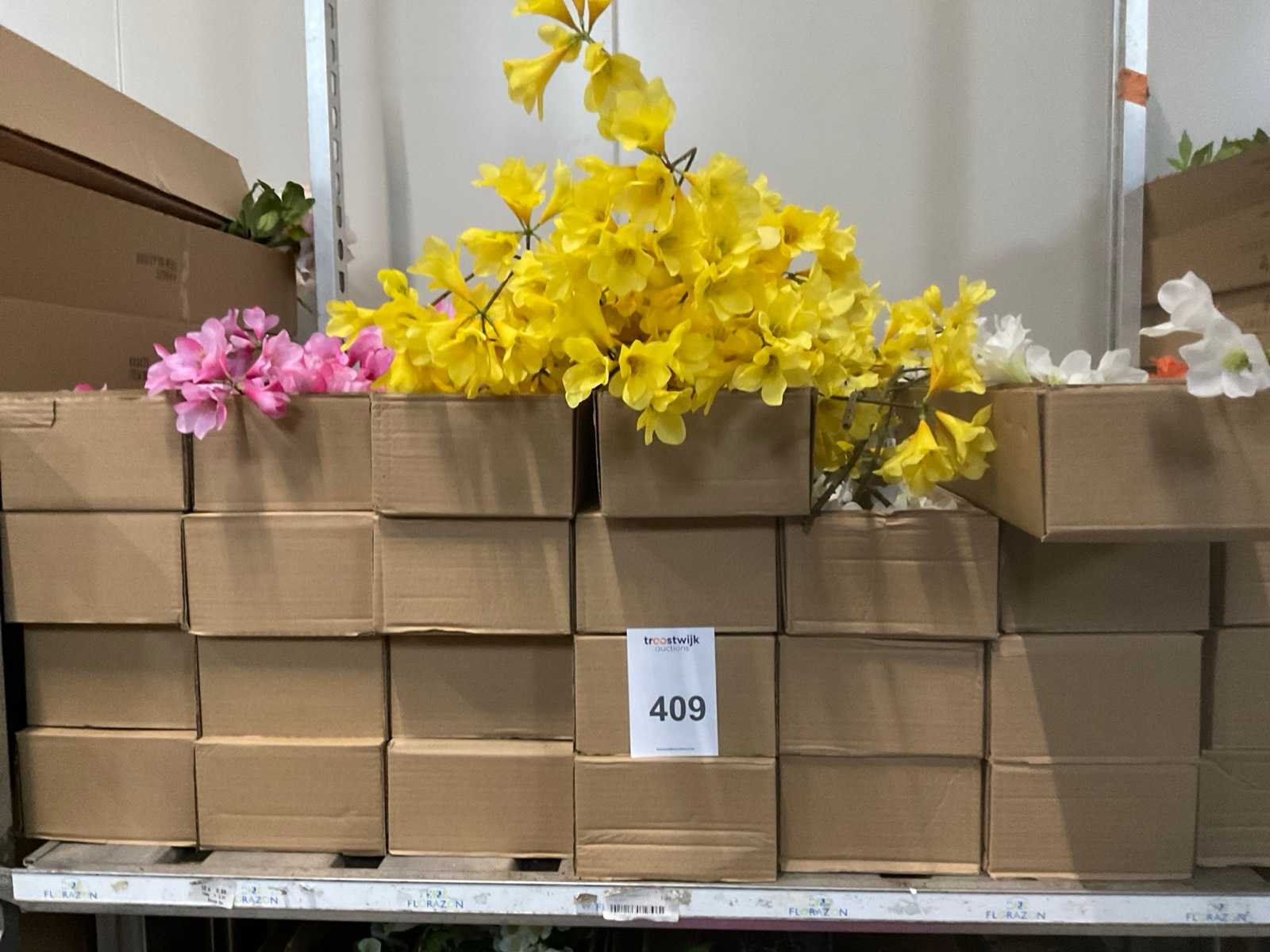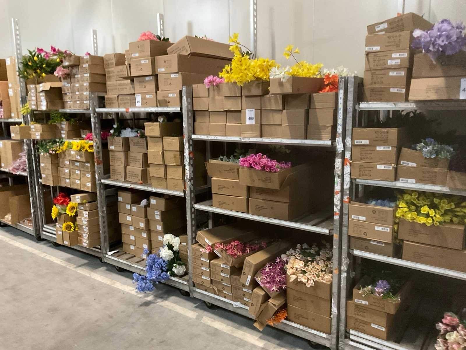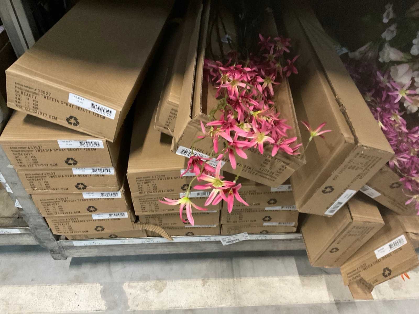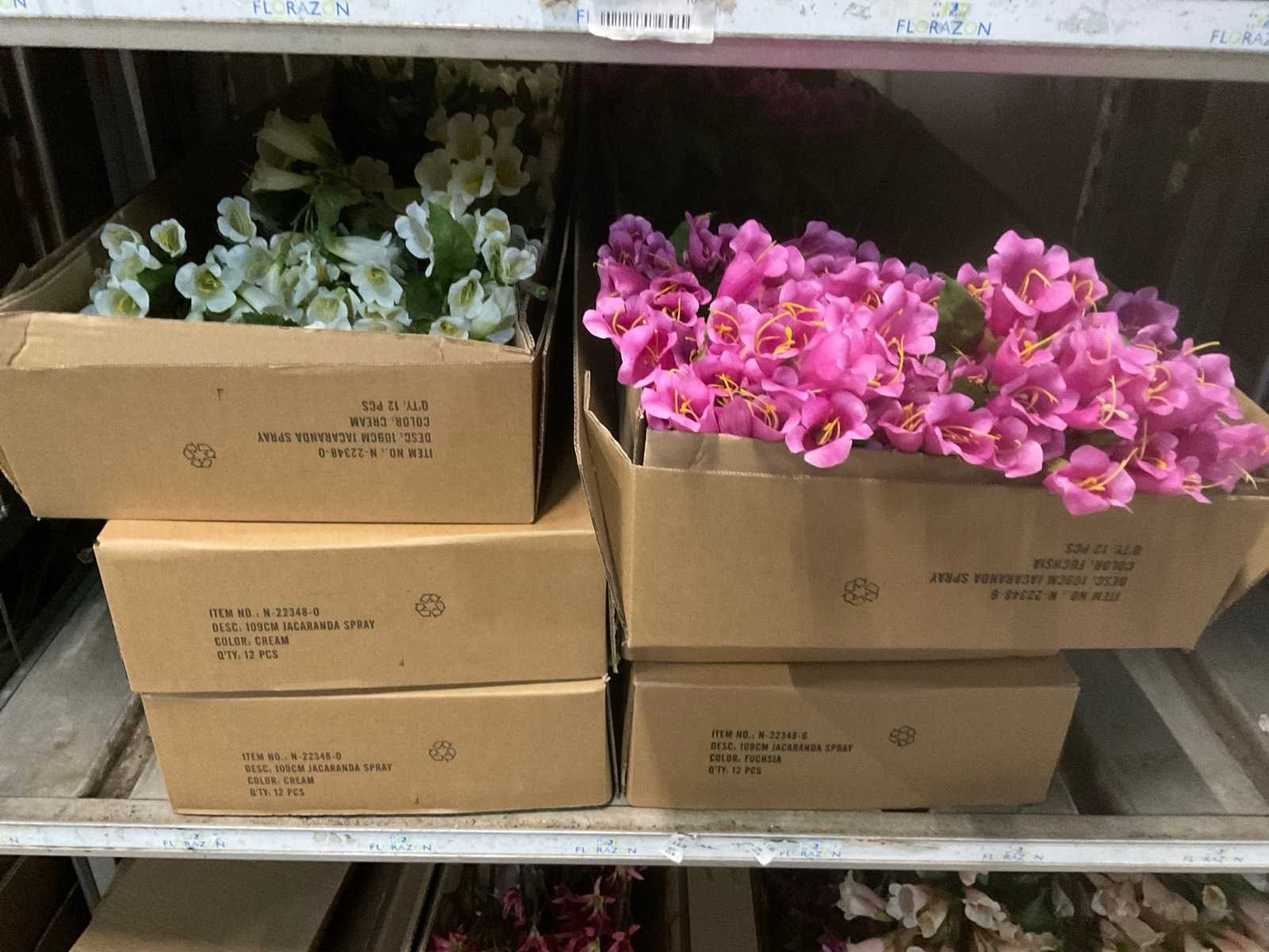 Inhoud kar, diverse soorten Emerald kunstbloemen, o.a. jacaranda, tweedia, bloesem , diverse kleuren, kar niet inbegrepen