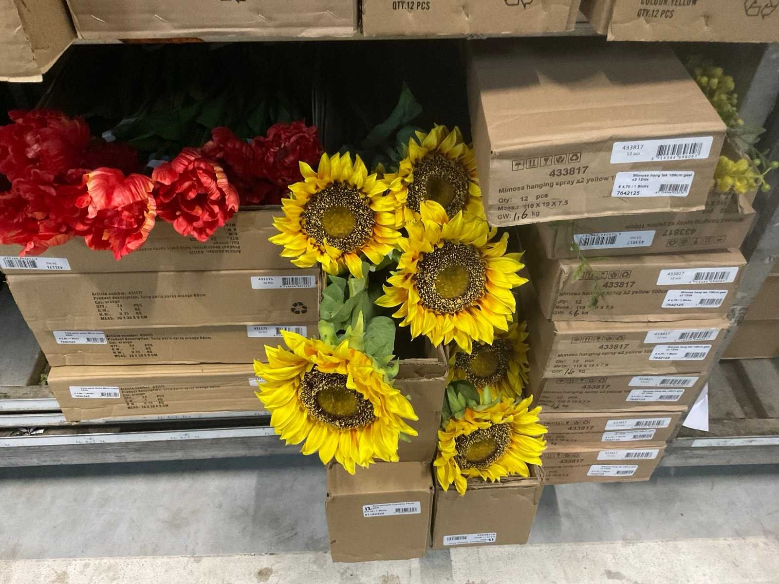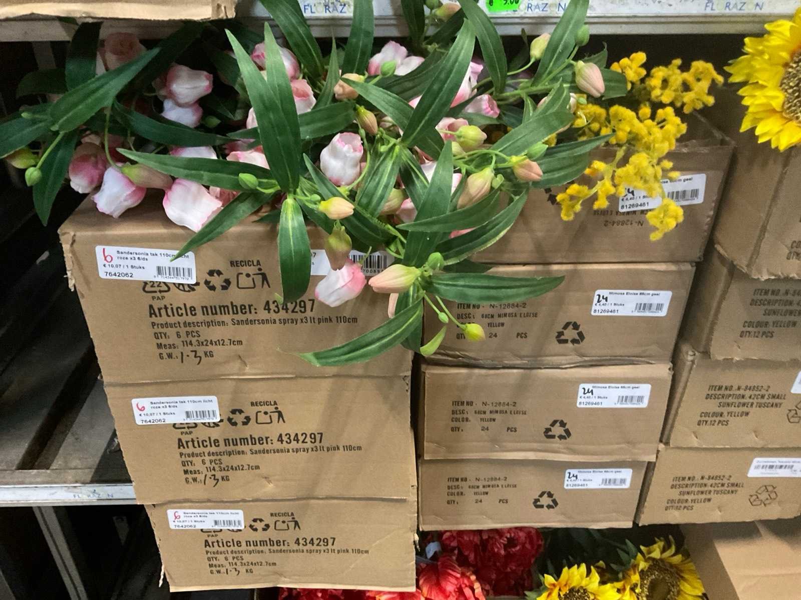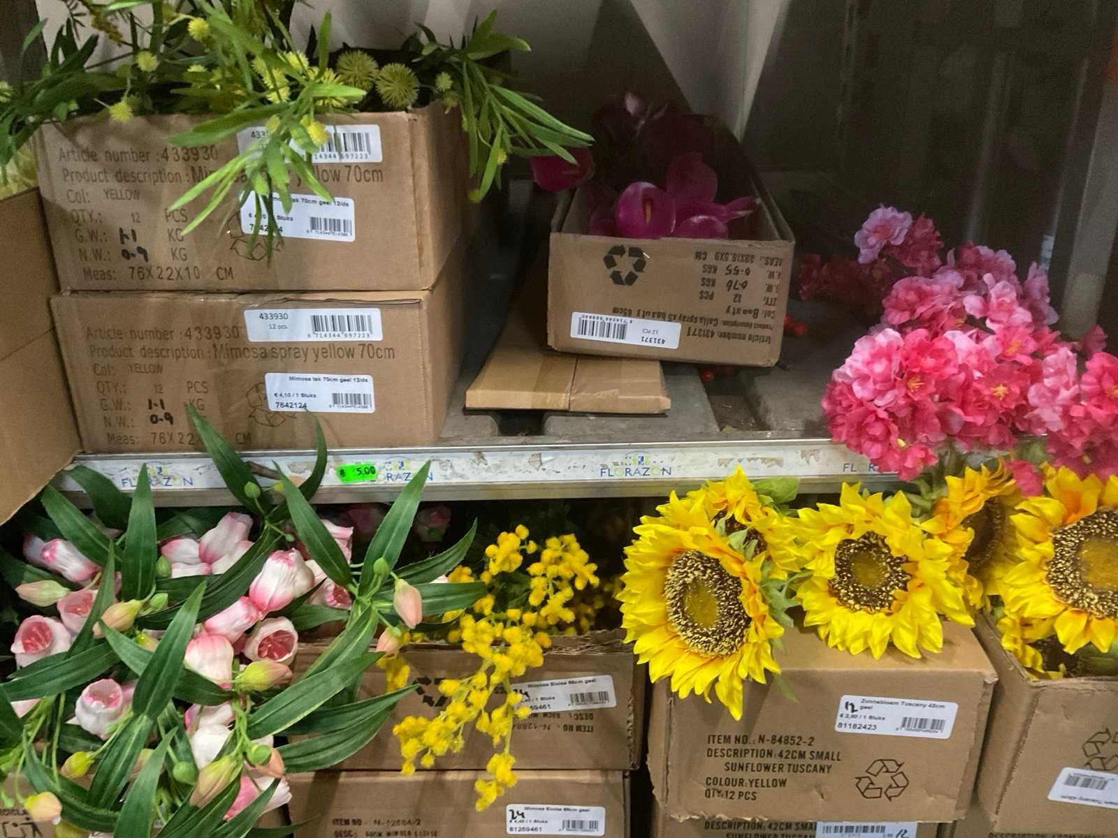 Inhoud kar, diverse soorten Emerald kunstbloemen, o.a. calla’s, mimosa, gladiolen, zonnebloemen, sandersonia, lemon boom 70cm, diverse kleuren, kar niet inbegrepen