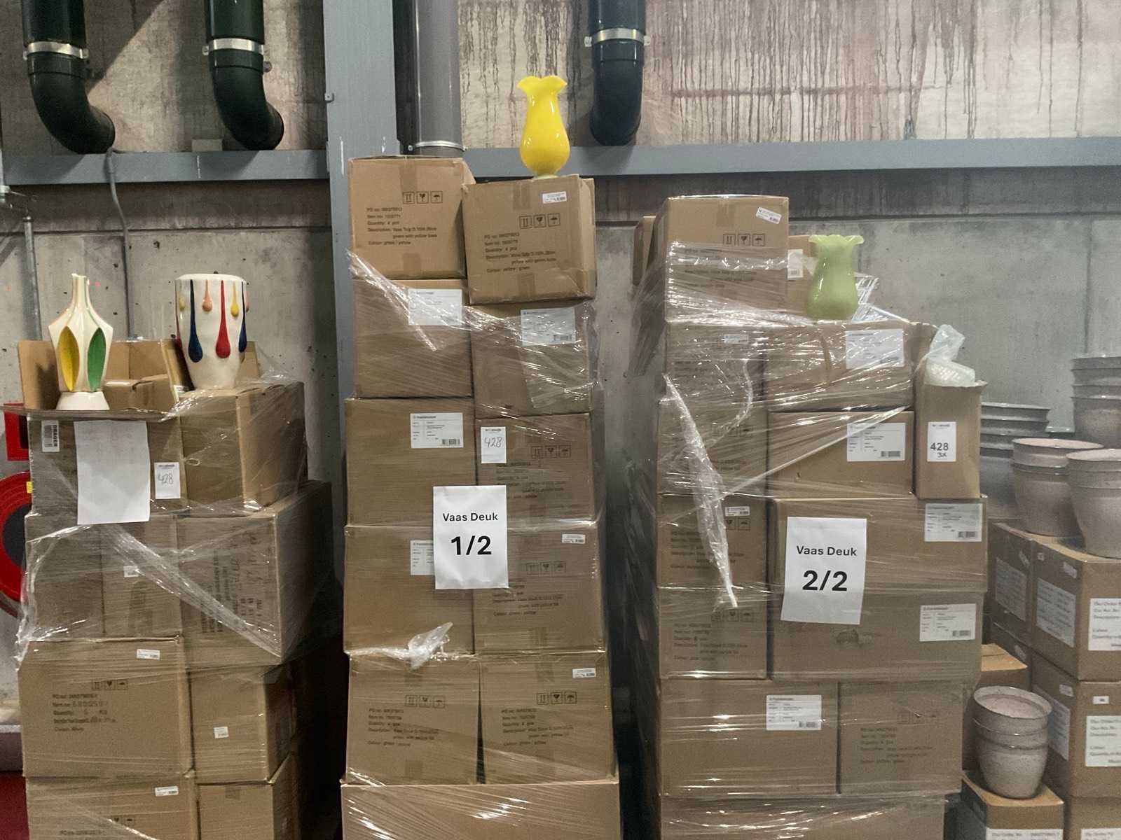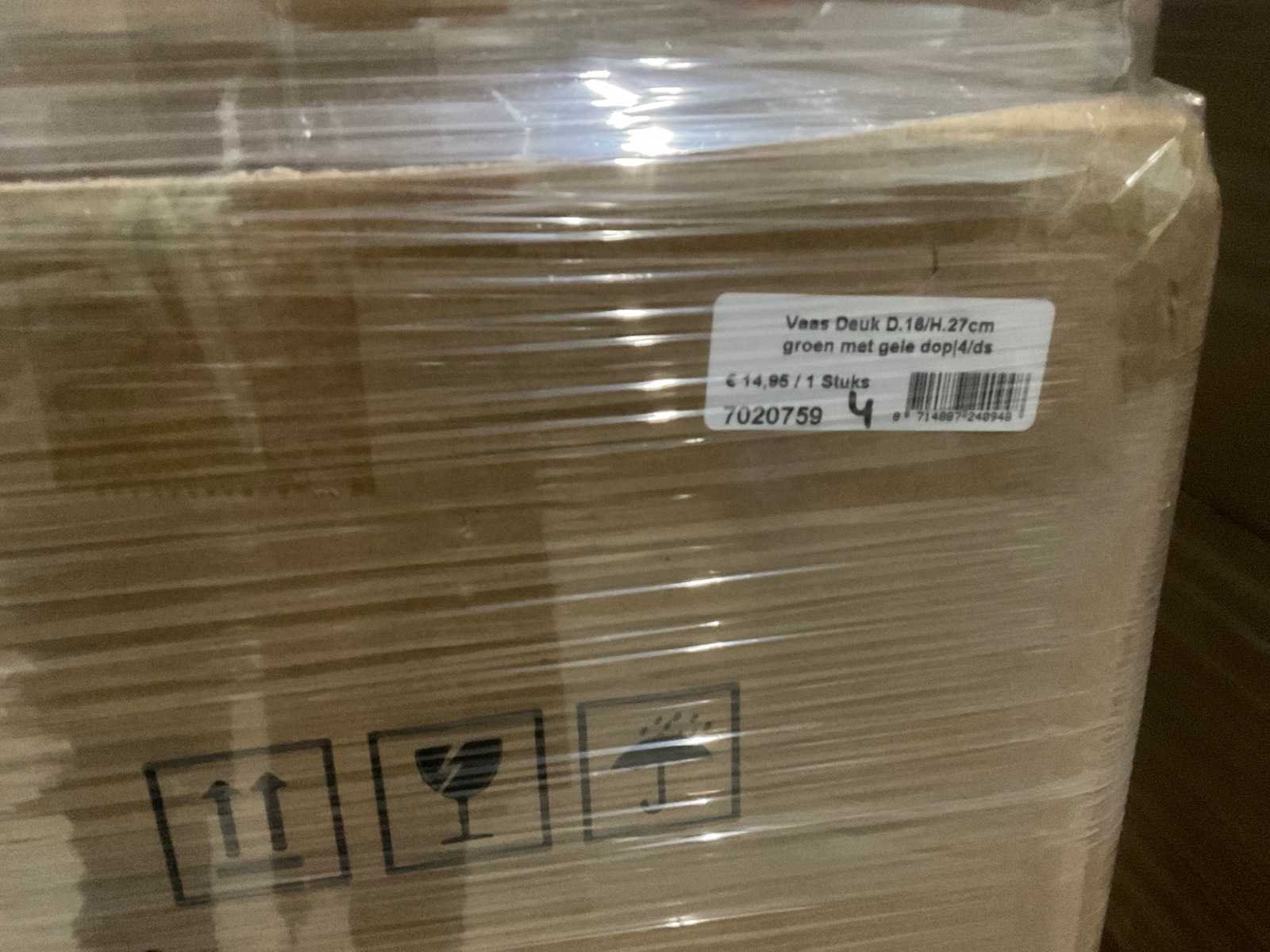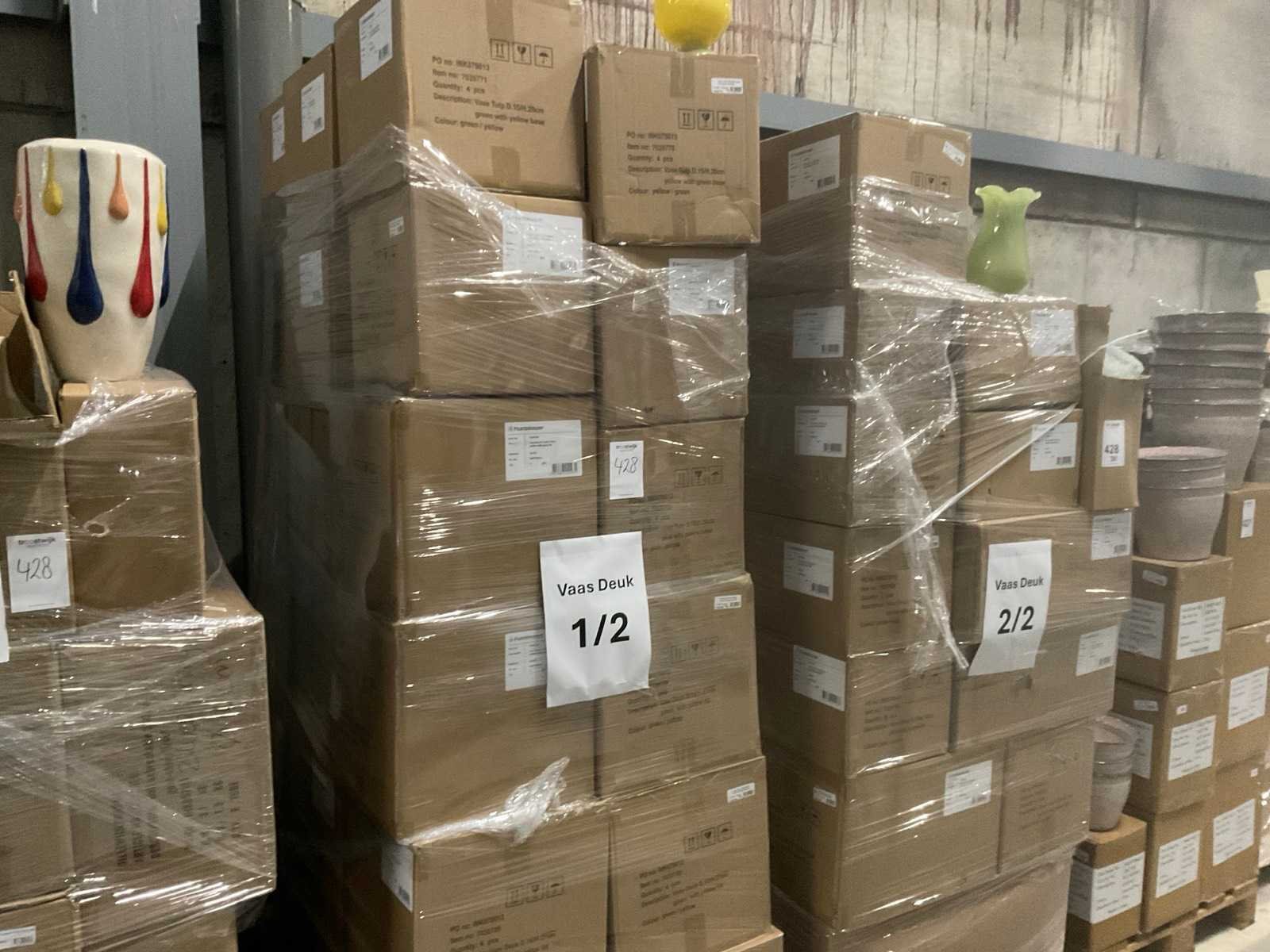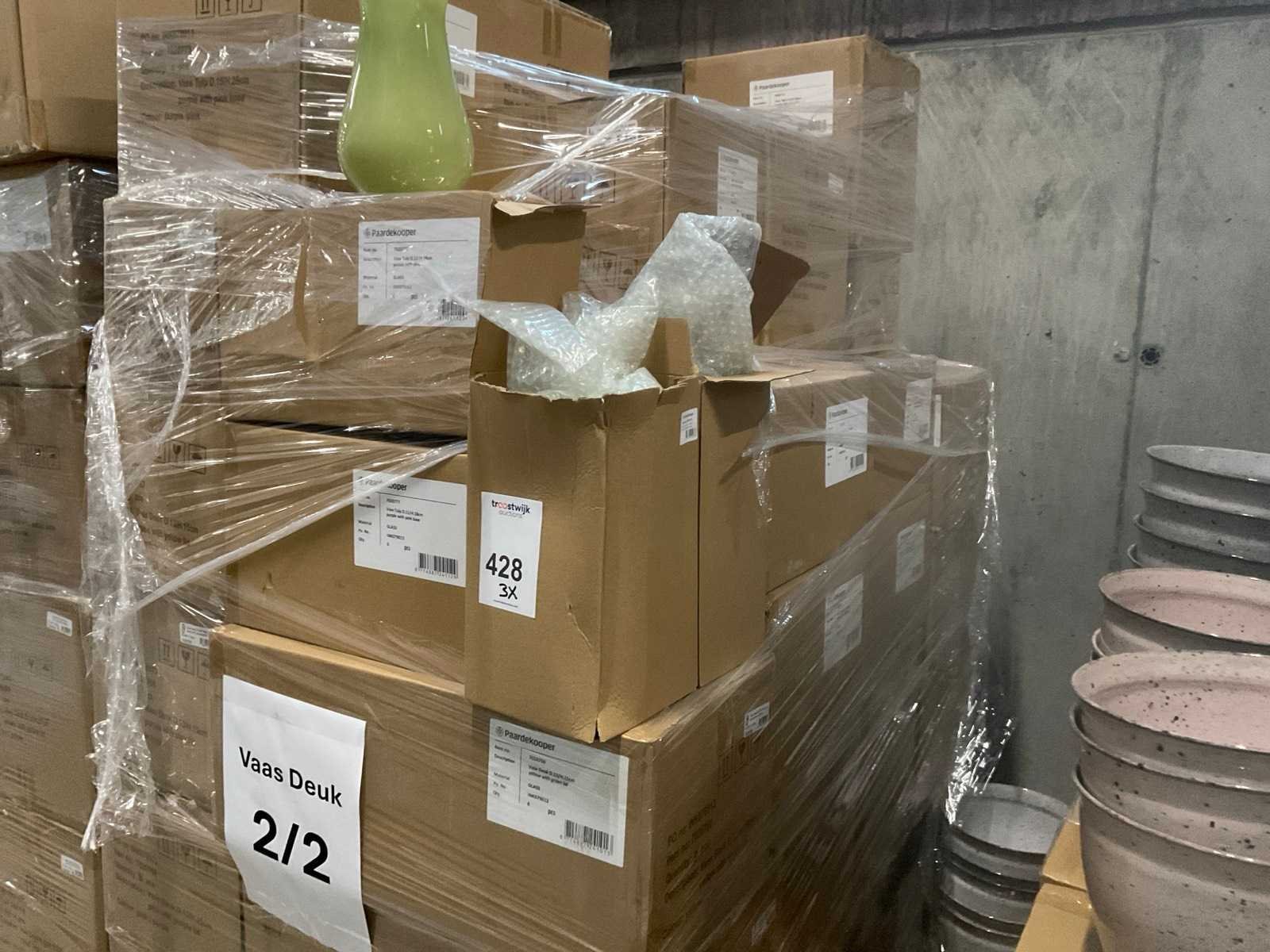 3 pallets , o.a. aardewerk en glazen vazen, diverse kleuren, inclusief pallets