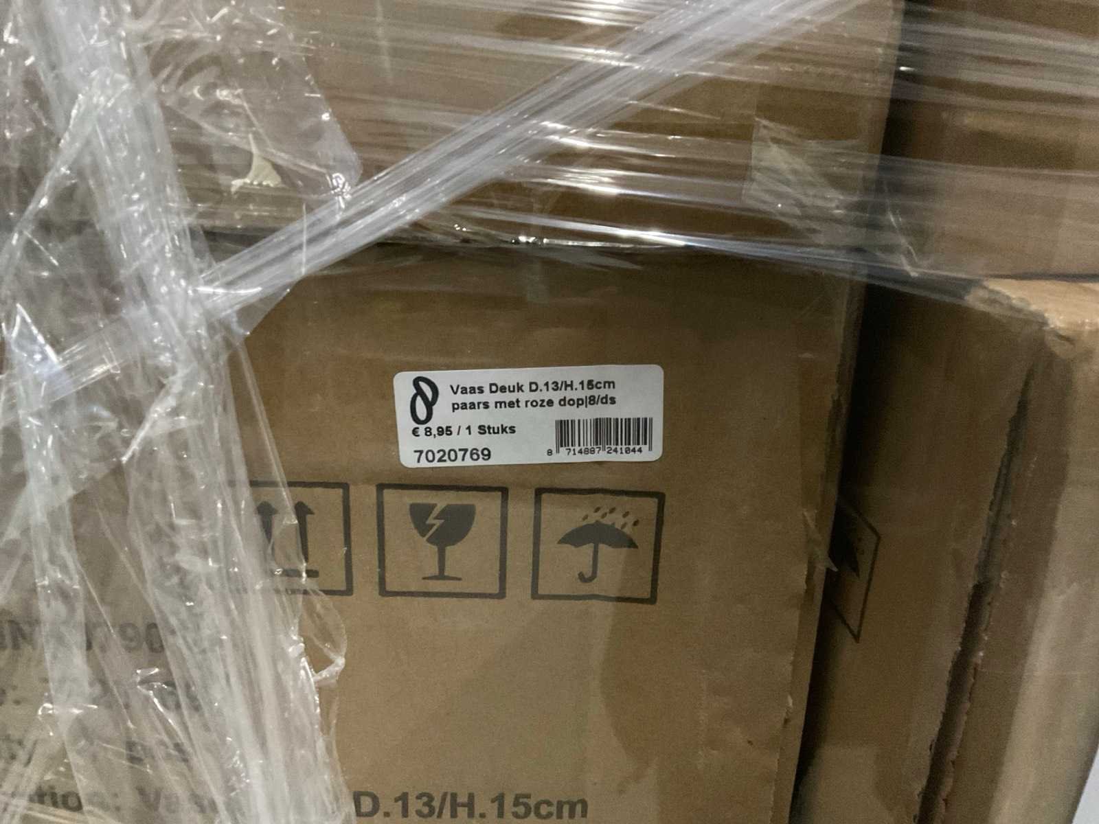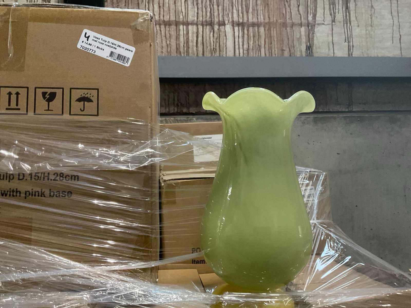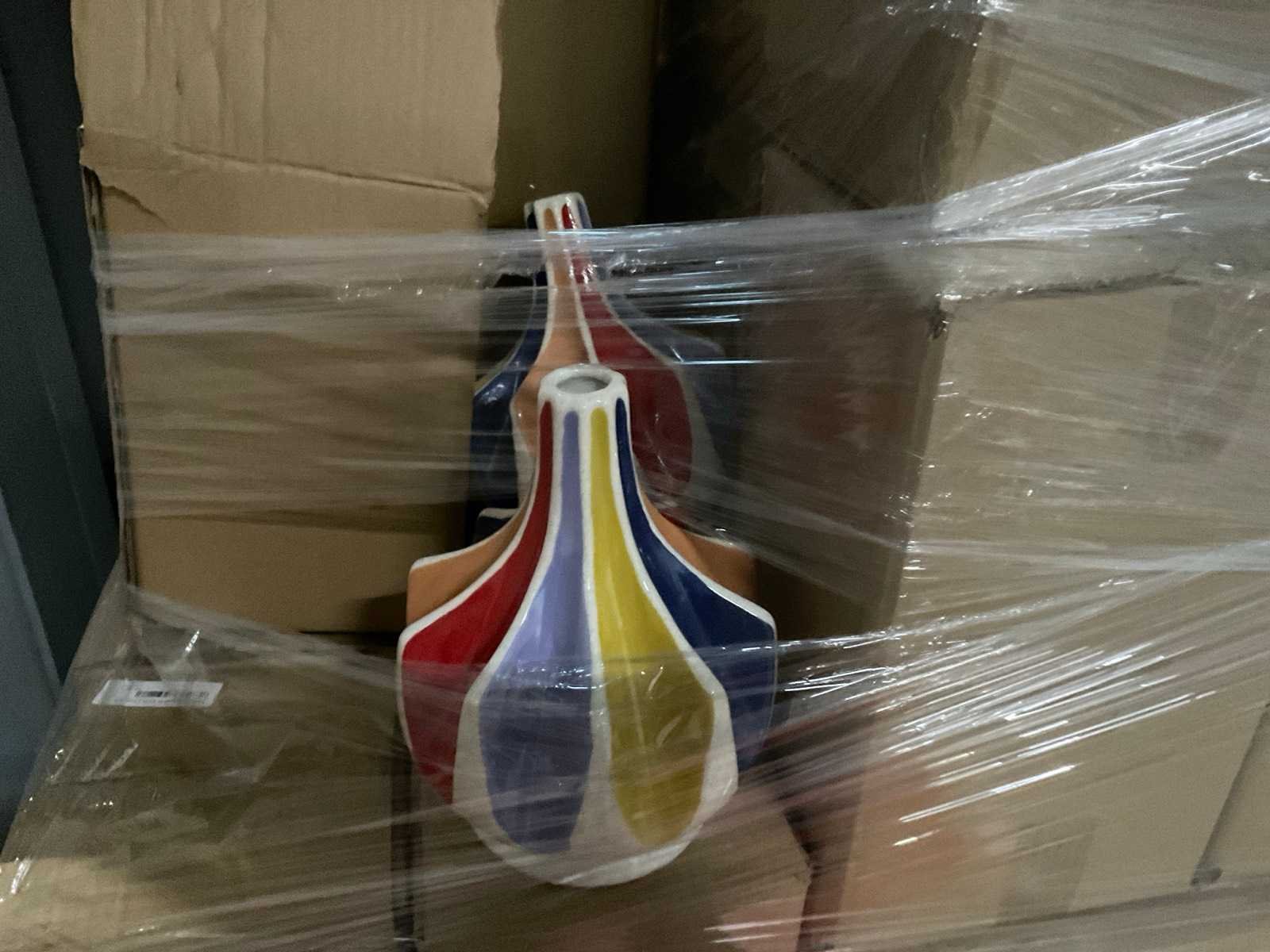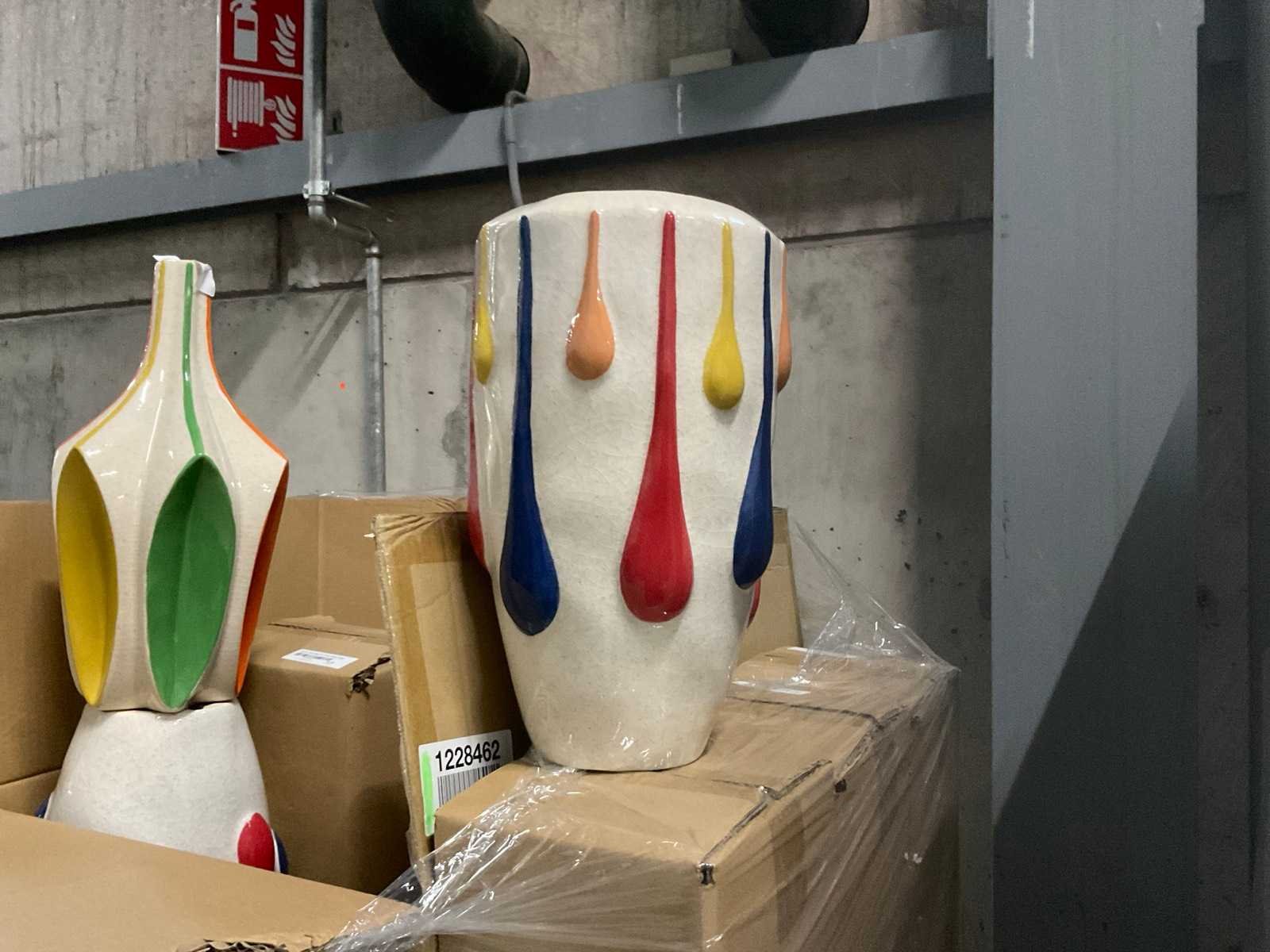 3 pallets , o.a. aardewerk en glazen vazen, diverse kleuren, inclusief pallets