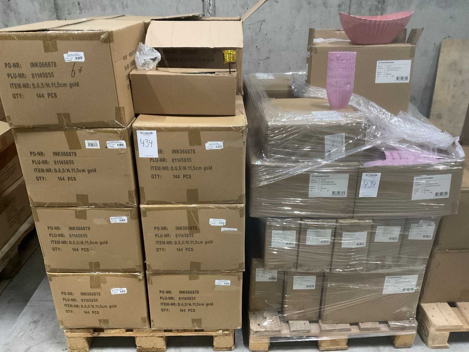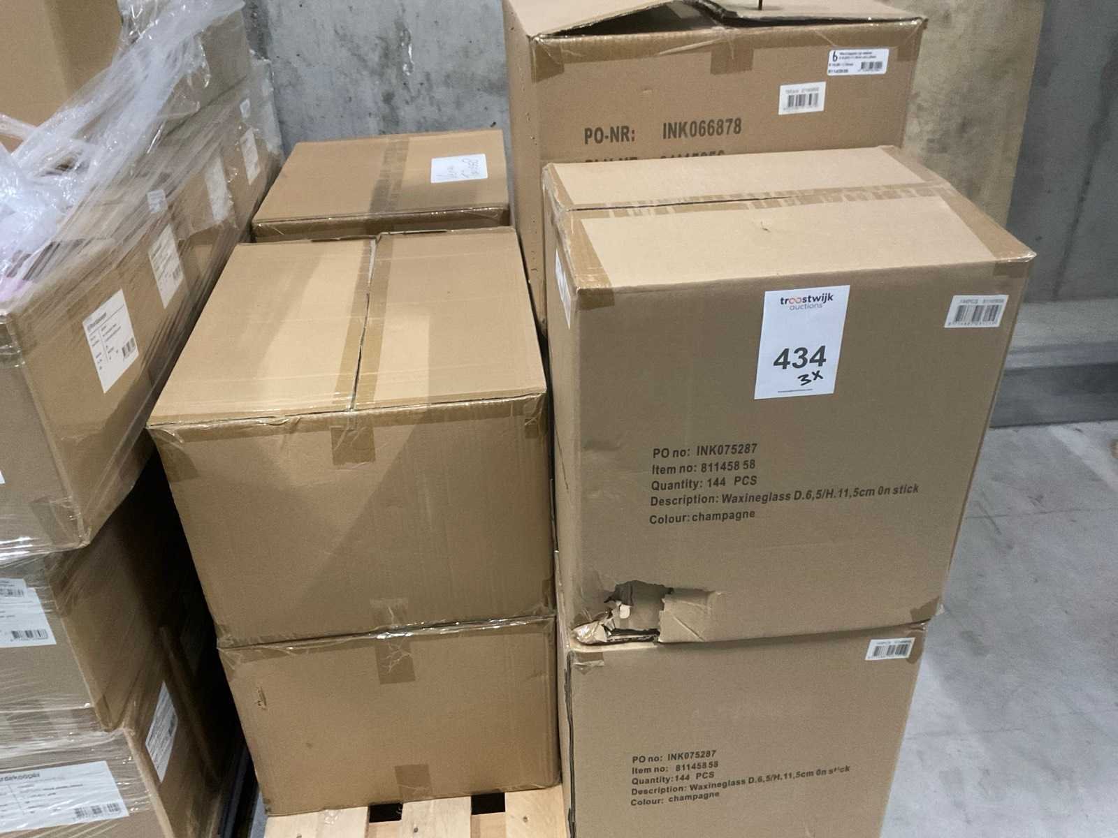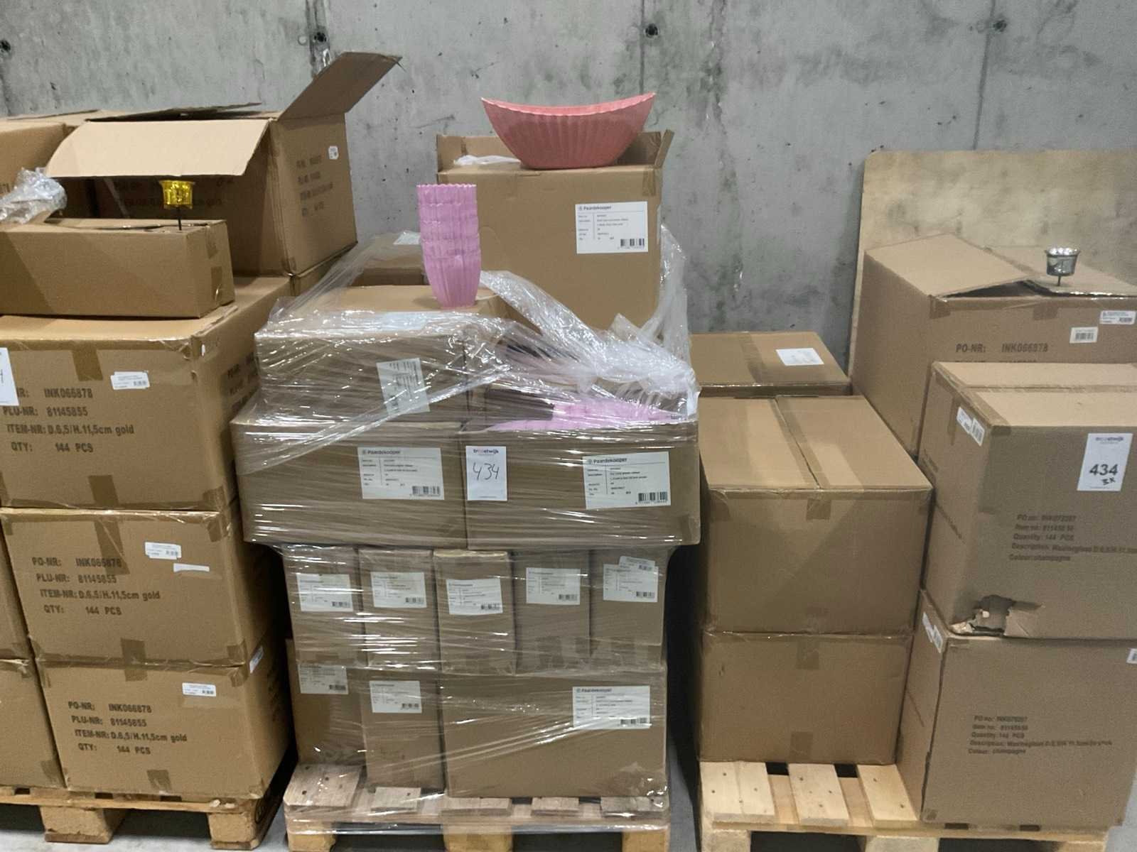3 pallets, o.a. waxineglas op steker en bowl Saar en pot Carla, inclusief pallets