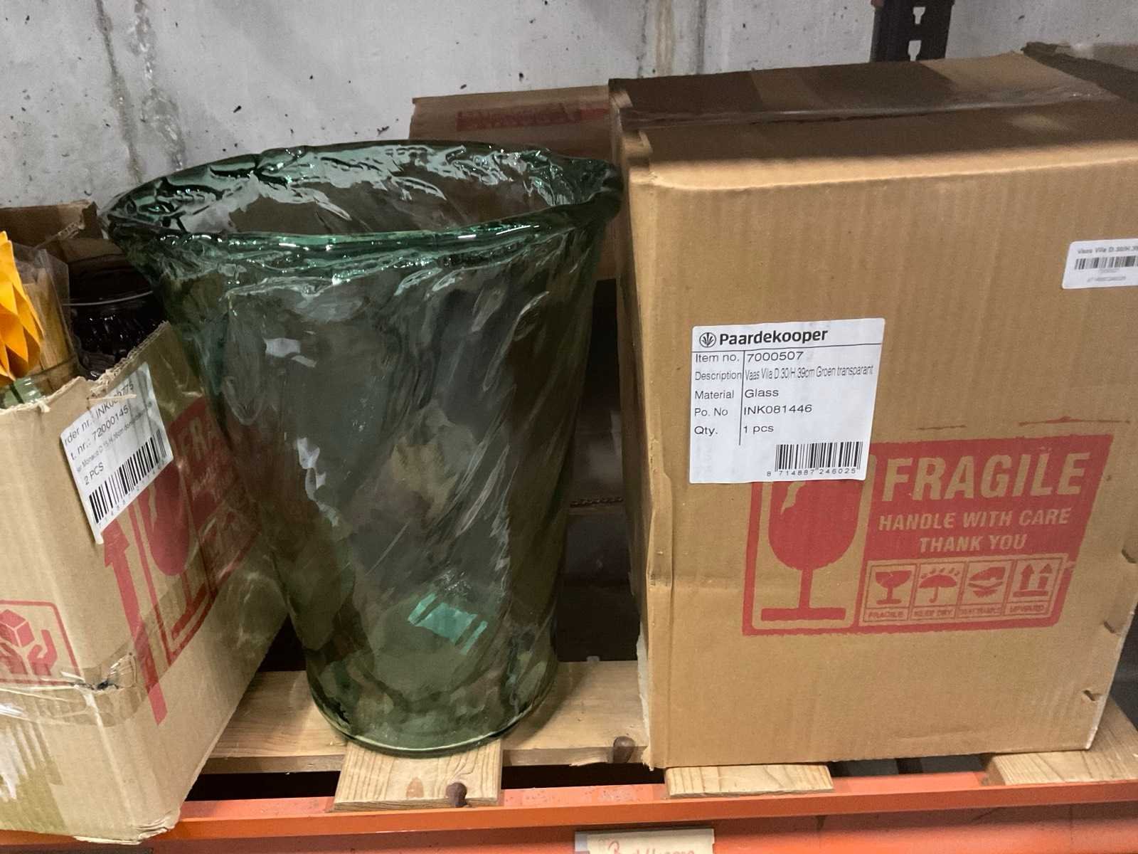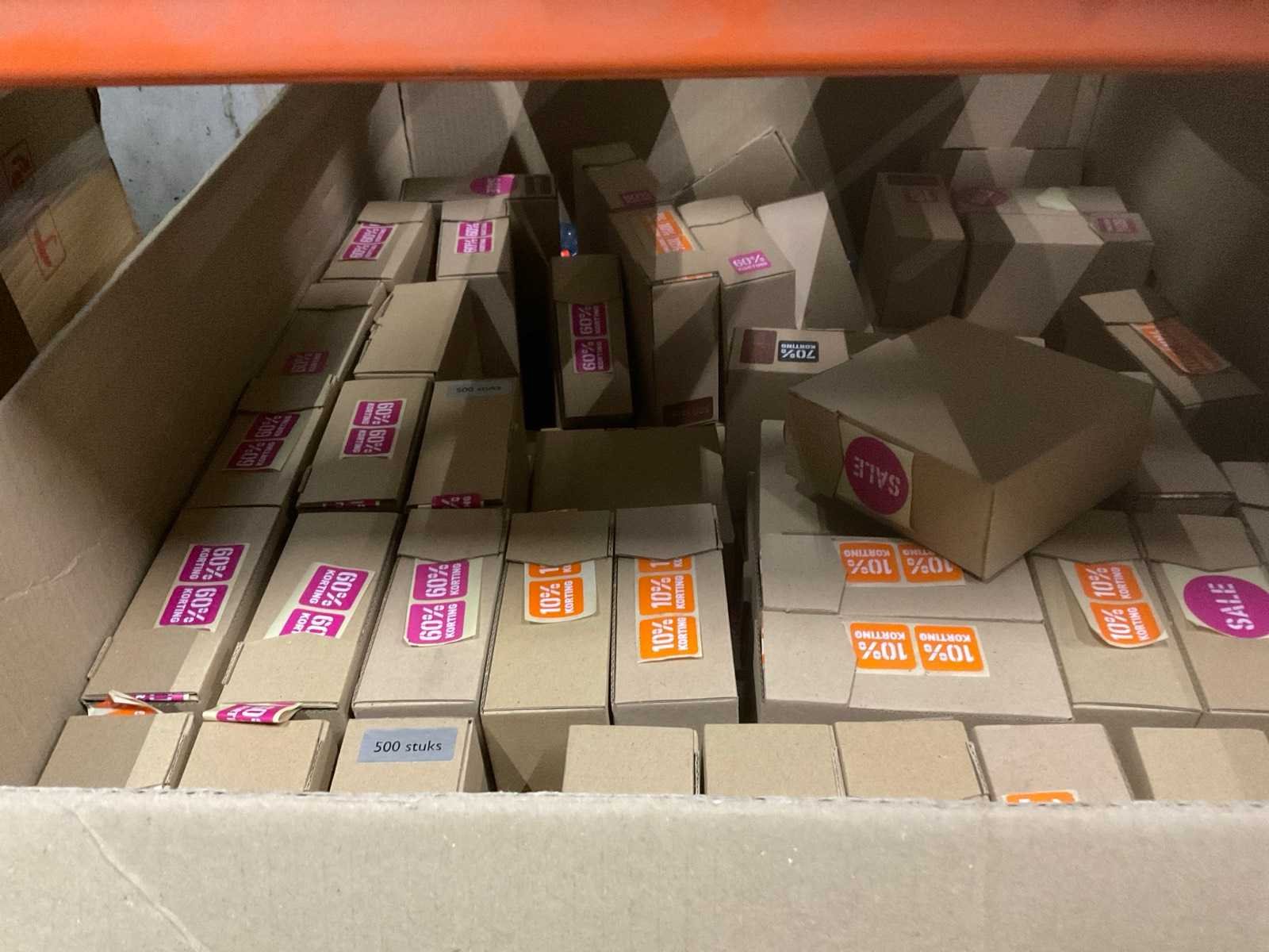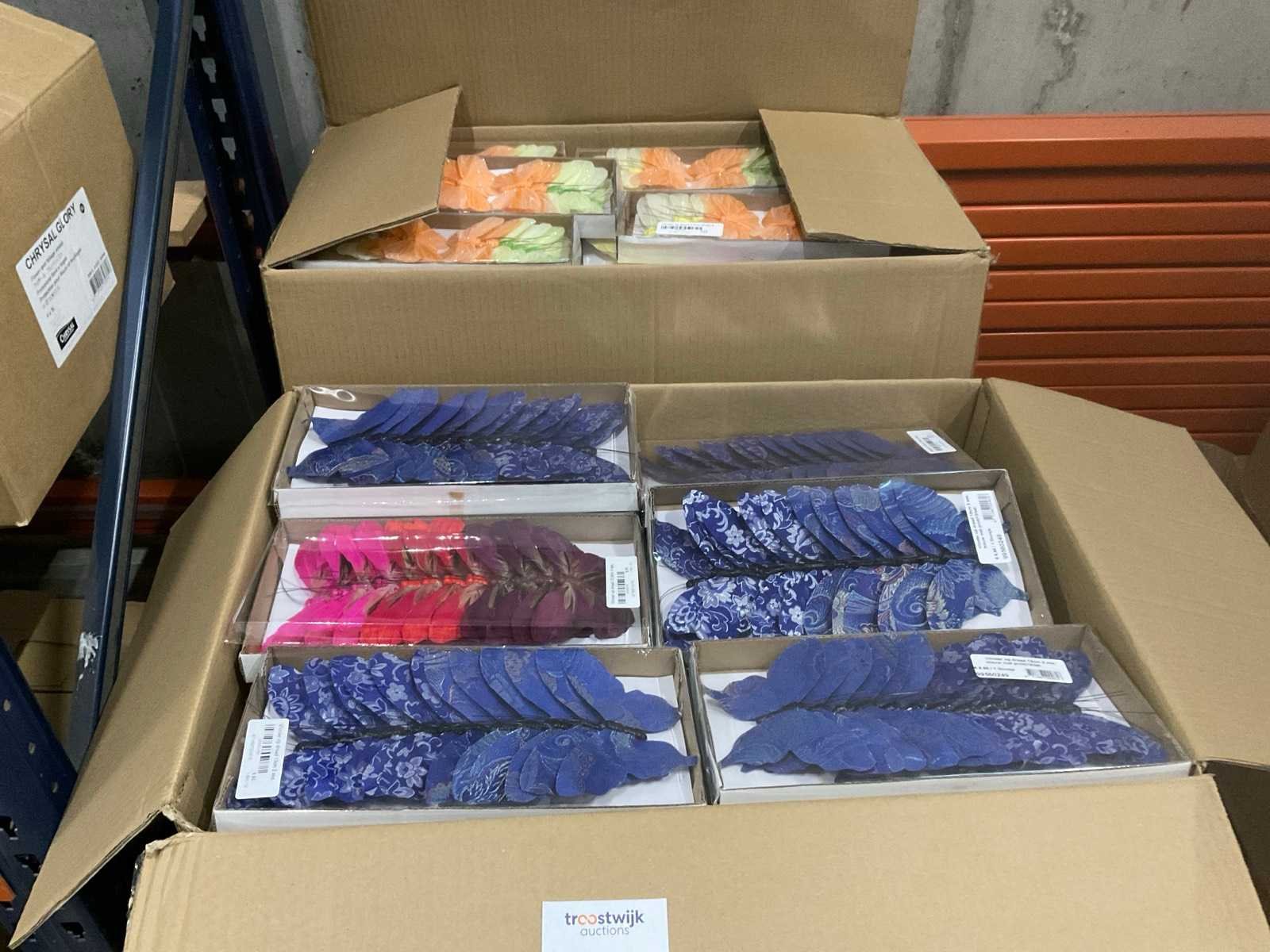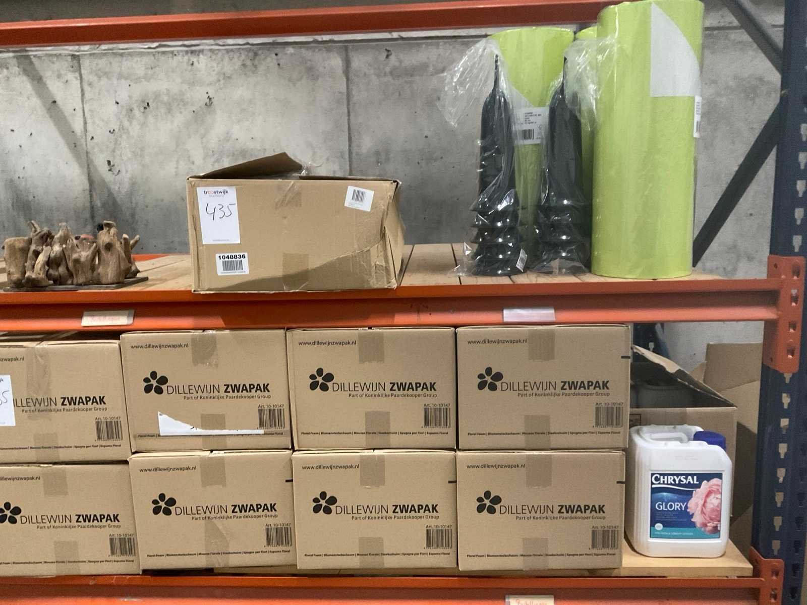 5 pallets en inhoud van 2 stellingen, o.a. vlinders op draad, diverse kleuren, inpakpapier op rol, waxinelicht strass, diverse vazen, bloemenzakken, hemddraagtassen, bindtouw jute op klos 500gr., dozen steekschuim, inclusief pallets, stelling niet inbegrepen