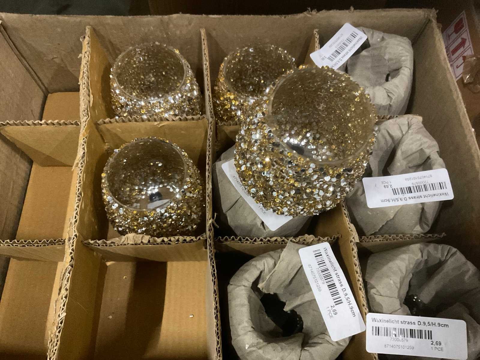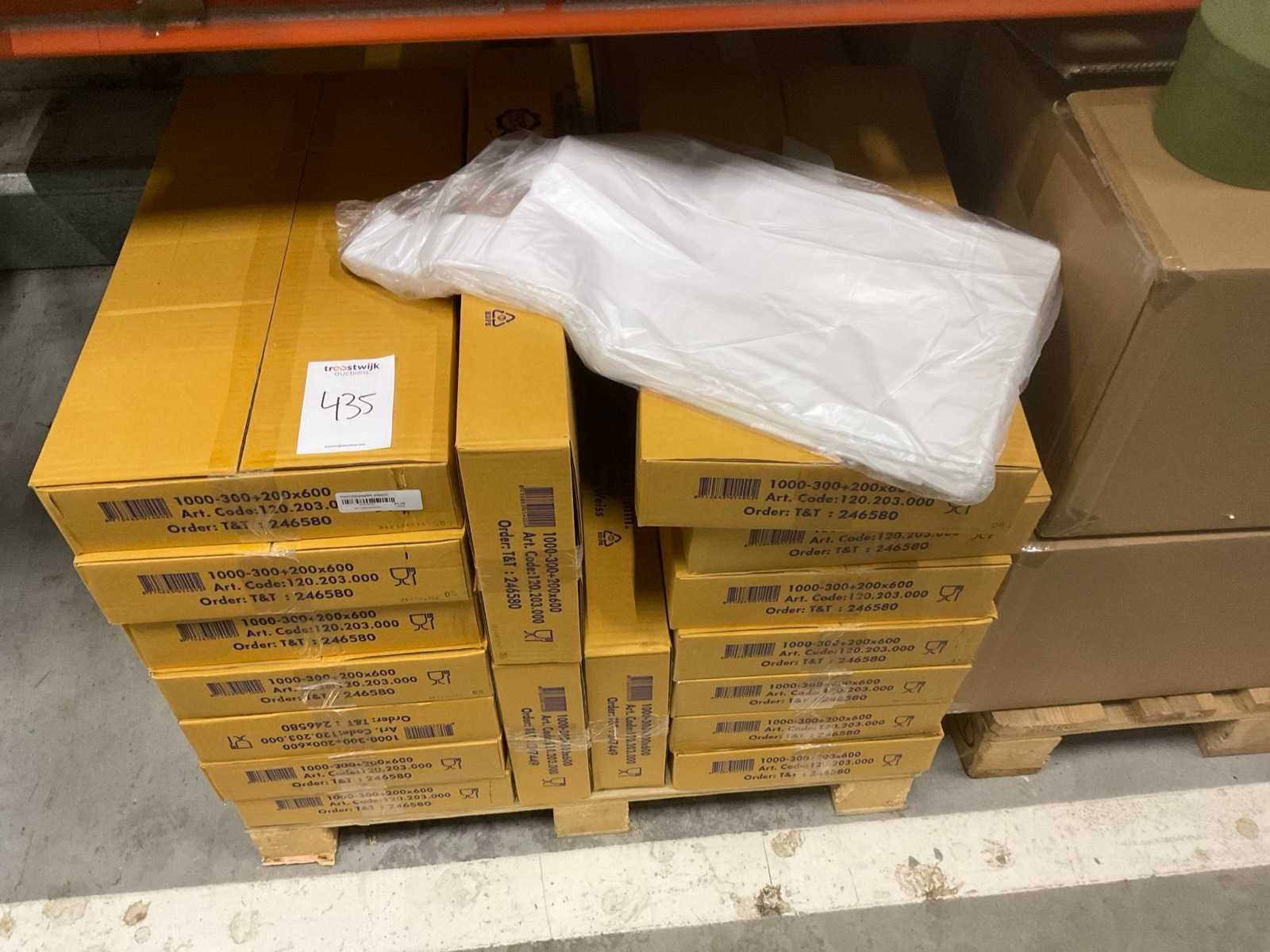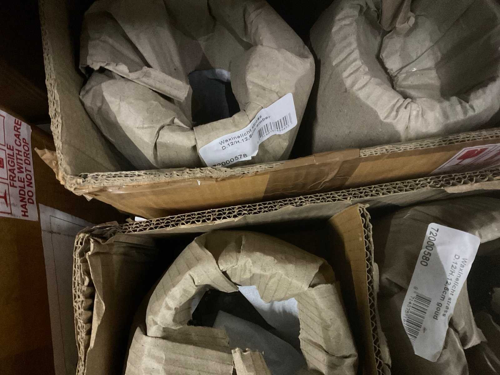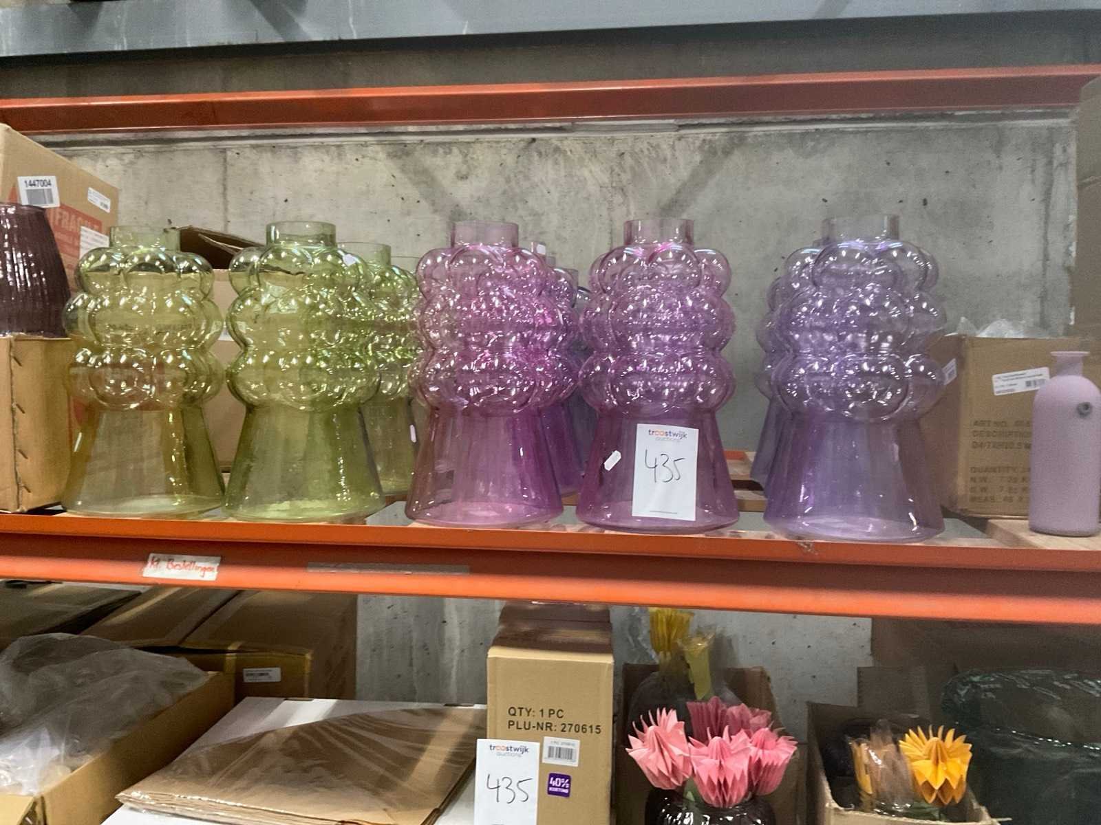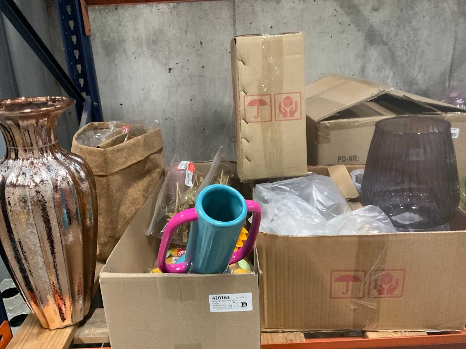 5 pallets en inhoud van 2 stellingen, o.a. vlinders op draad, diverse kleuren, inpakpapier op rol, waxinelicht strass, diverse vazen, bloemenzakken, hemddraagtassen, bindtouw jute op klos 500gr., dozen steekschuim, inclusief pallets, stelling niet inbegrepen