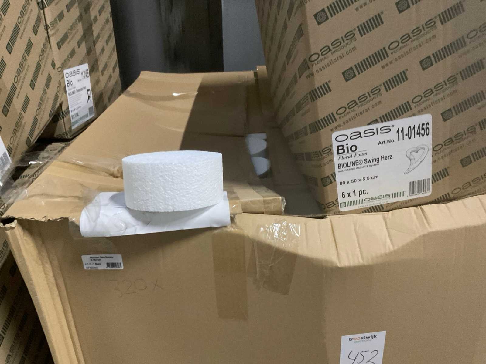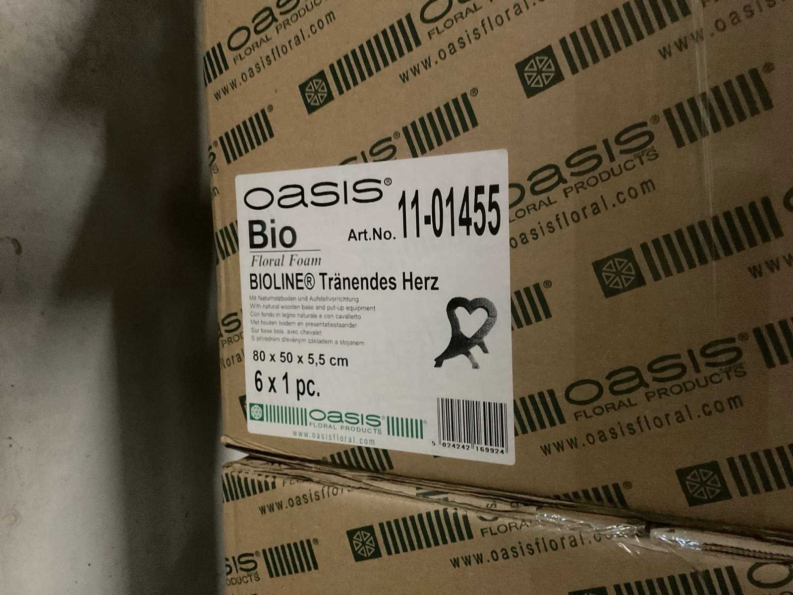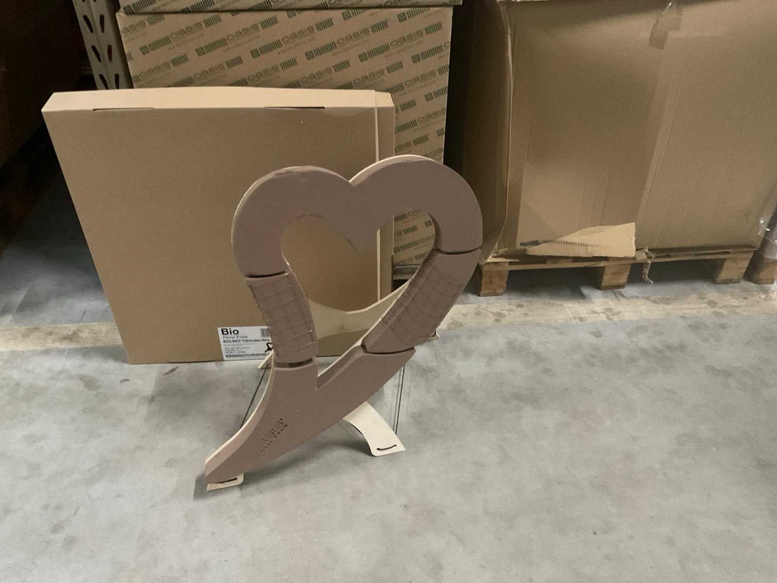 3 pallets, o.a. oasis flower bags, styropor cake dummy’s, oasis huilend hart, inclusief pallets