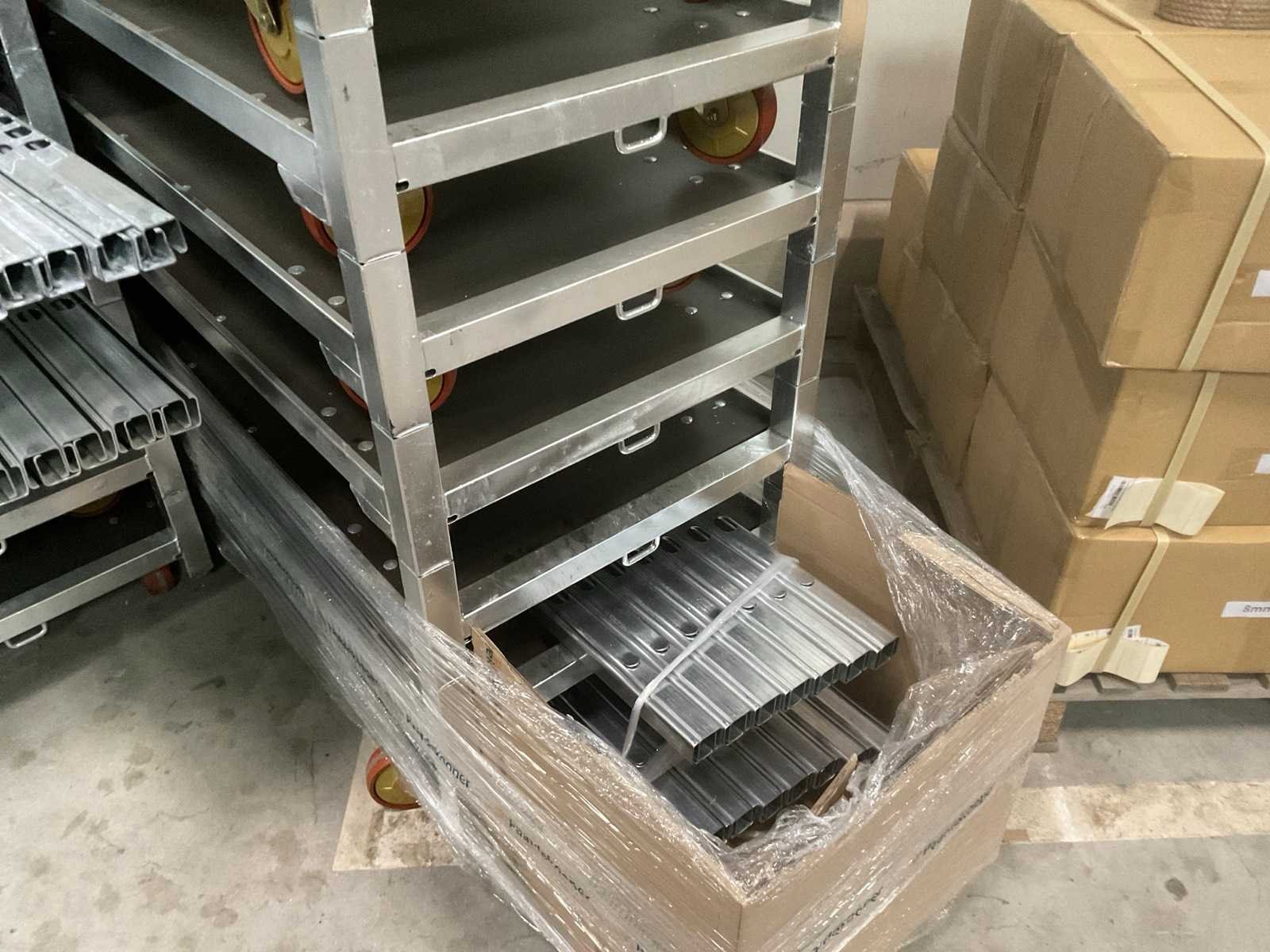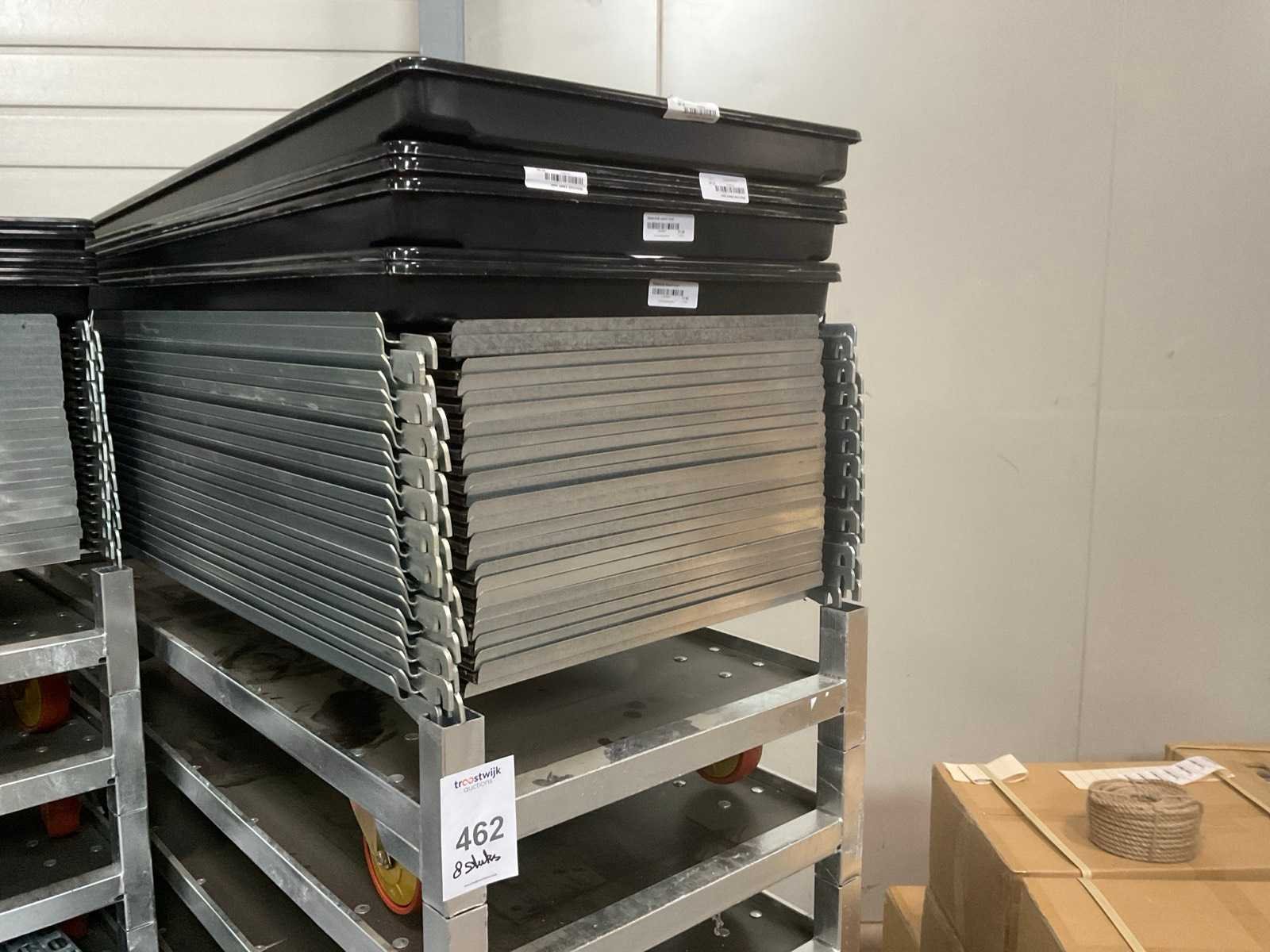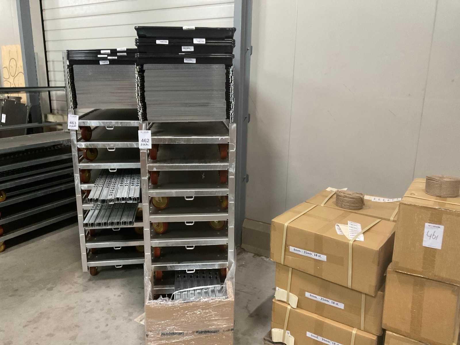 8 stuks Deense kar / bloemenwagen, 32 staanders, 24 legborden en 6 waterbakken zwart