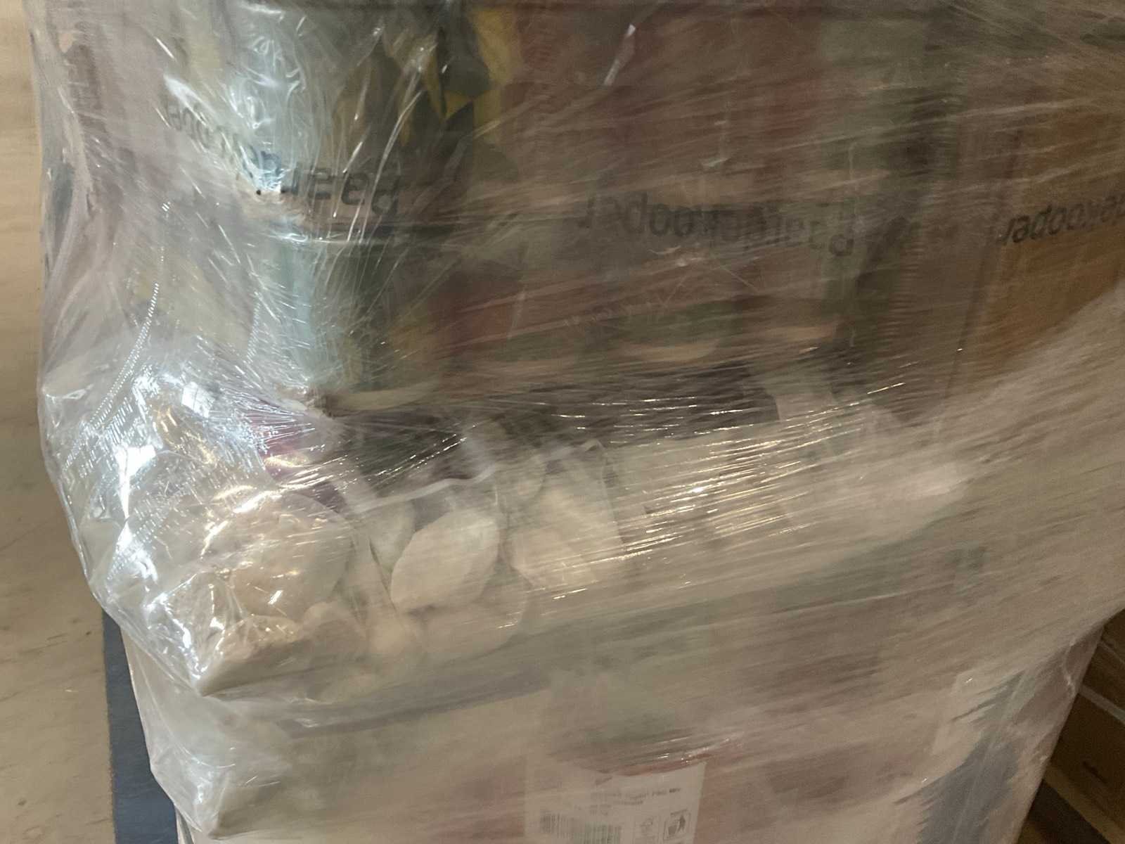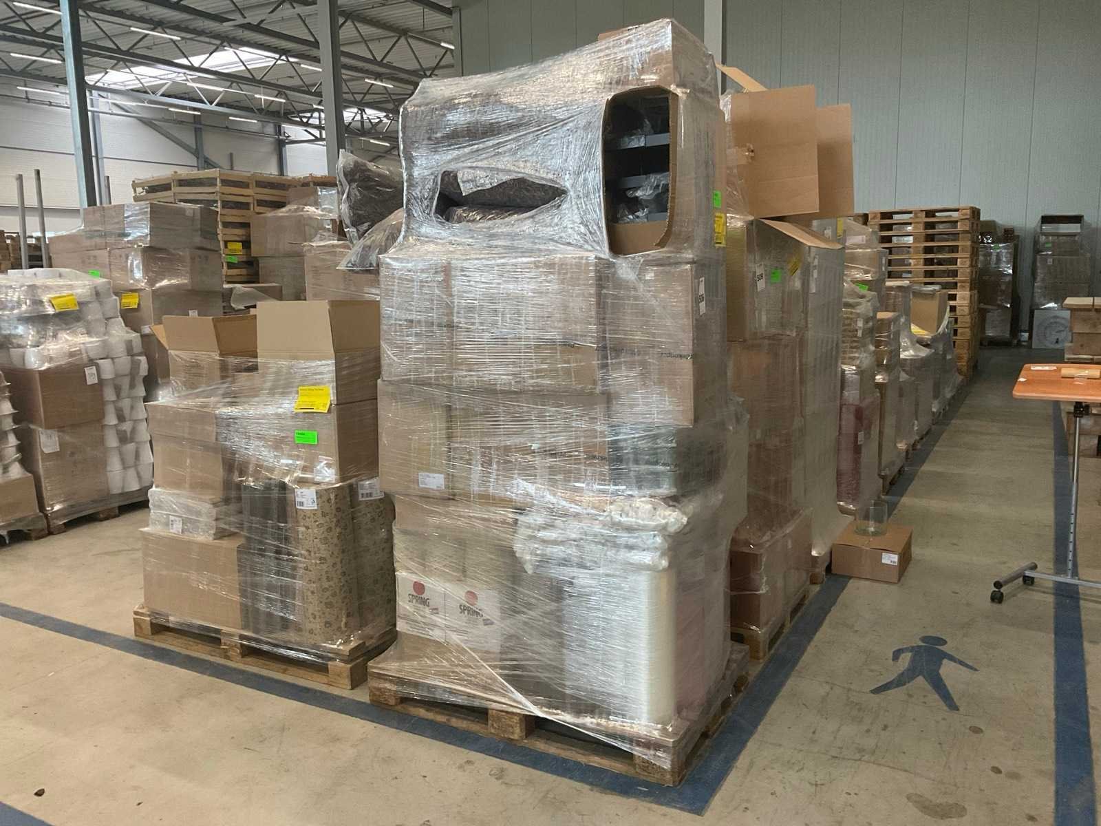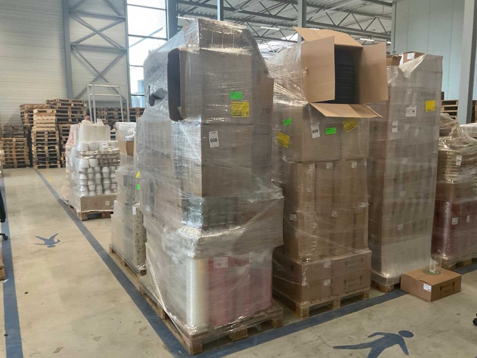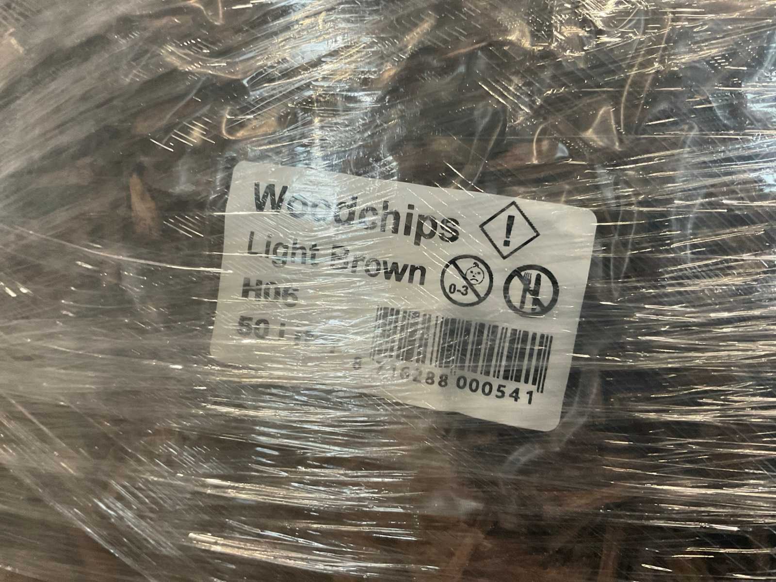 1 pallet decoratie bestaande uit o.a. zakken houtsnippers, metalen schaal op voet, stenen in zak, potjes, papier op rol, papieren tassen, etc, inclusief pallet.