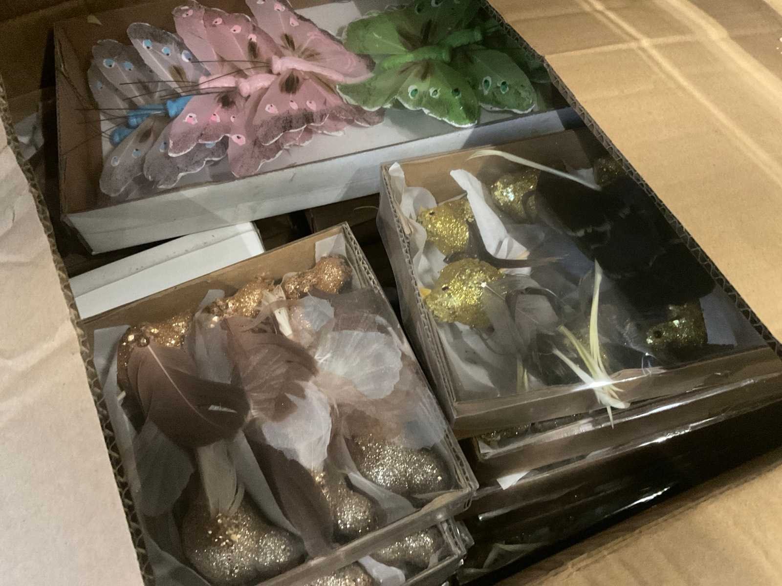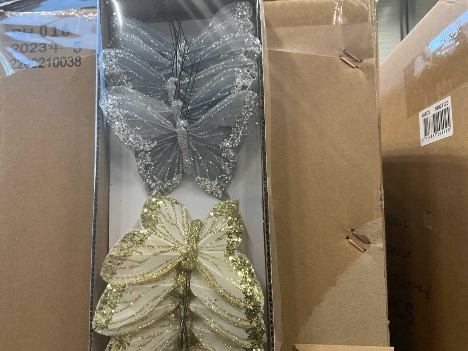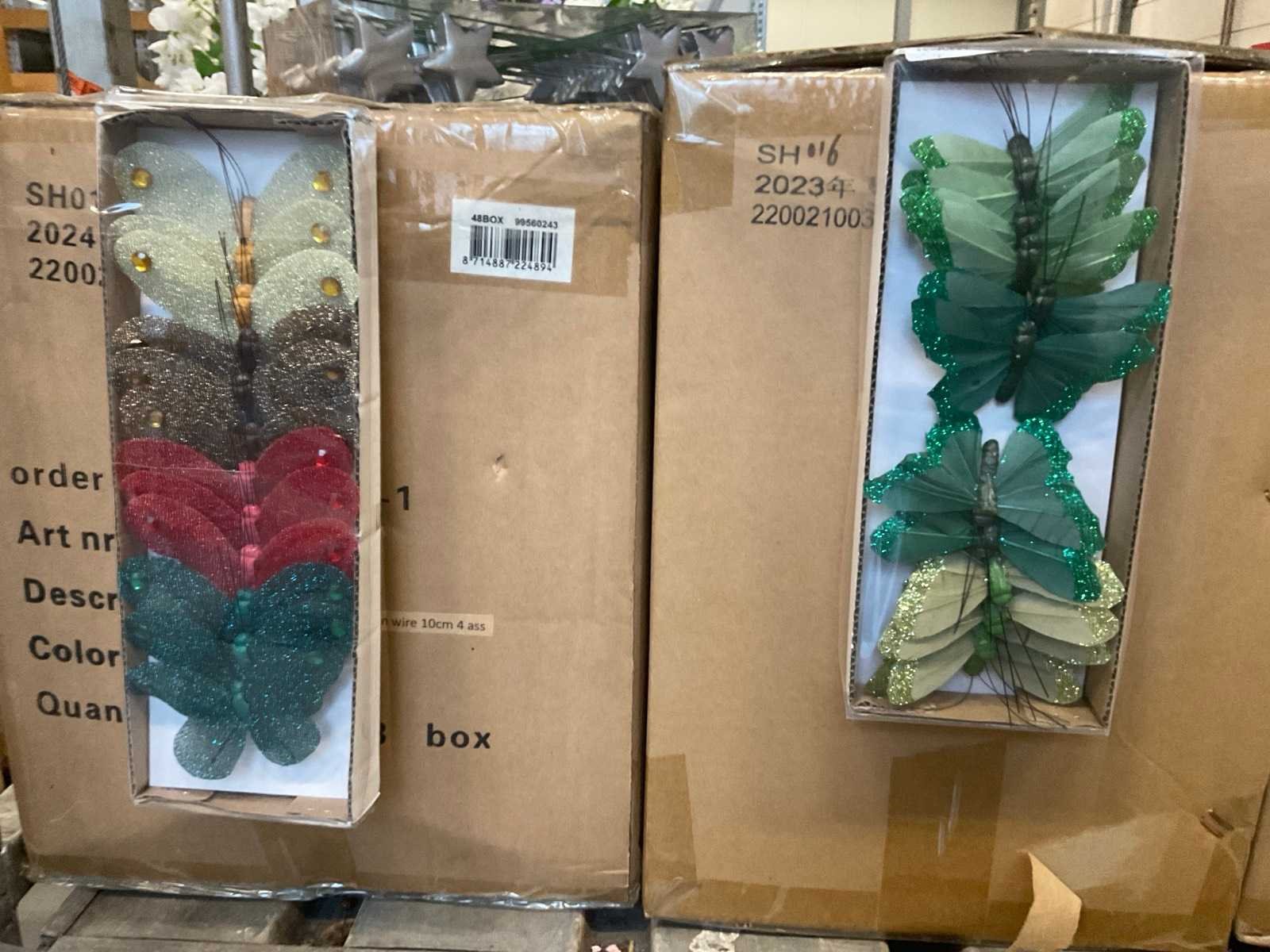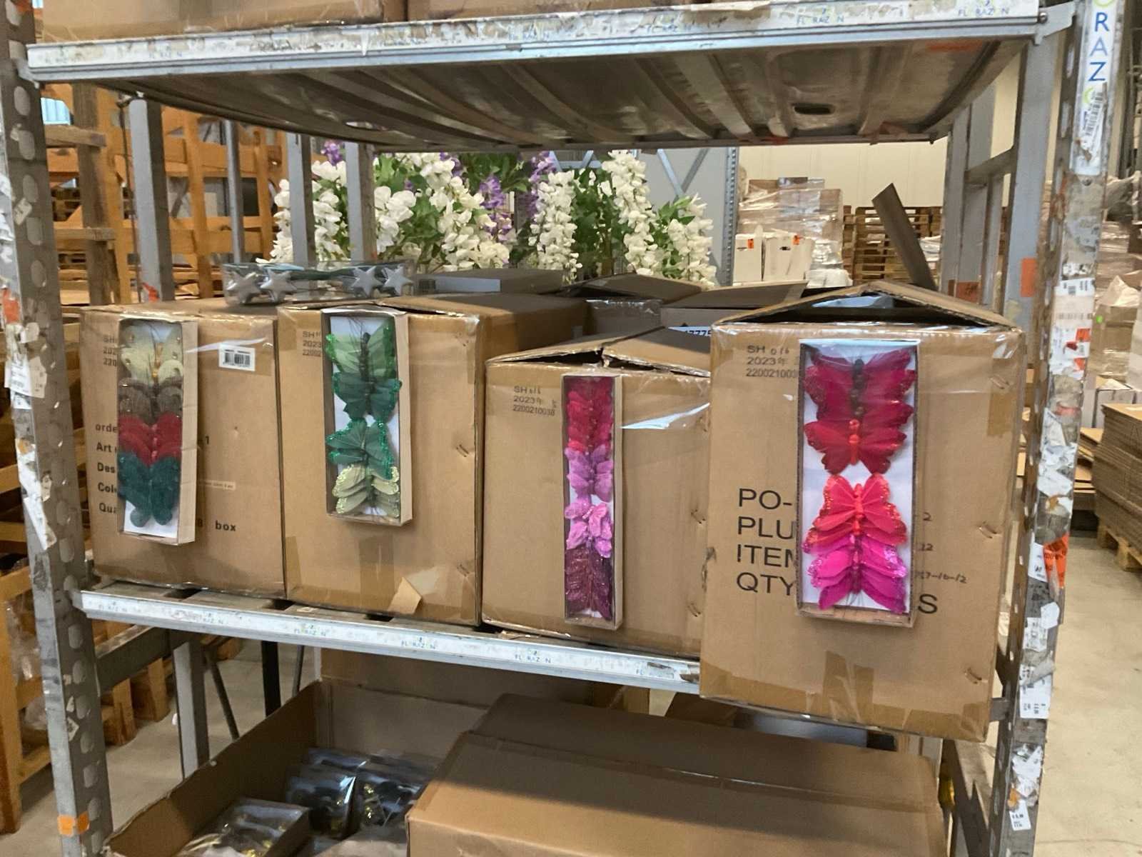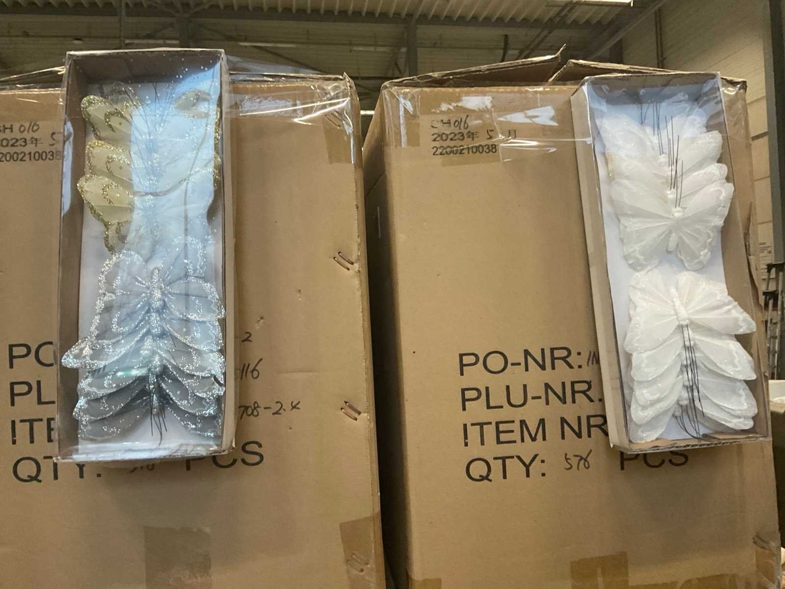 Diverse decoratievlinders in verschillende maten, soorten en kleuren, inclusief diverse andere decoratie stukken zoals instellers, wagen niet inbegrepen.