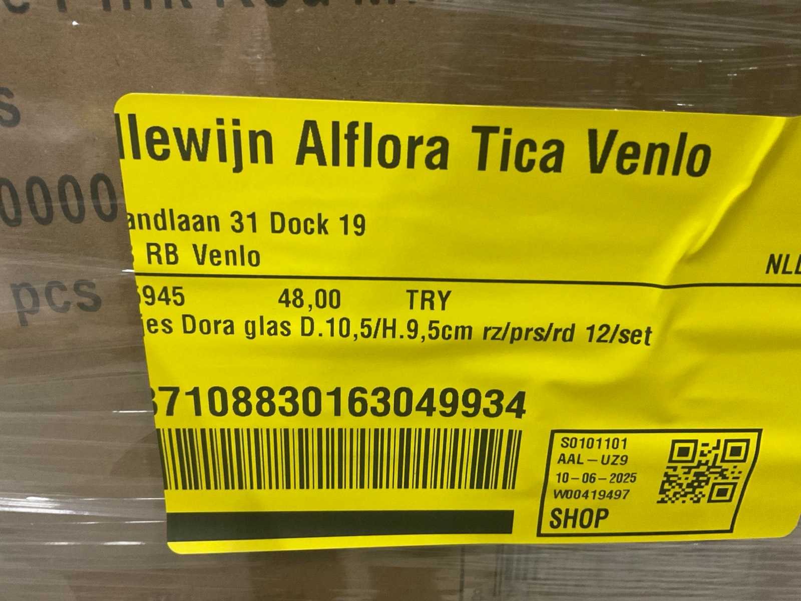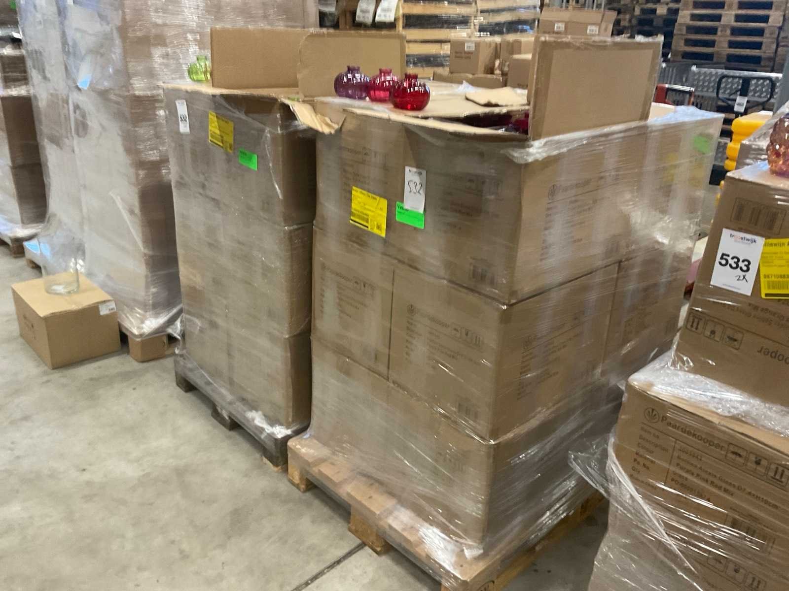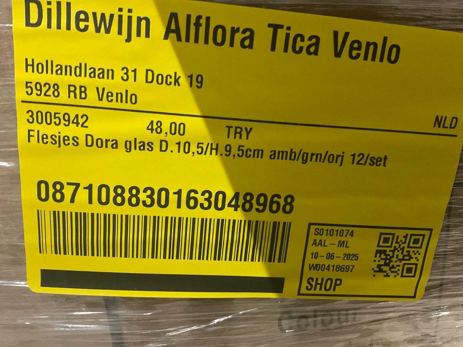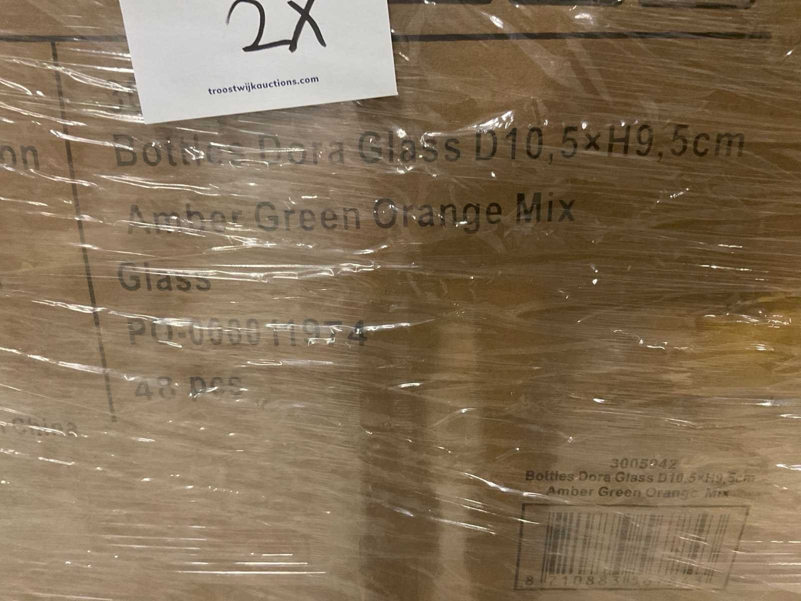 2 pallets met glazen flesjes in diverse kleuren, model Dora D10,5xH9,5 cm, in kleuren perplex pink mix en green orange mix, inclusief pallets.