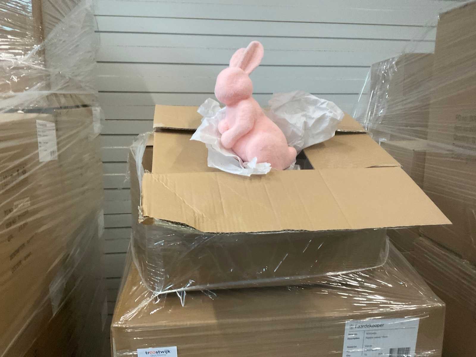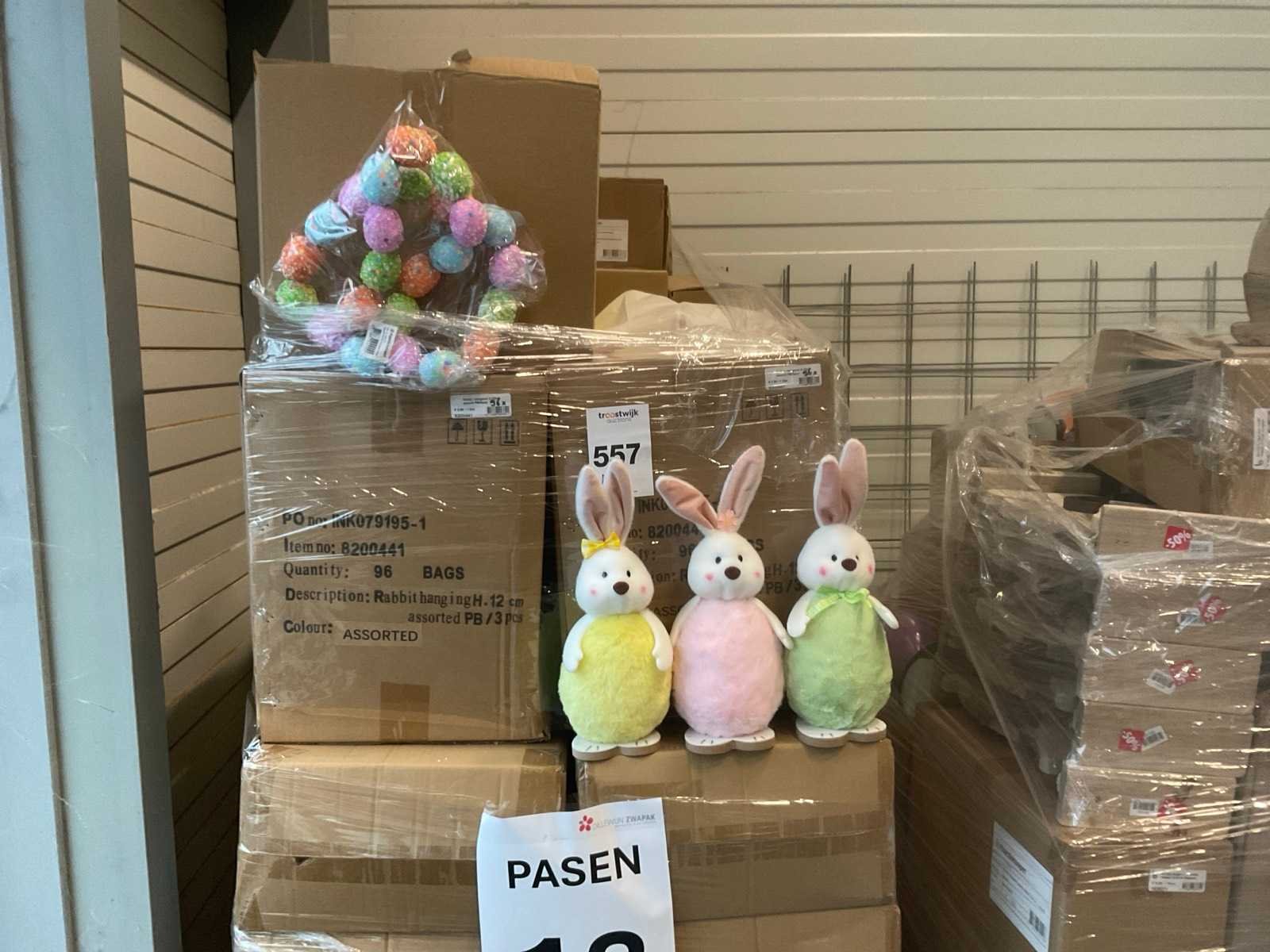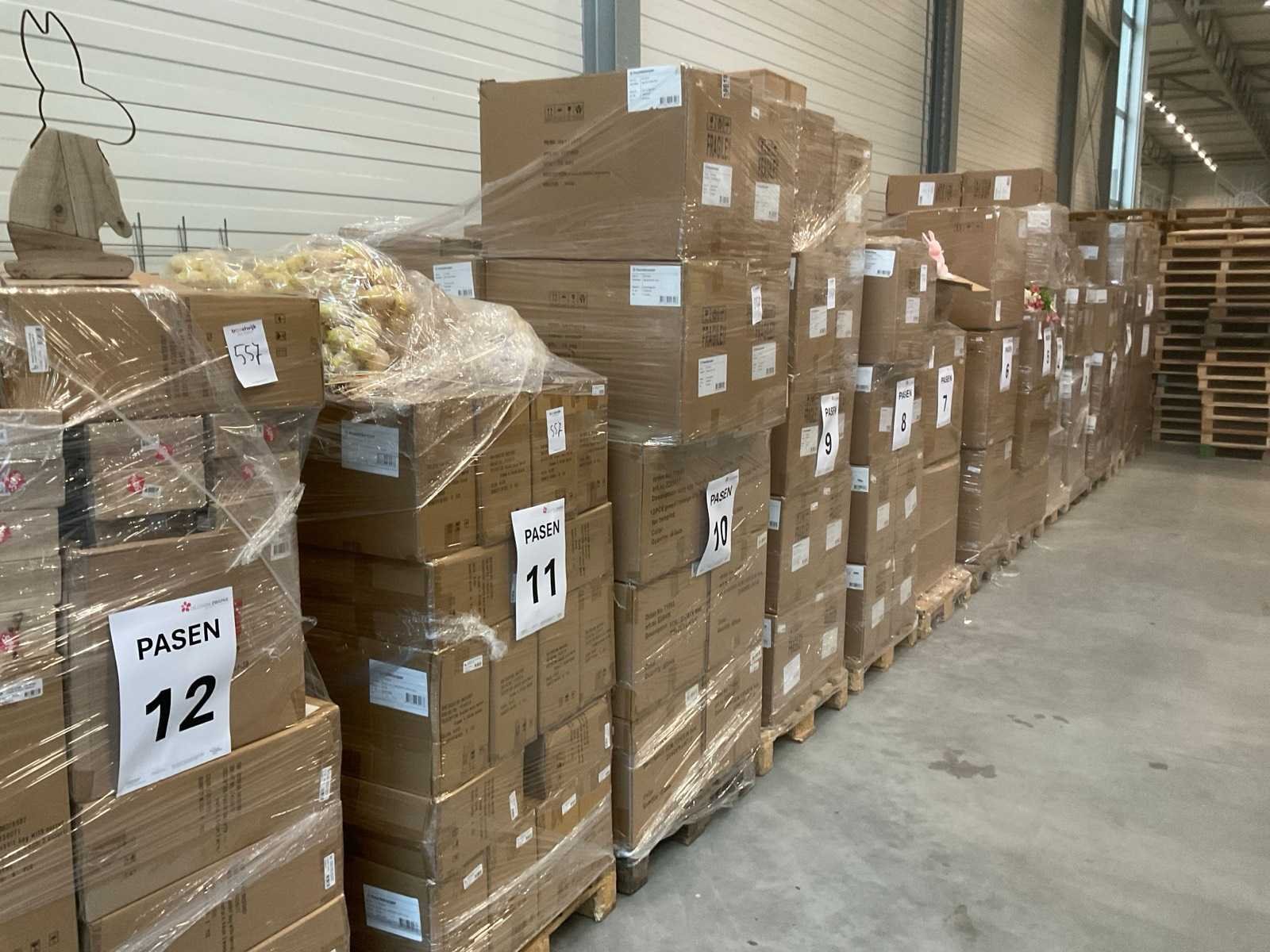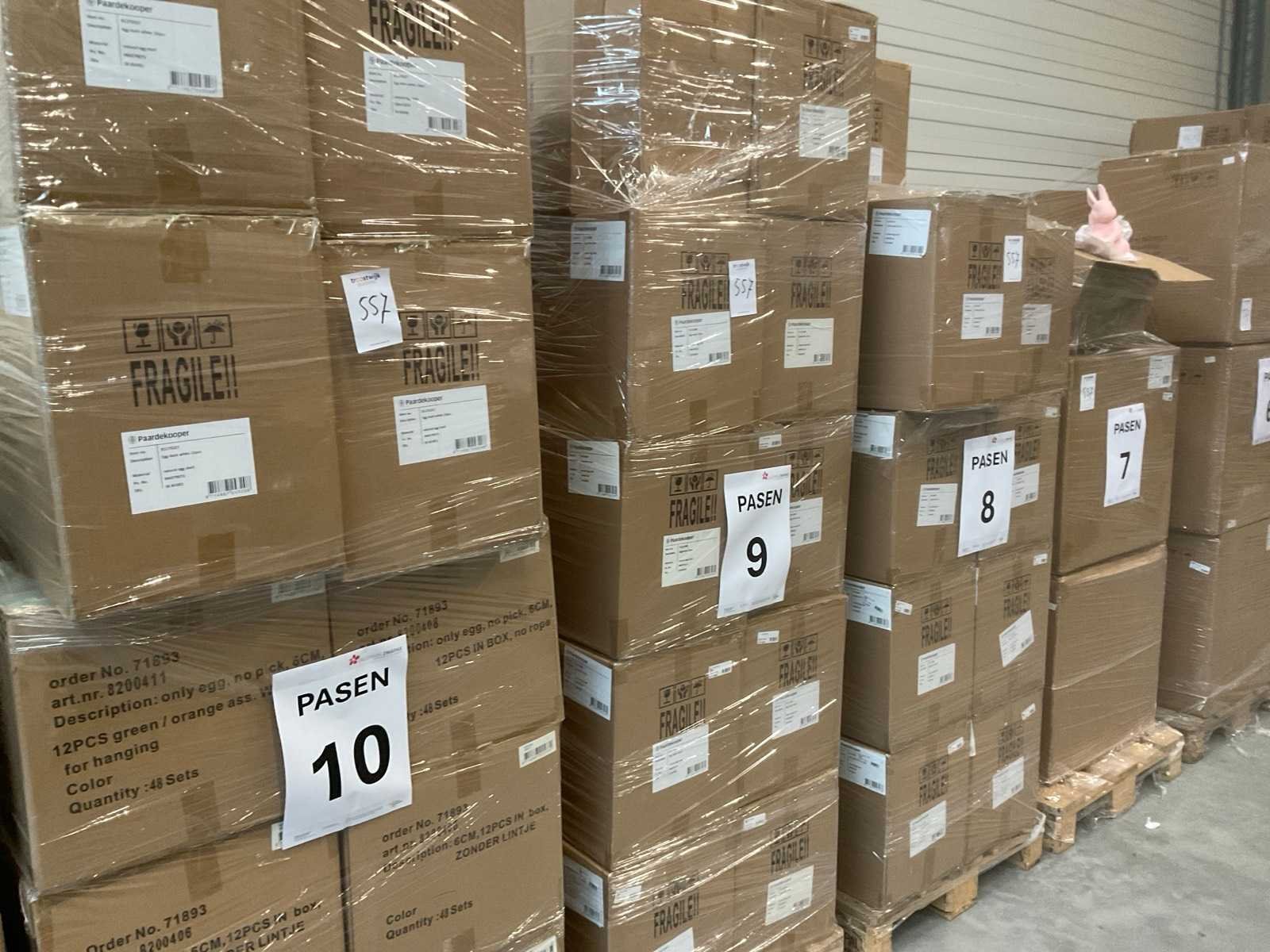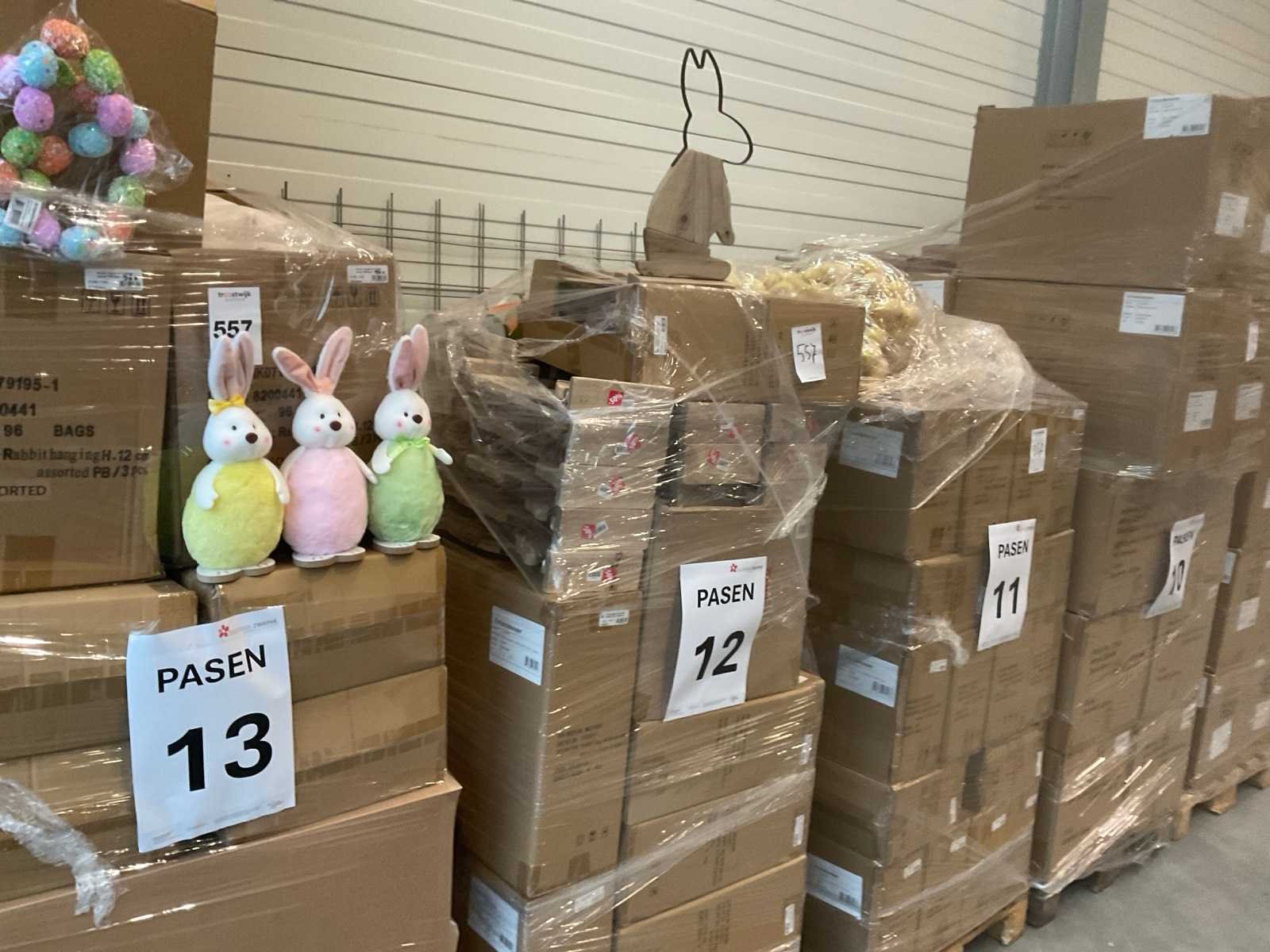 14 pallets, diverse paas artikelen, o.a. decoratie, diverse kleuren paaseieren, paashazen, inclusief pallets