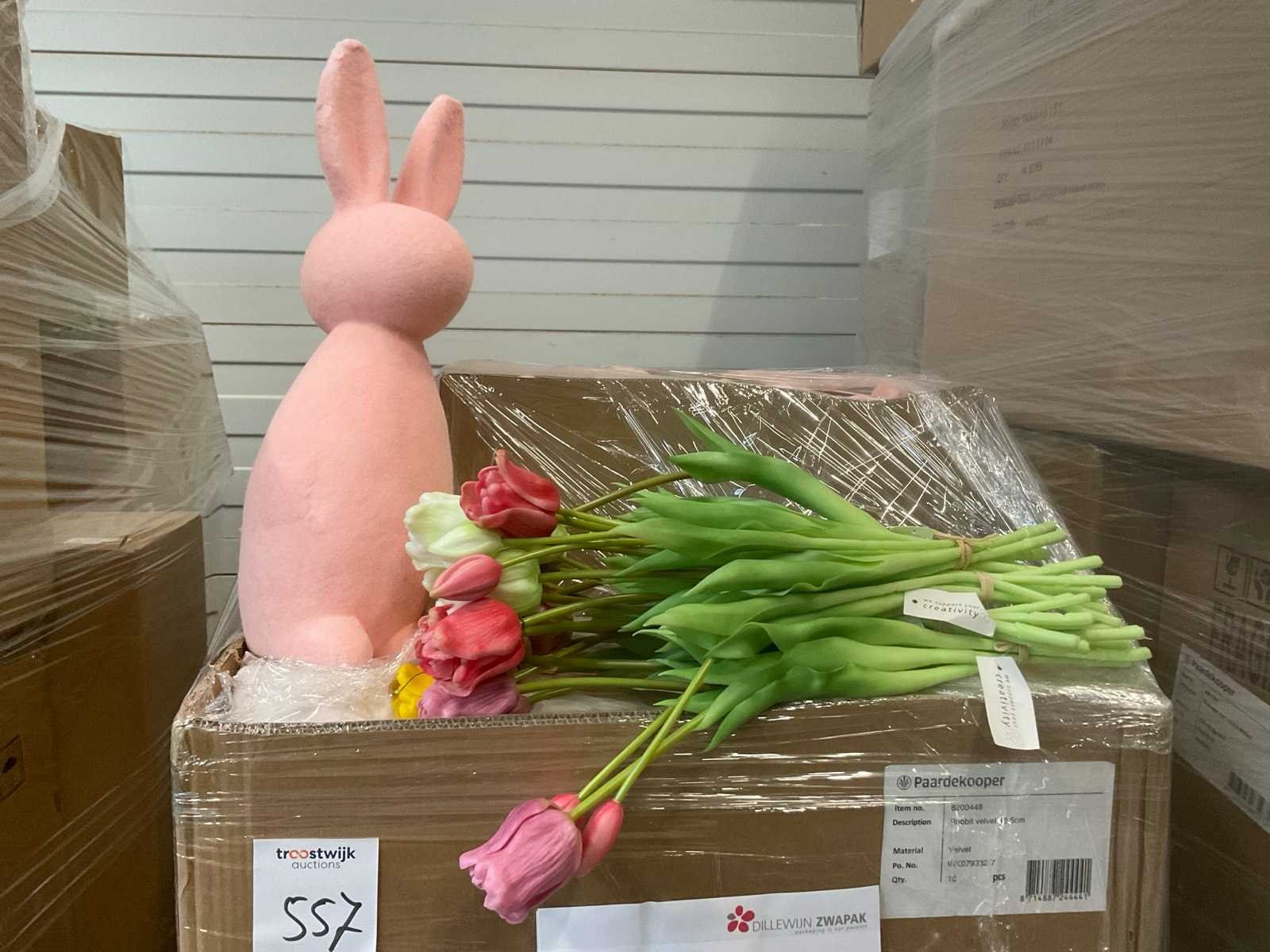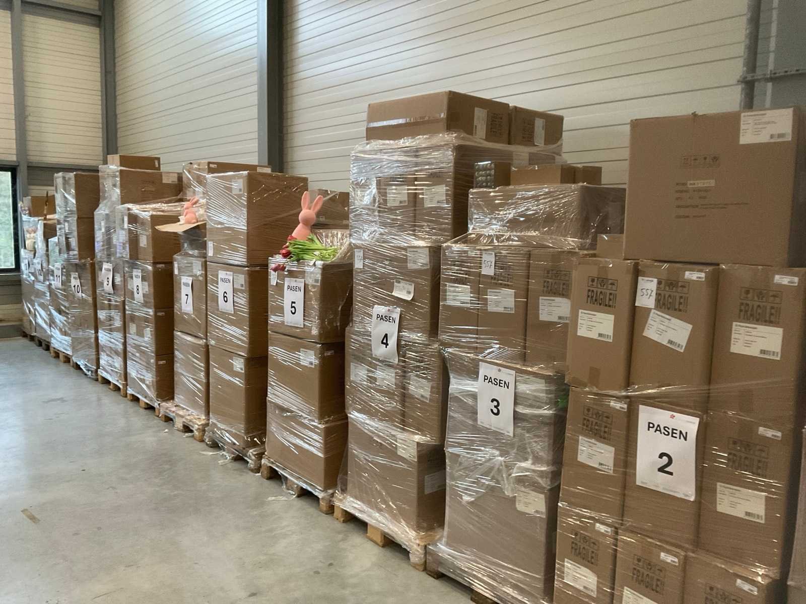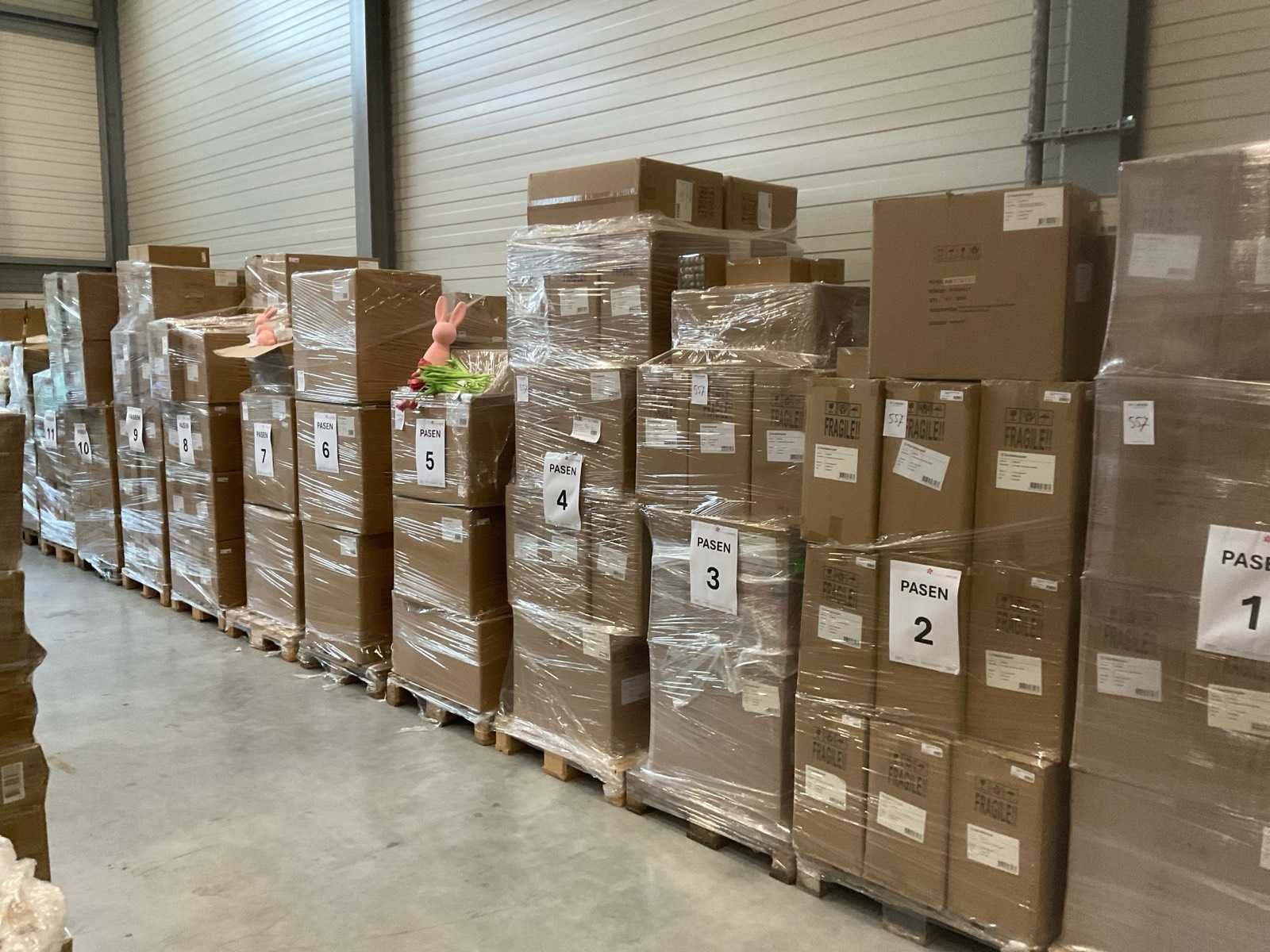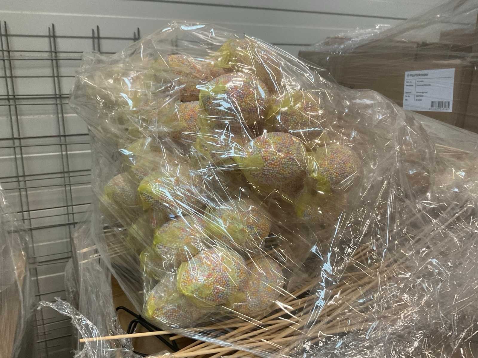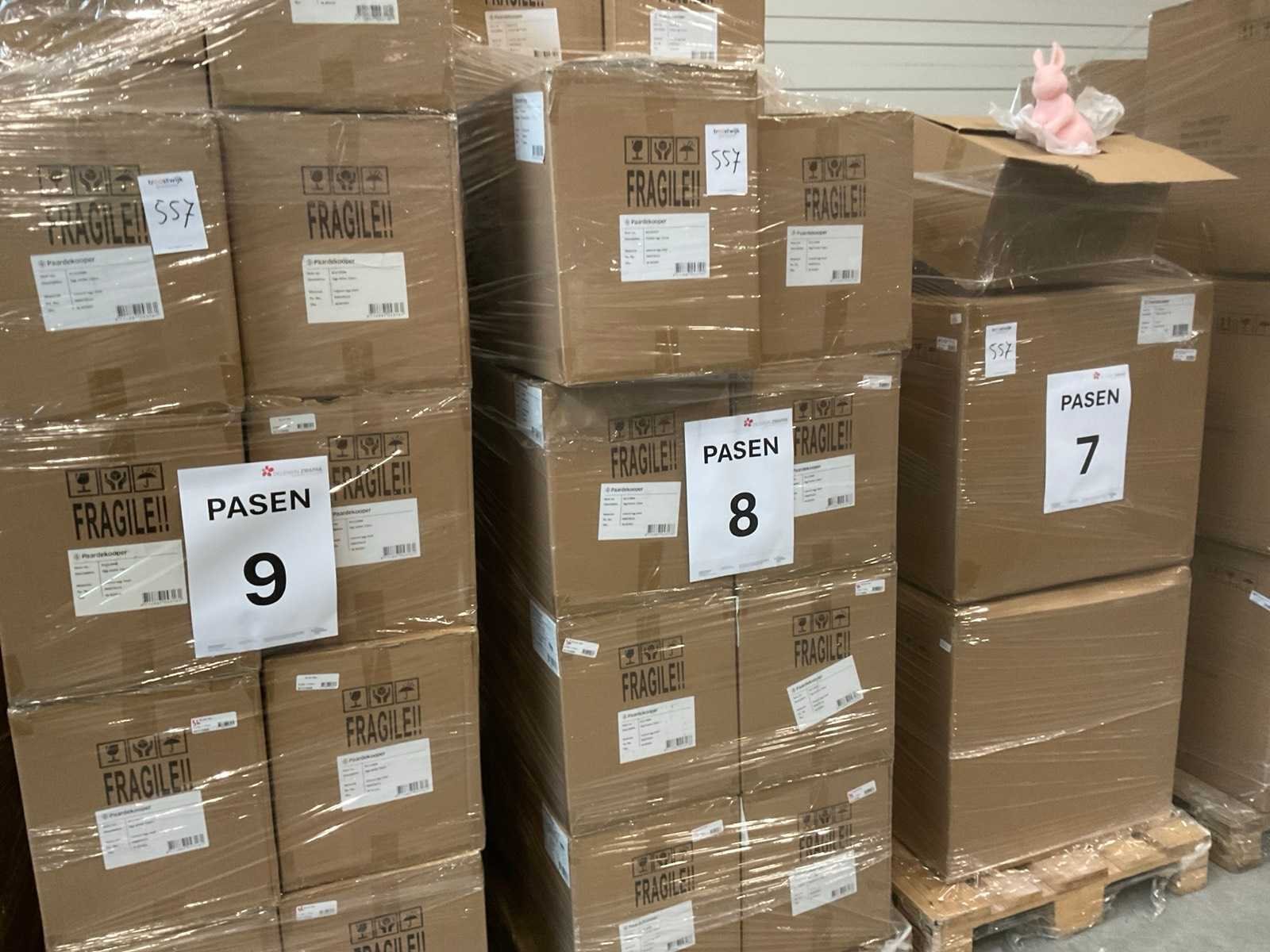 14 pallets, diverse paas artikelen, o.a. decoratie, diverse kleuren paaseieren, paashazen, inclusief pallets