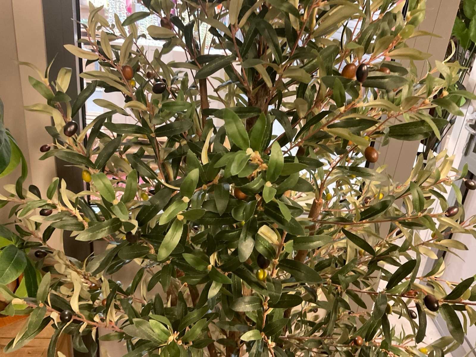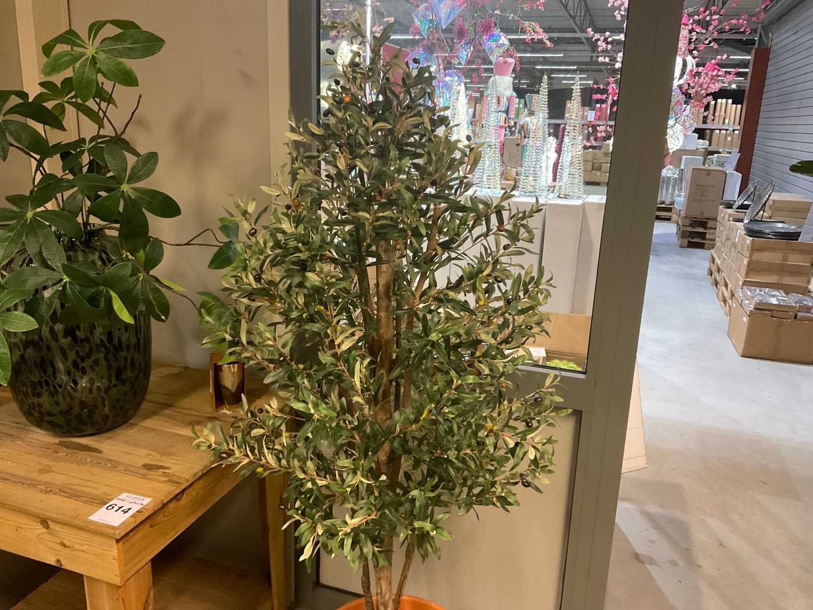 Bestaande uit houten tafel Kunst olijfboom in pot Glazen vaas met kunst takken Merk: ReCreate nature Lengte: 80cm Breedte: 80cm Hoogte: 80cm