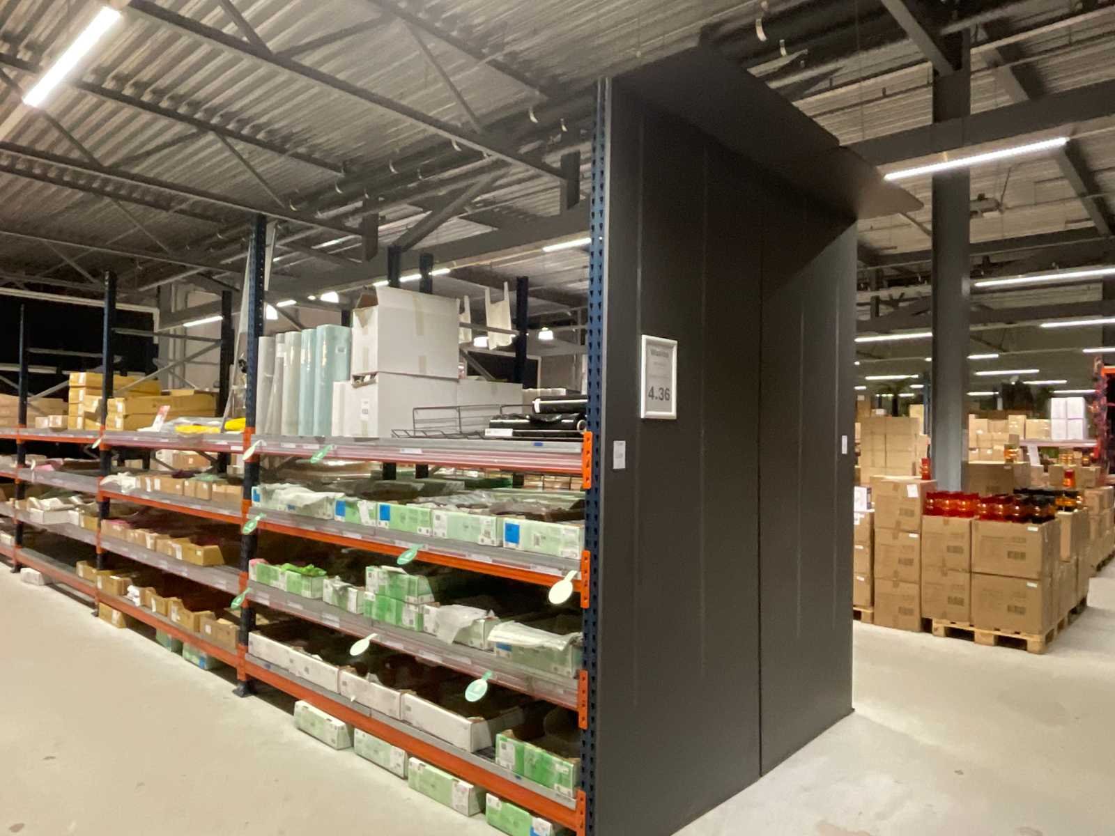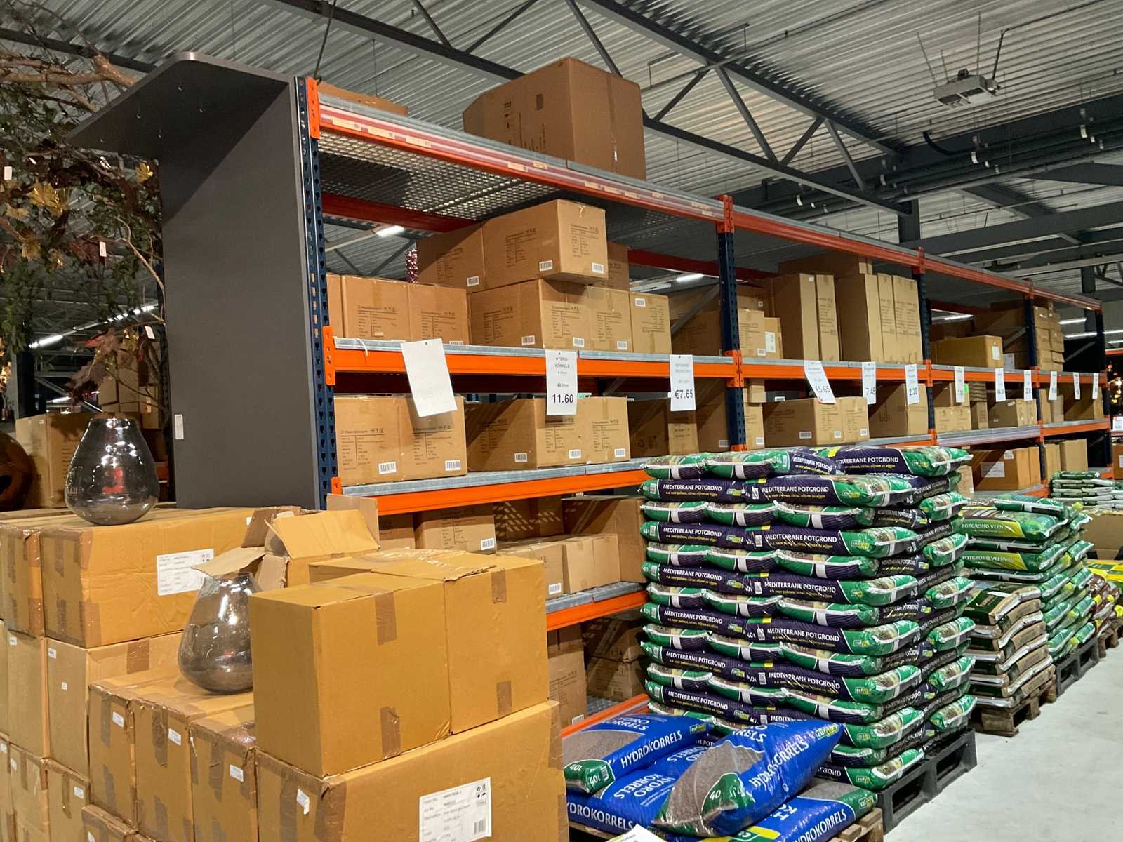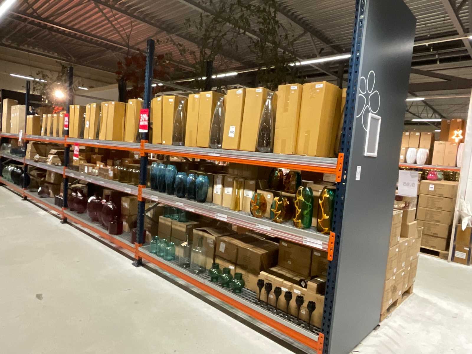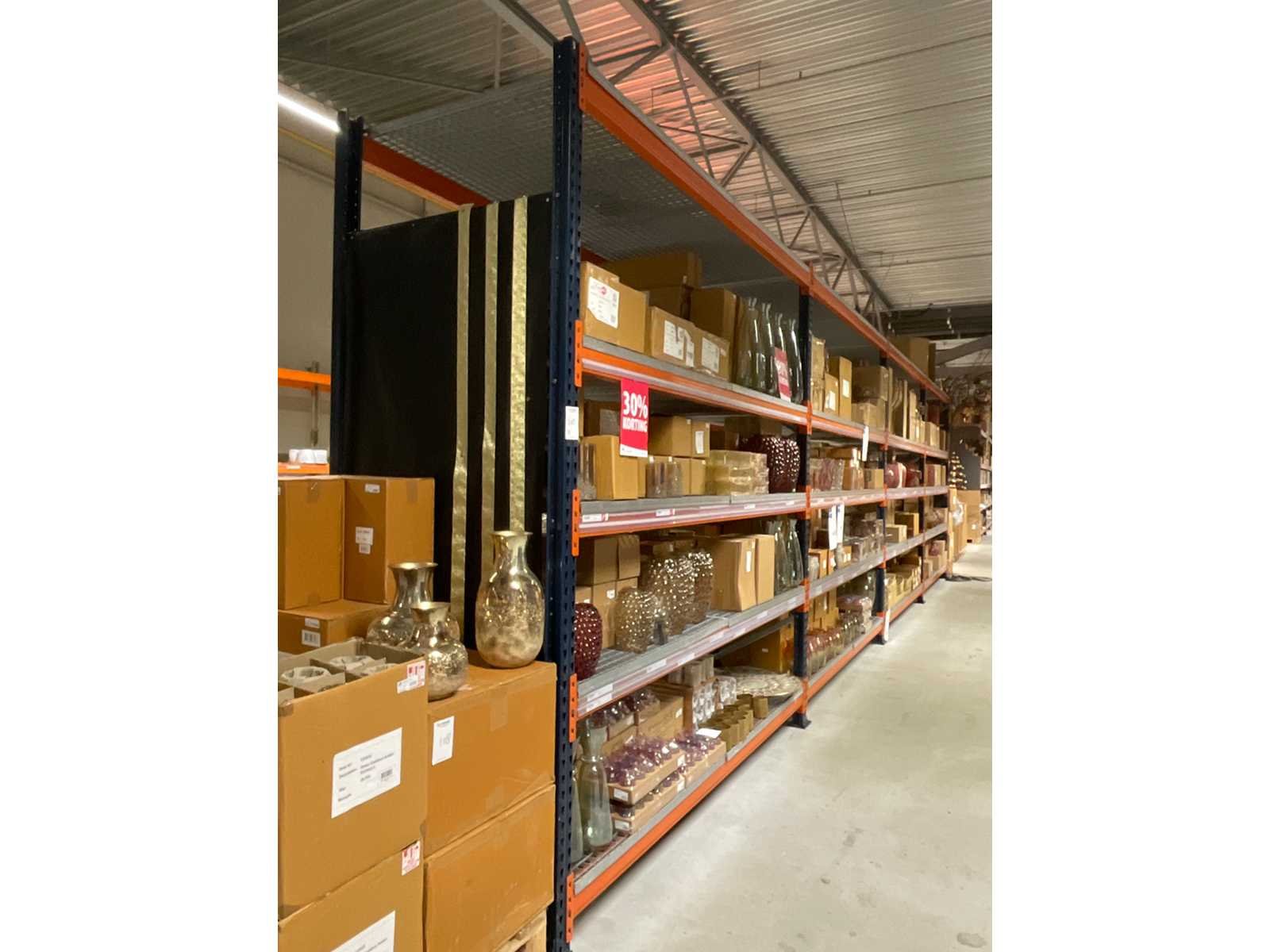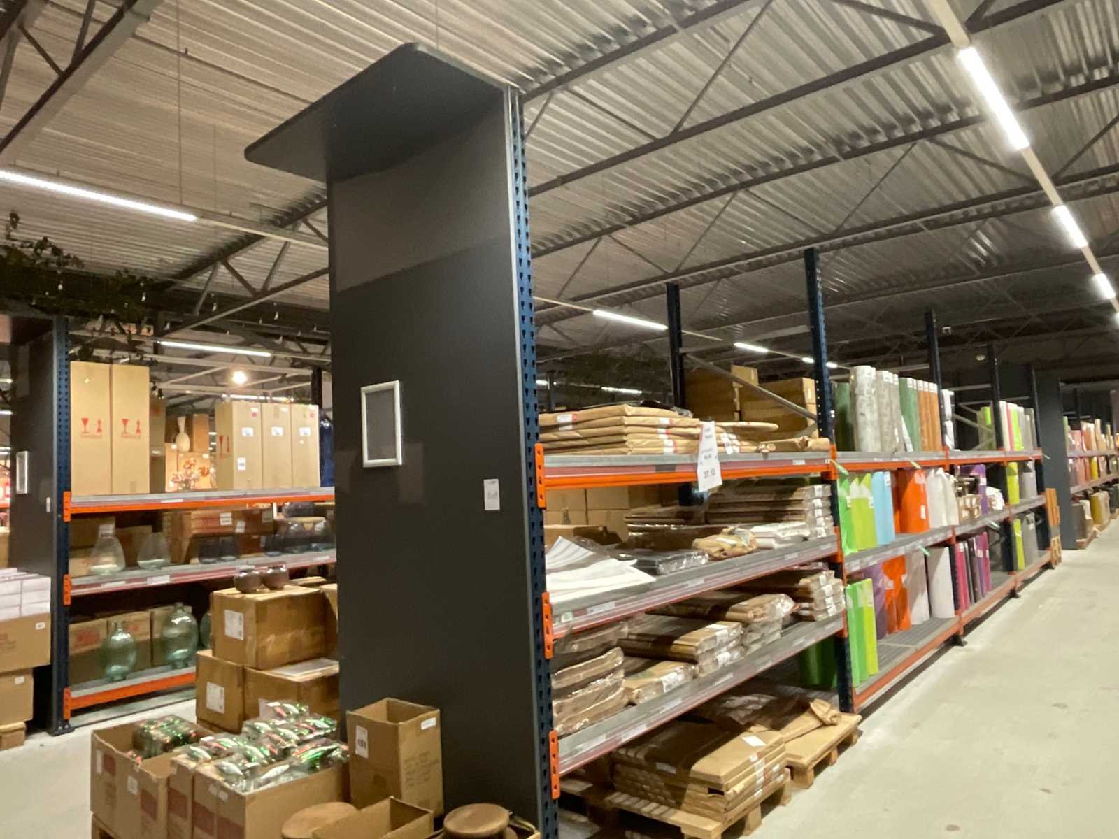Voorzien van grijze zijpanelen (waarvan enkele voorzien van topblad) aantal liggers 20, 32, 24, 24 en 40 stuks (totaal 140) Bestaande uit delen van 5 staanders, totaal aantal staanders 25 stuks metalen rooster legborden Reclameframes met rood doek niet inbegrepen De inhoud van de stellingen is niet inbegrepen. Aantal secties: 4 Sectie afm. b: 2700mm Sectie diepte: 1100mm Sectie afm. h: 3000mm Aantal staanders: 5 Demontabel: true Totale afmeting L: 550cm Totale afmeting Breedte: 110cm Totale afmeting Hoogte: 300cm