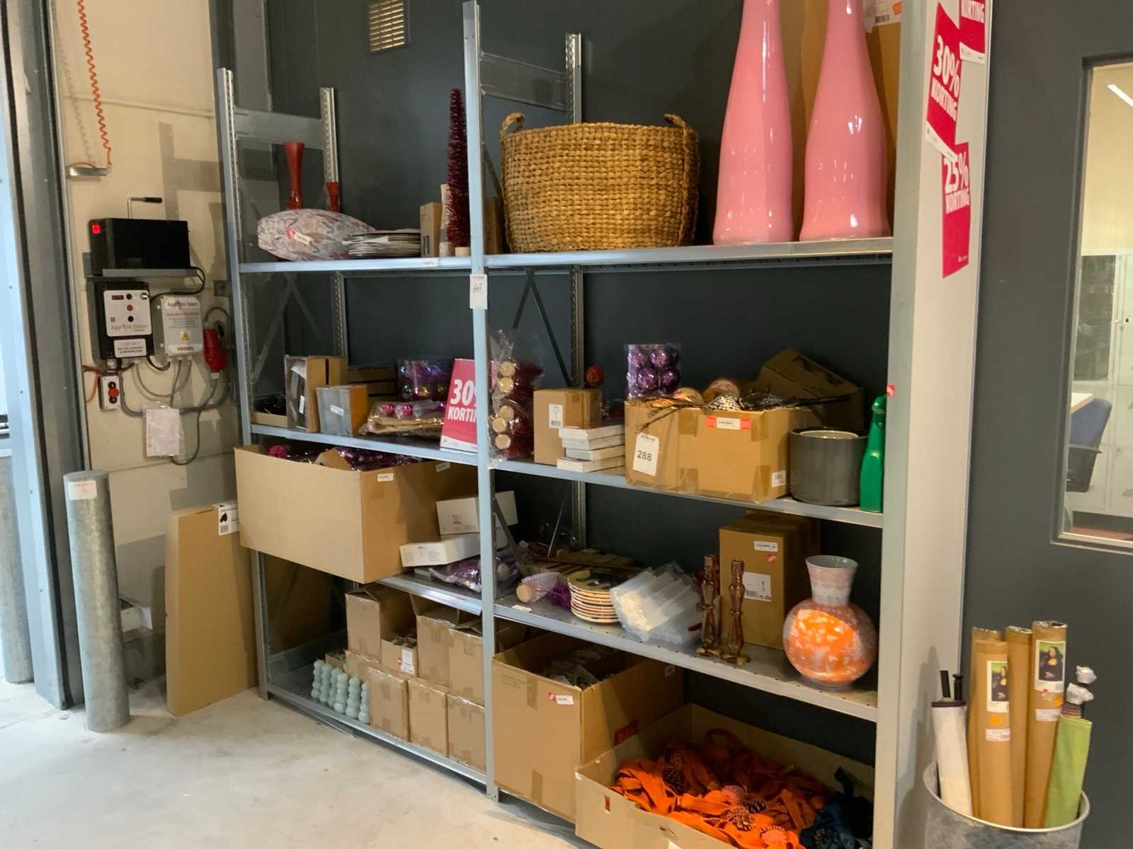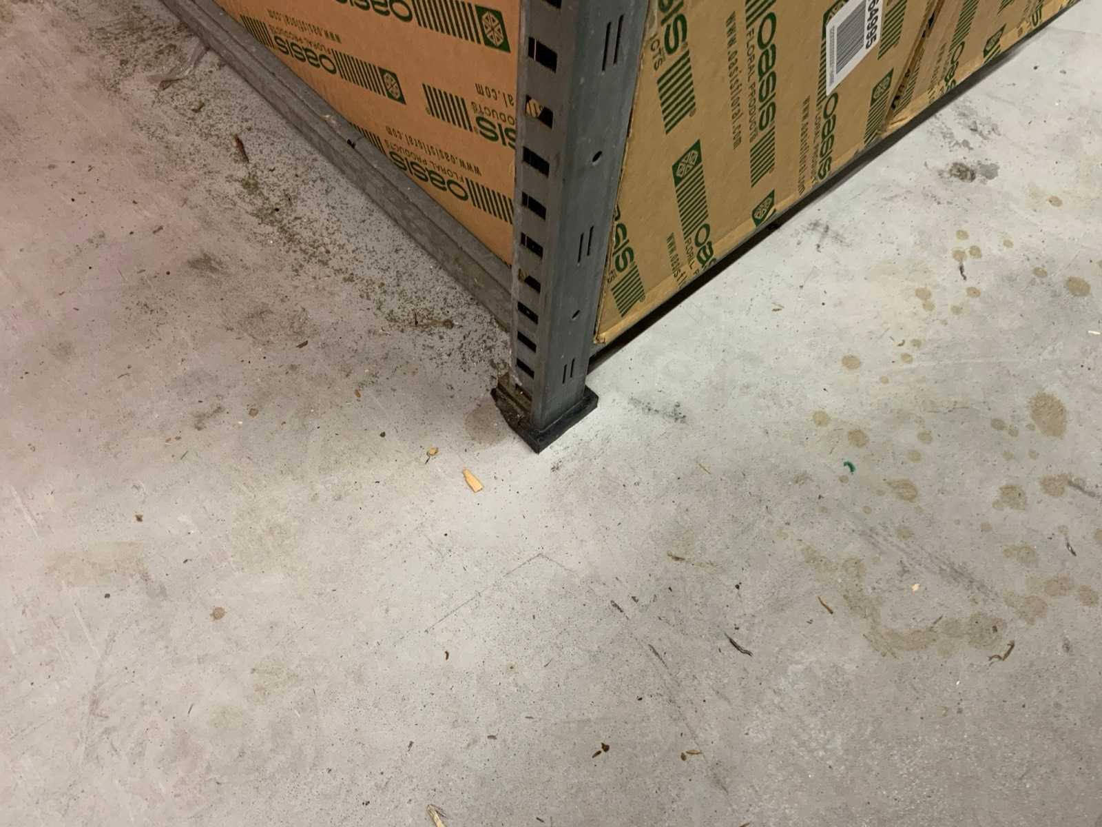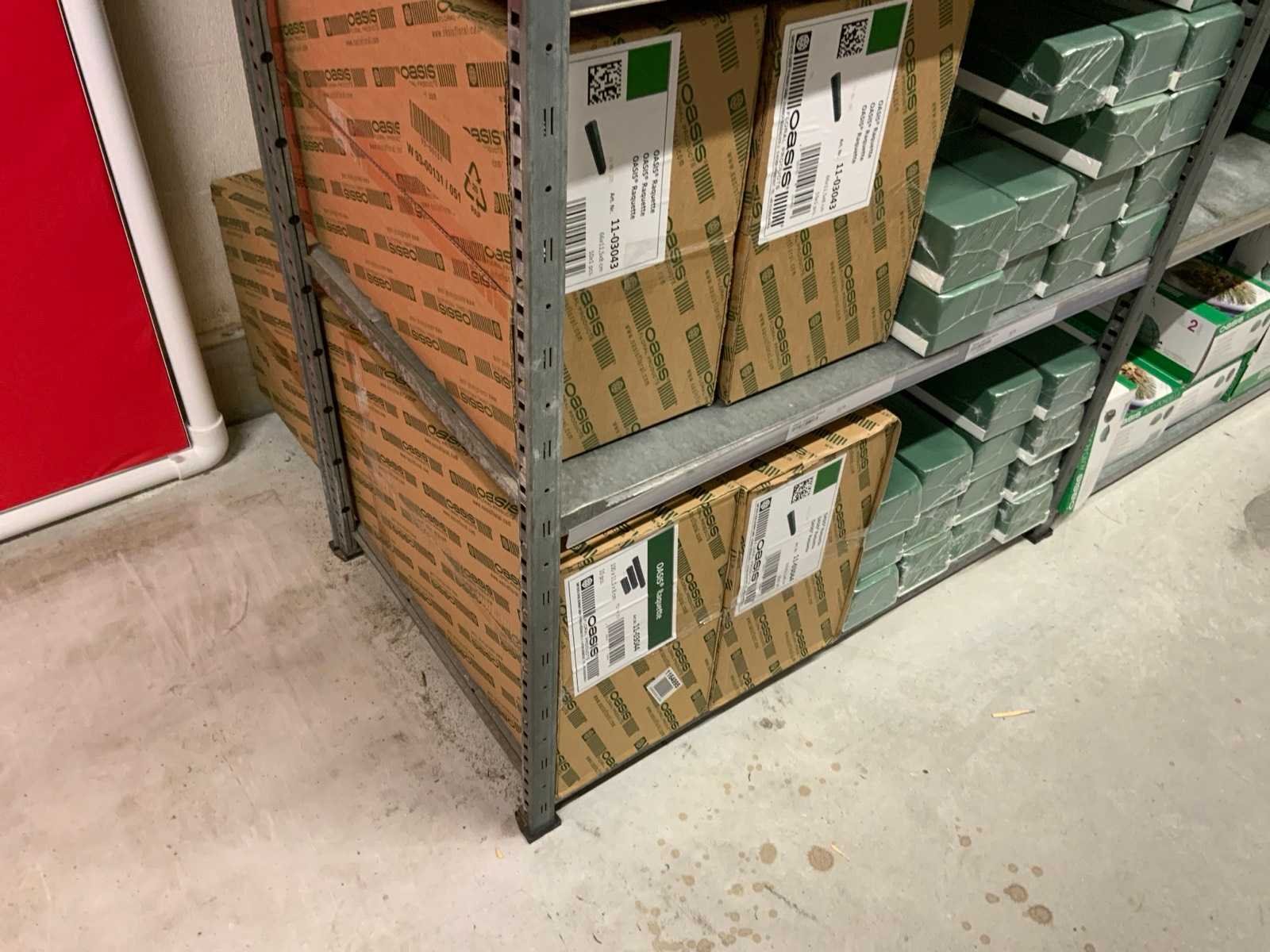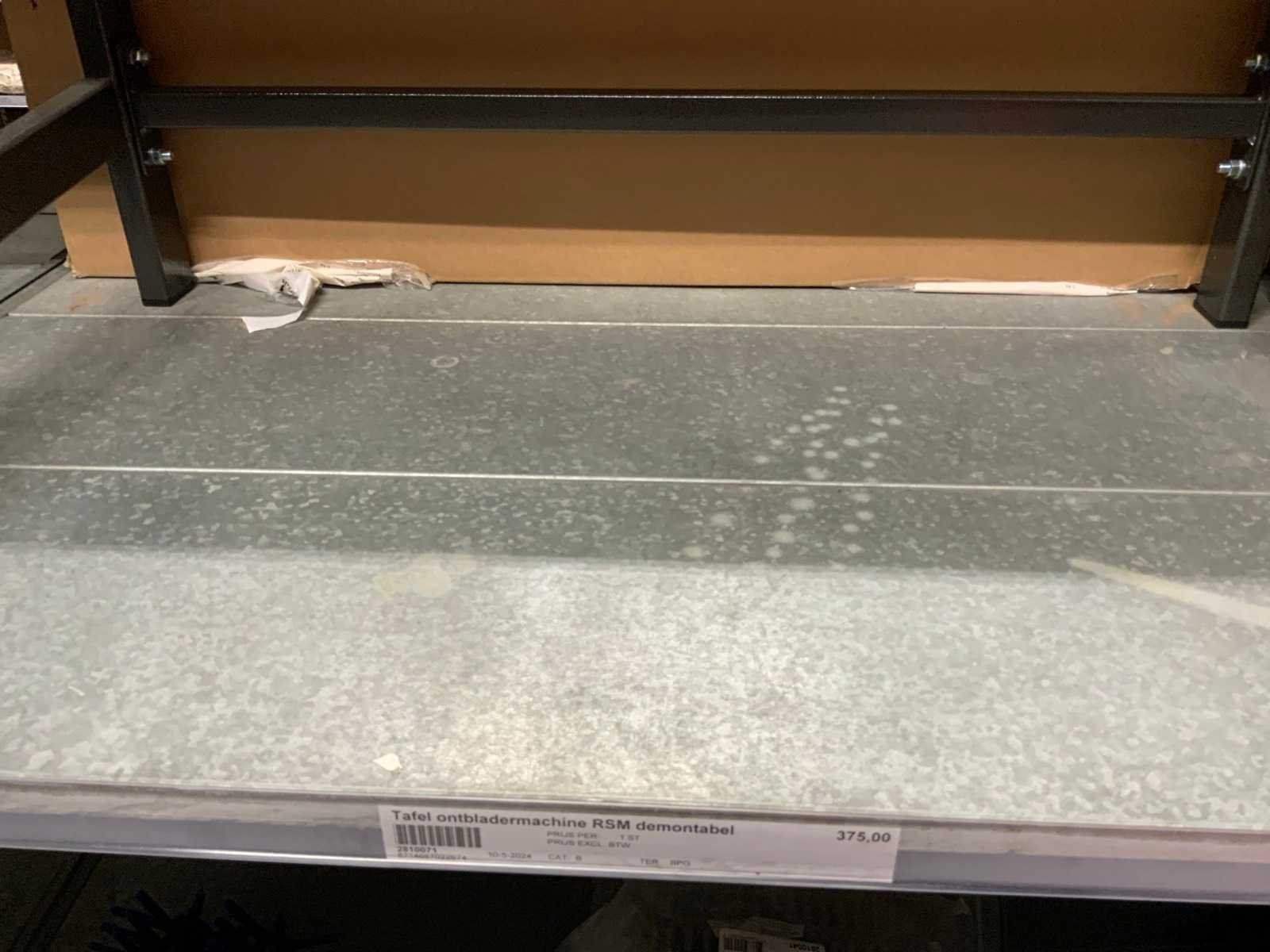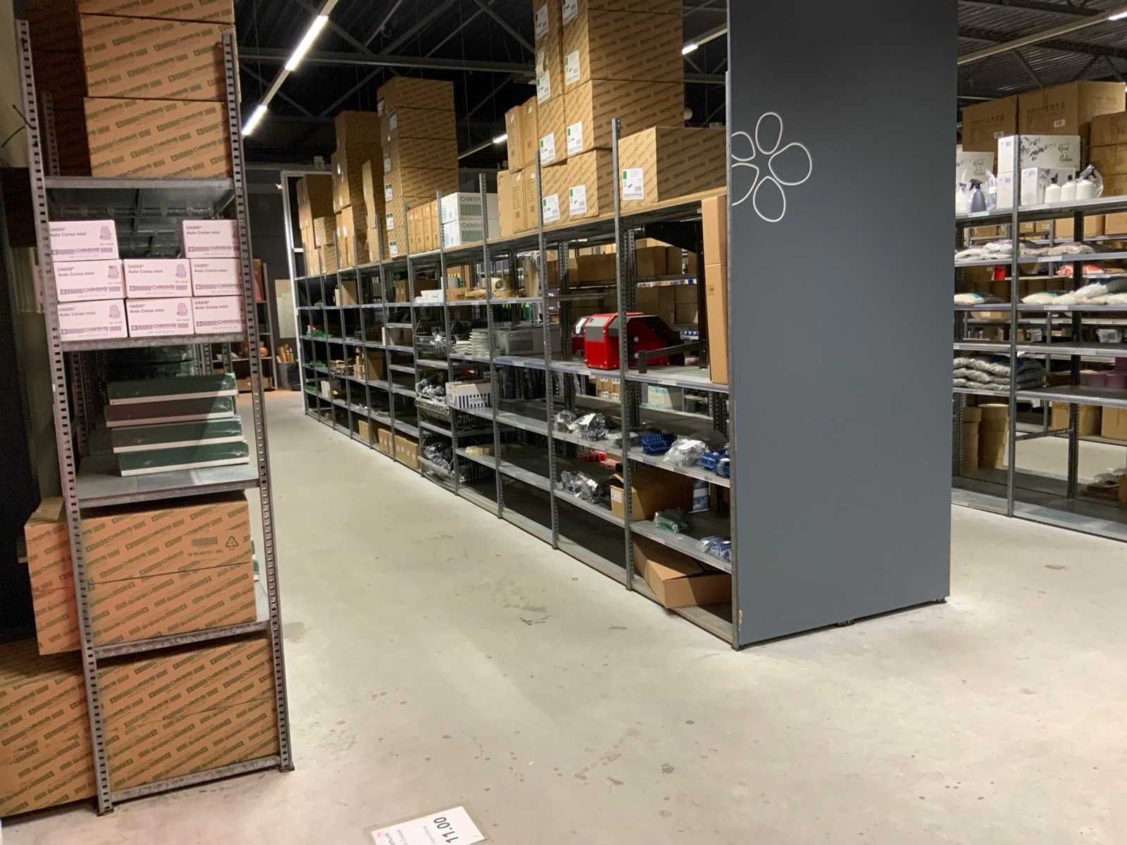 Bestaande uit: 4 dubbele rijen van 11 secties met eind plaat, 1 enkele rij en 1 losse sectie van een ander type Type: Legbord Aantal secties: 99 Sectie afm. b: 1000mm Sectie diepte: 600mm Aantal staanders: 108 Demontabel: true Materiaal: Metaal Totale afmeting Hoogte: 250cm