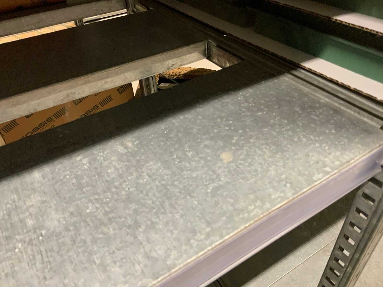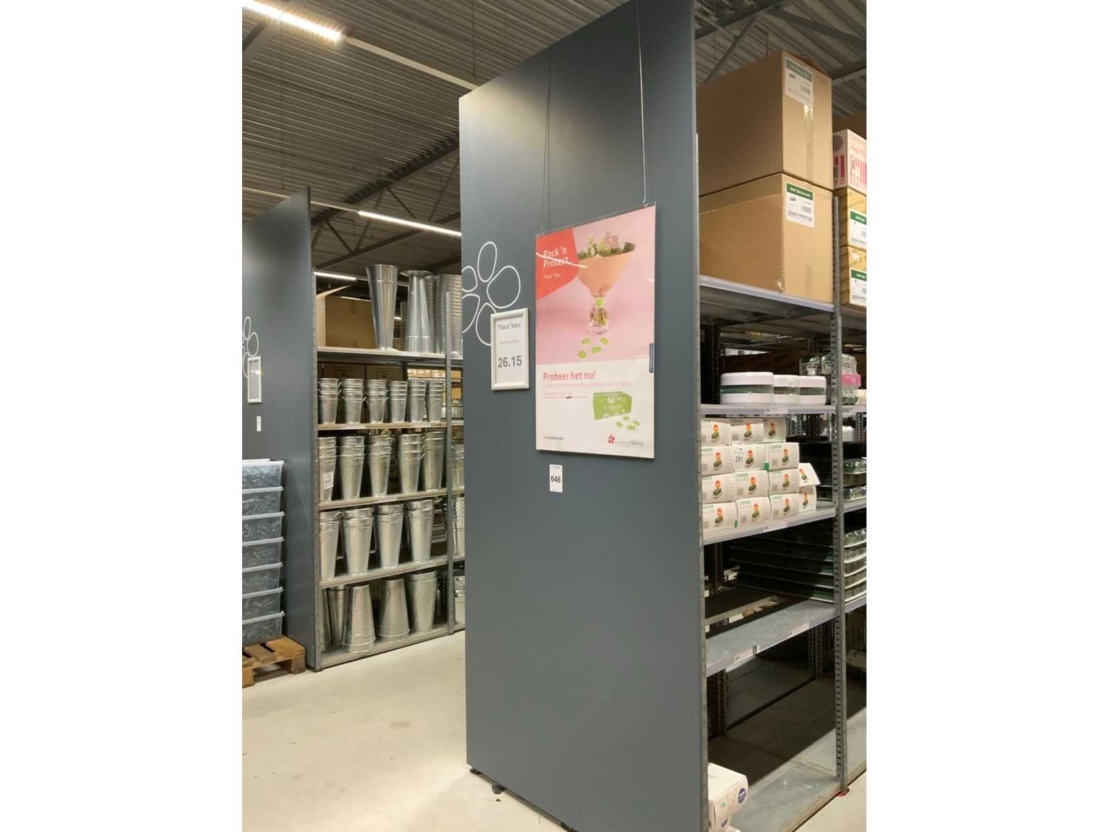 Bestaande uit: 4 dubbele rijen van 10 secties met eind platen Type: Legbord Aantal secties: 80 Sectie afm. b: 1000mm Sectie diepte: 600mm Aantal staanders: 88 Demontabel: true Materiaal: Metaal Totale afmeting Hoogte: 250cm