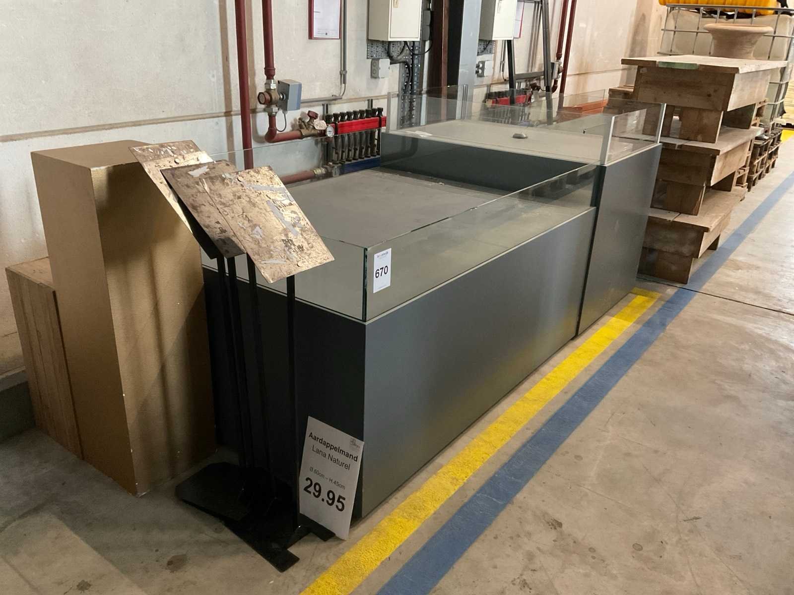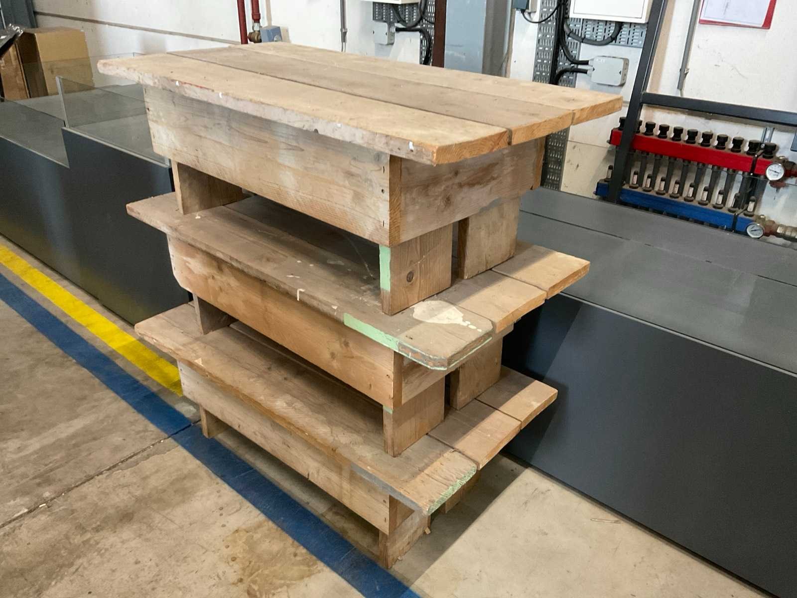 Bestaande uit 3 verrijdbare meubels voorzien van glazen rand in diverse afmetingen waaronder 160x120x85 cm Diverse steigerhouten meubels Halve europallets en defecte vaas Zuilen en metalen standaaards