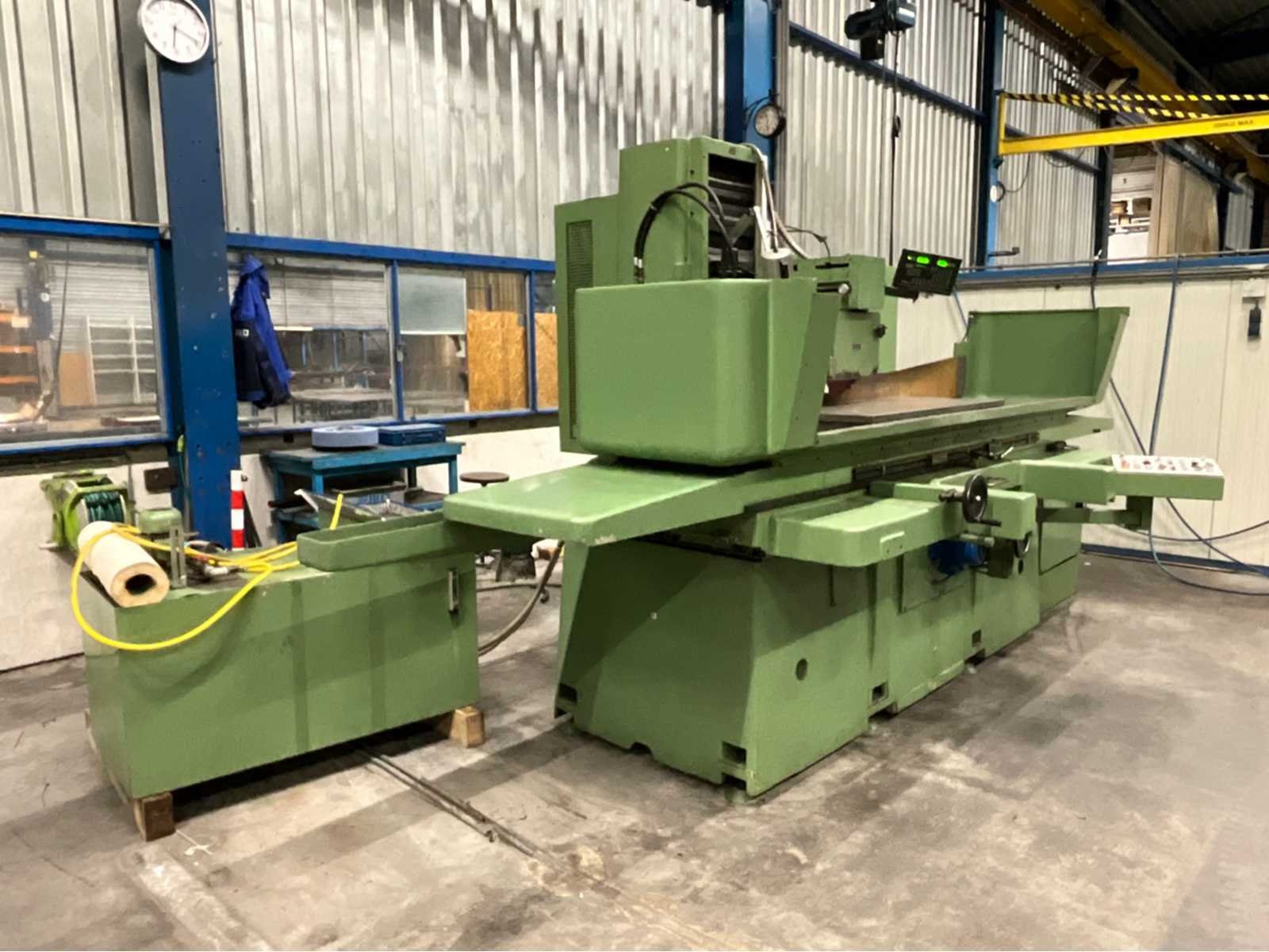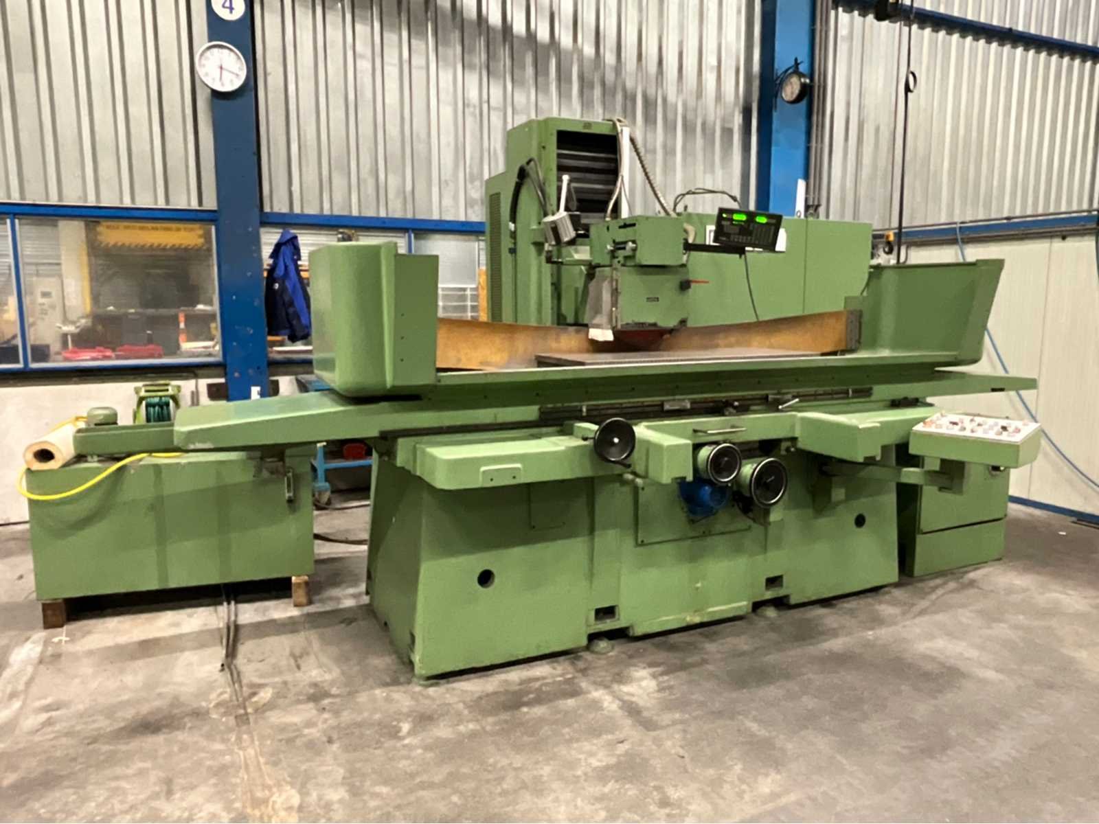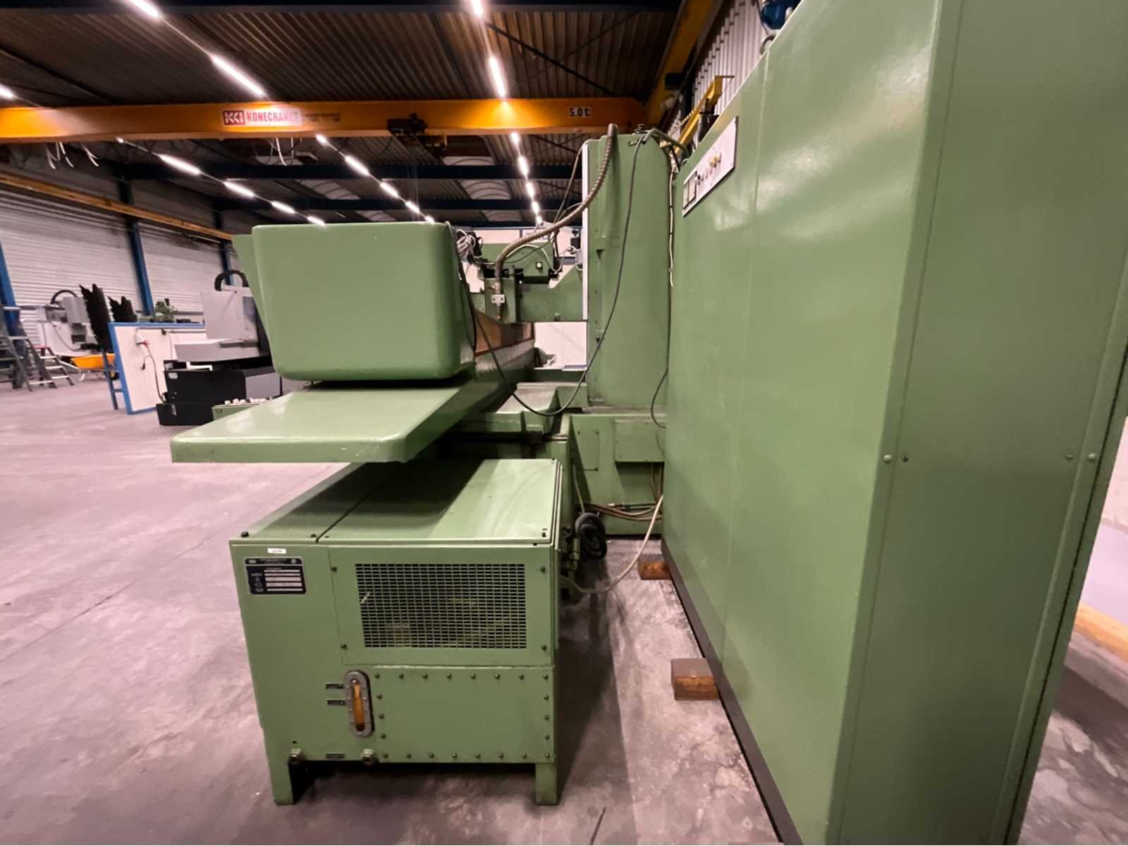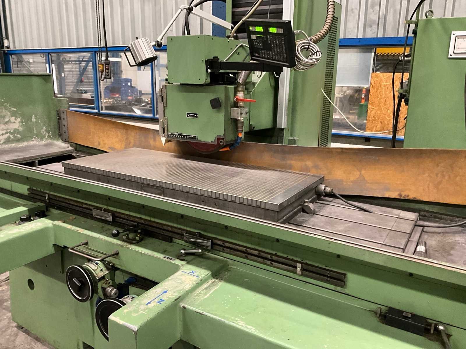 Voorzien van electro magneetplaat afmeting 1200x500 mm; voorzien van T-gleuf opspantafel afmeting 2000x500 mm; X-as 2000 mm / Y-as 600 mm / Z-as 400 mm; steen diameter circa 350 mm; voorzien van controle unit op arm; voorzien van elektronische uitlezing Delos DS-2V; werklamp; koelvloeistofpomp met filterunit; separate elektro schakelkast; Merk: Blohm / Hauni Type: HFS 512 Bouwjaar: 1980 Serienummer: 11995 Machinegewicht: 7000kg Afmeting l: 4200mm Afmeting b: 2400mm Afmeting h: 2400mm