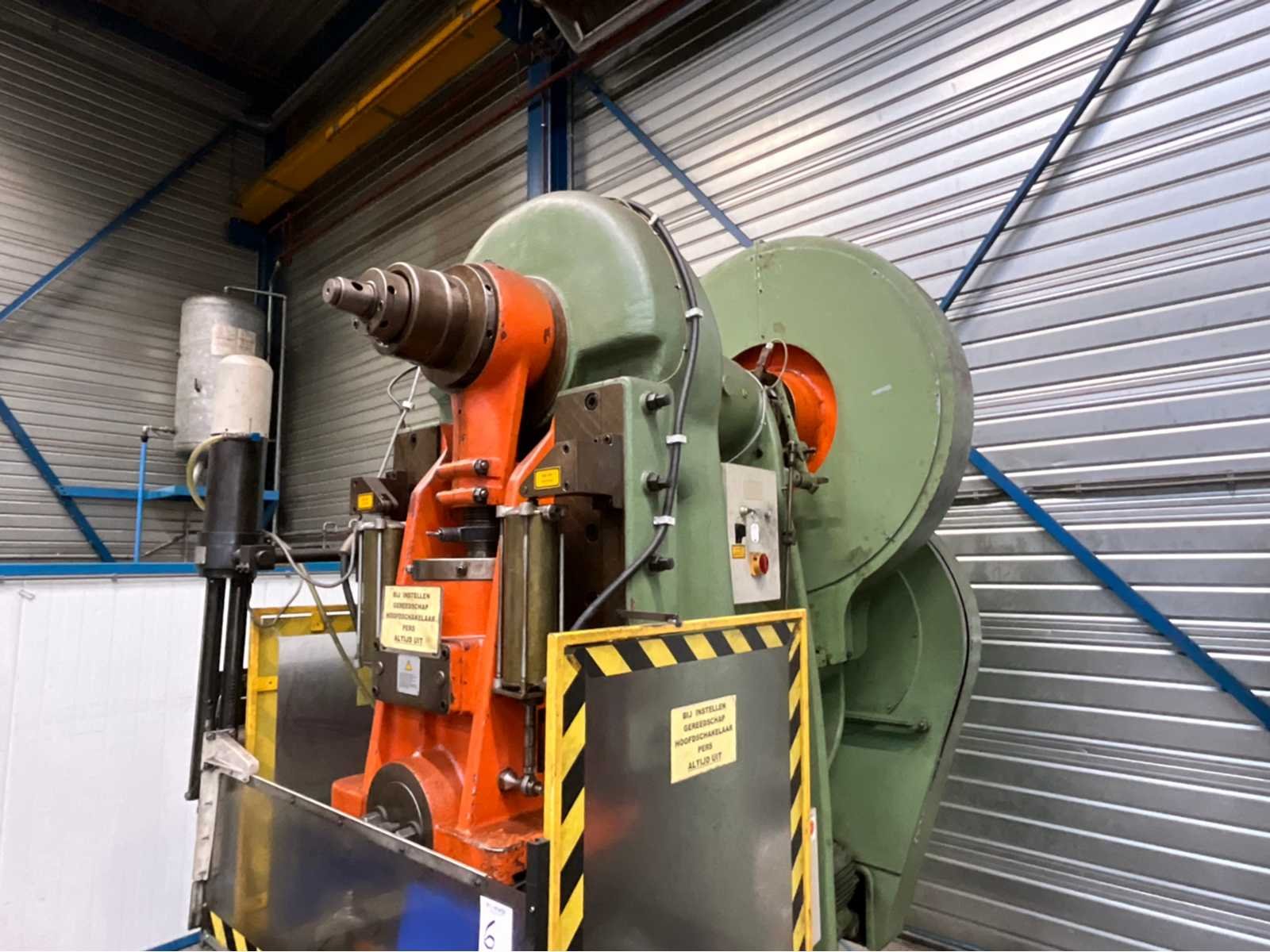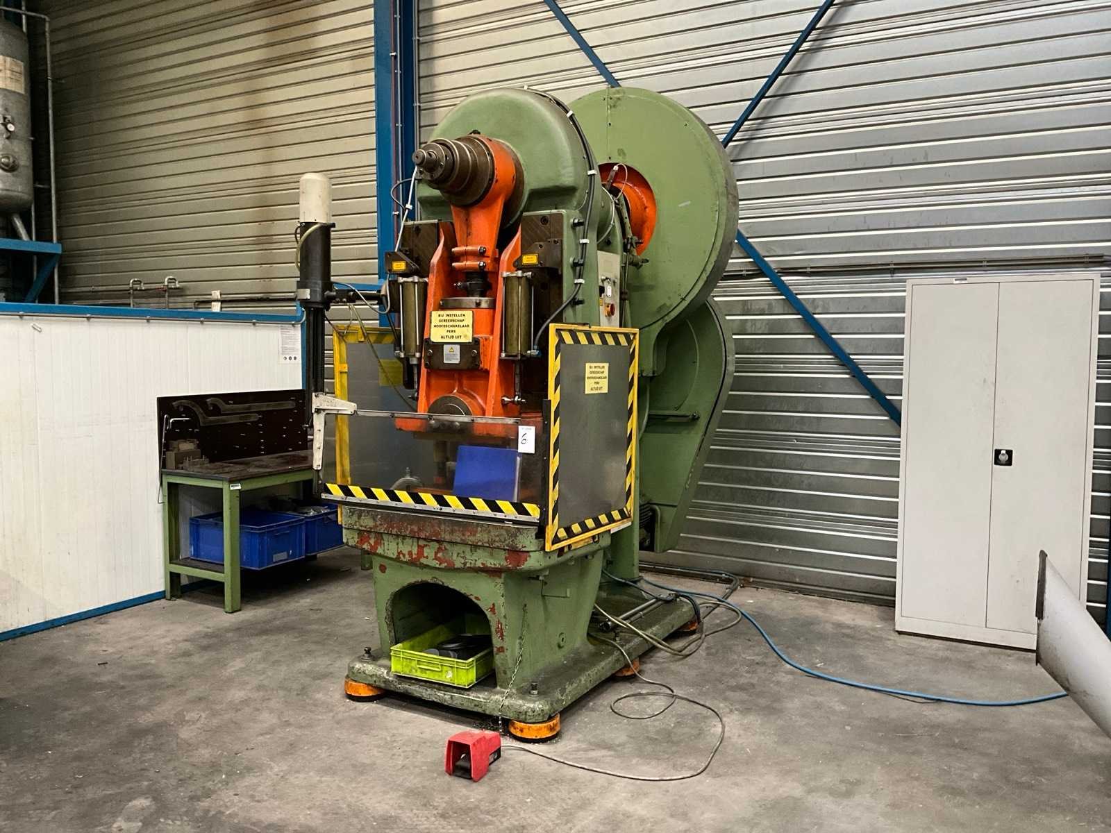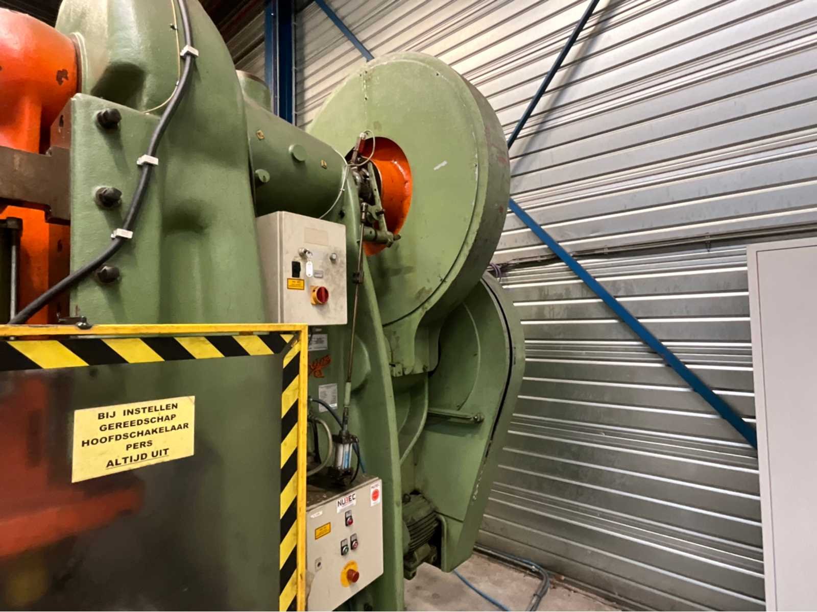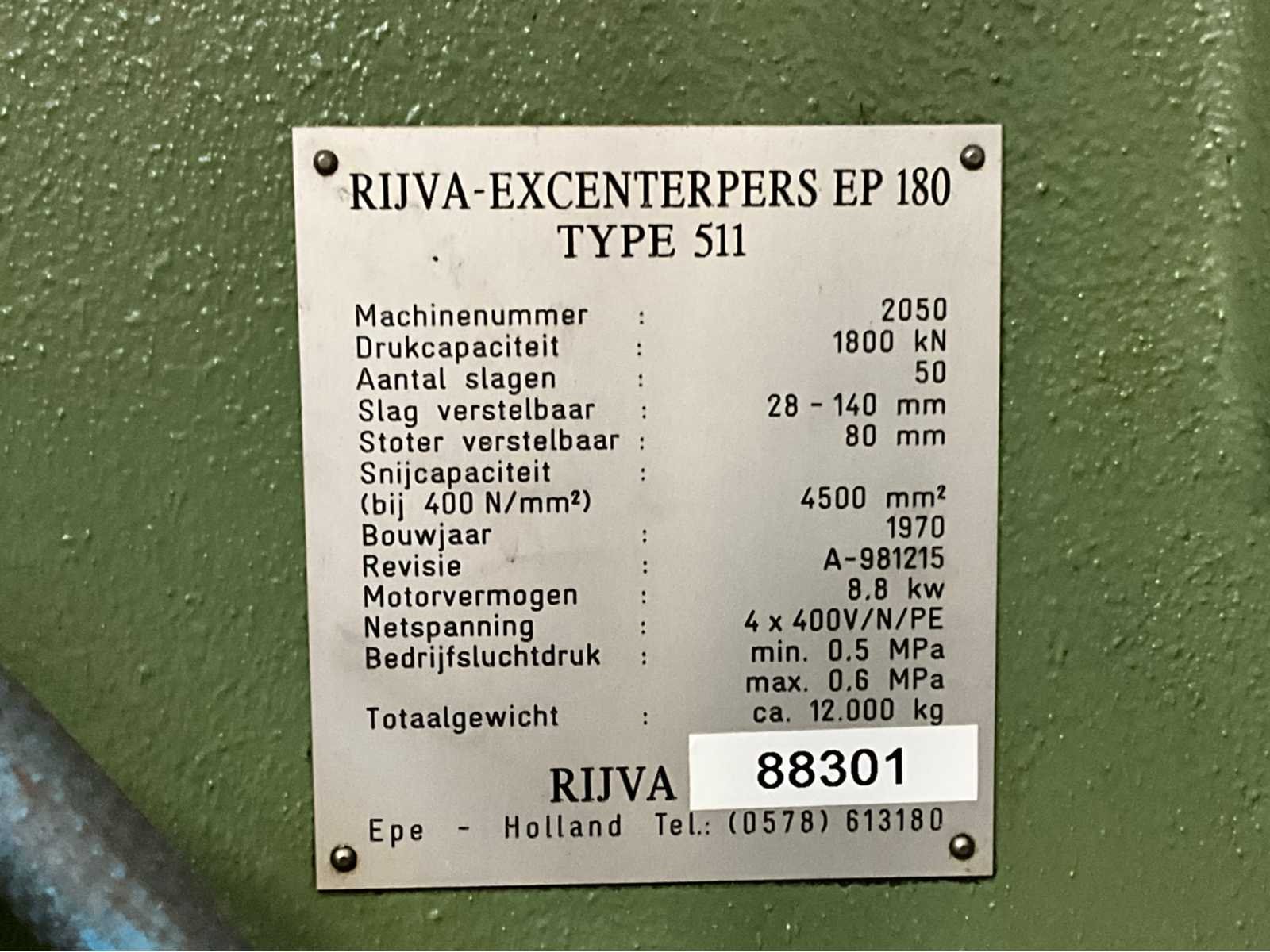 Drukcapaciteit; 1800 kN; aantal,slagen 50; slag verstelbaar 28 - 140 mm; stoter verstelbaar 80 mm; voorzien van T-gleuf opspantafel; veiligheidsscherm; voetbediening; 2x elektro schakelkast; Merk: Rijva Type: EP 180 type 511 Bouwjaar: 1970 Serienummer: 2050 Capaciteit.: 180t Uitlading: 0mm Slag: 140mm Tafel afmeting l: 1050mm Tafel afmeting b: 700mm Motorvermogen (kW): 8.8kW Aansluiting: 400V Machinegewicht: 12000kg Afmeting l: 1300mm Afmeting b: 2300mm Afmeting h: 3100mm