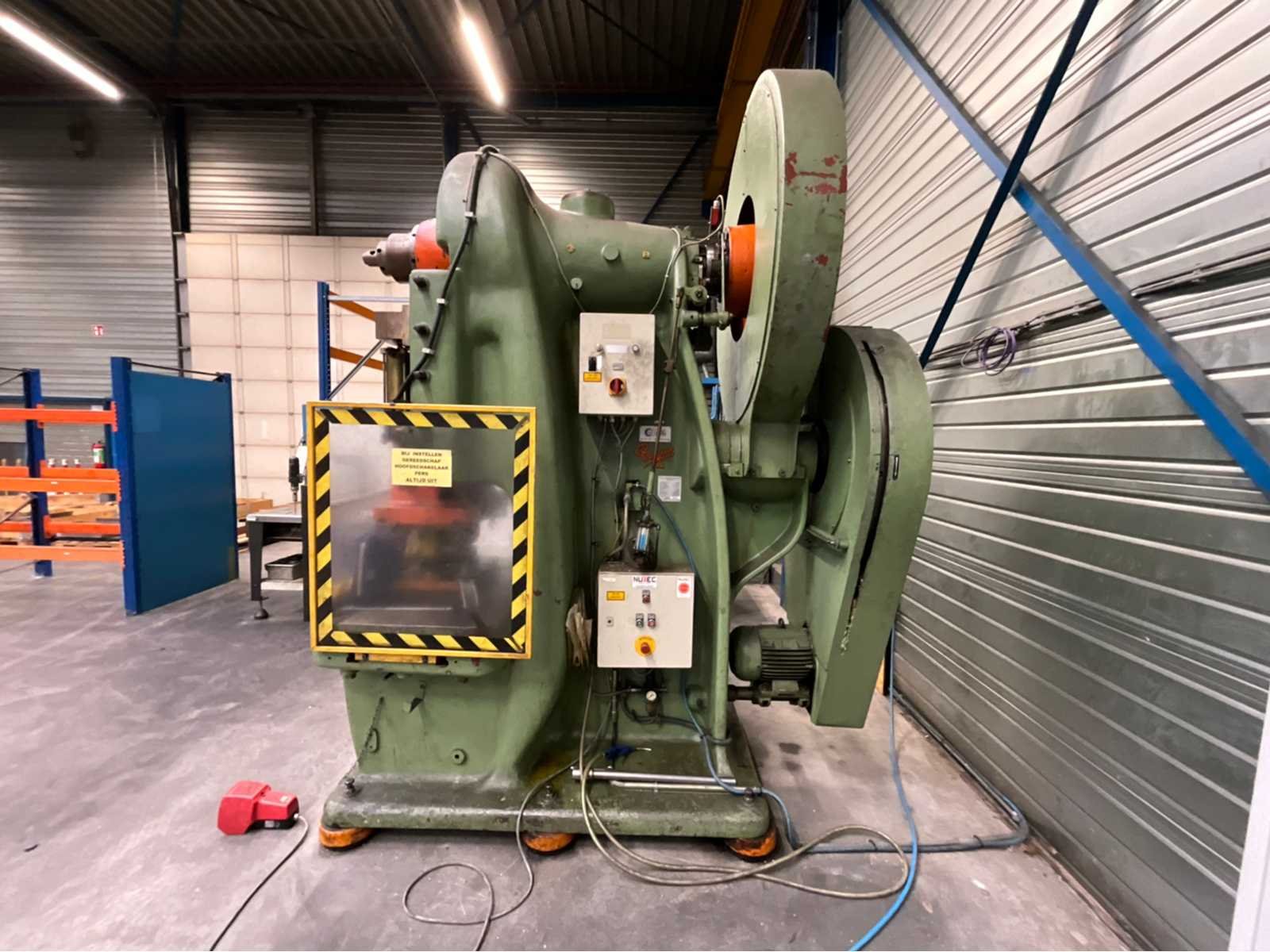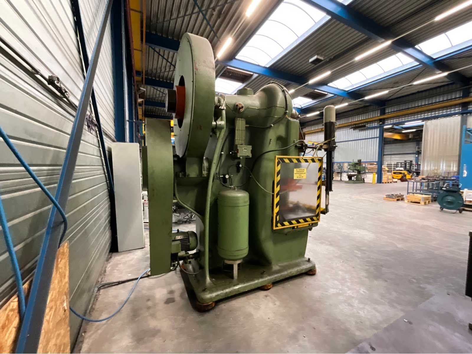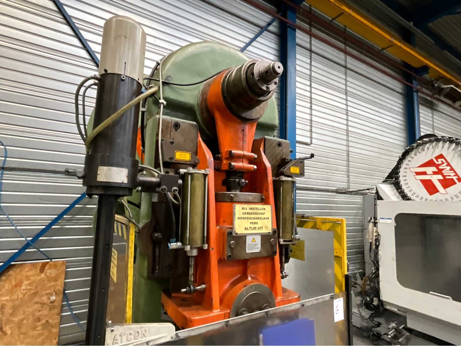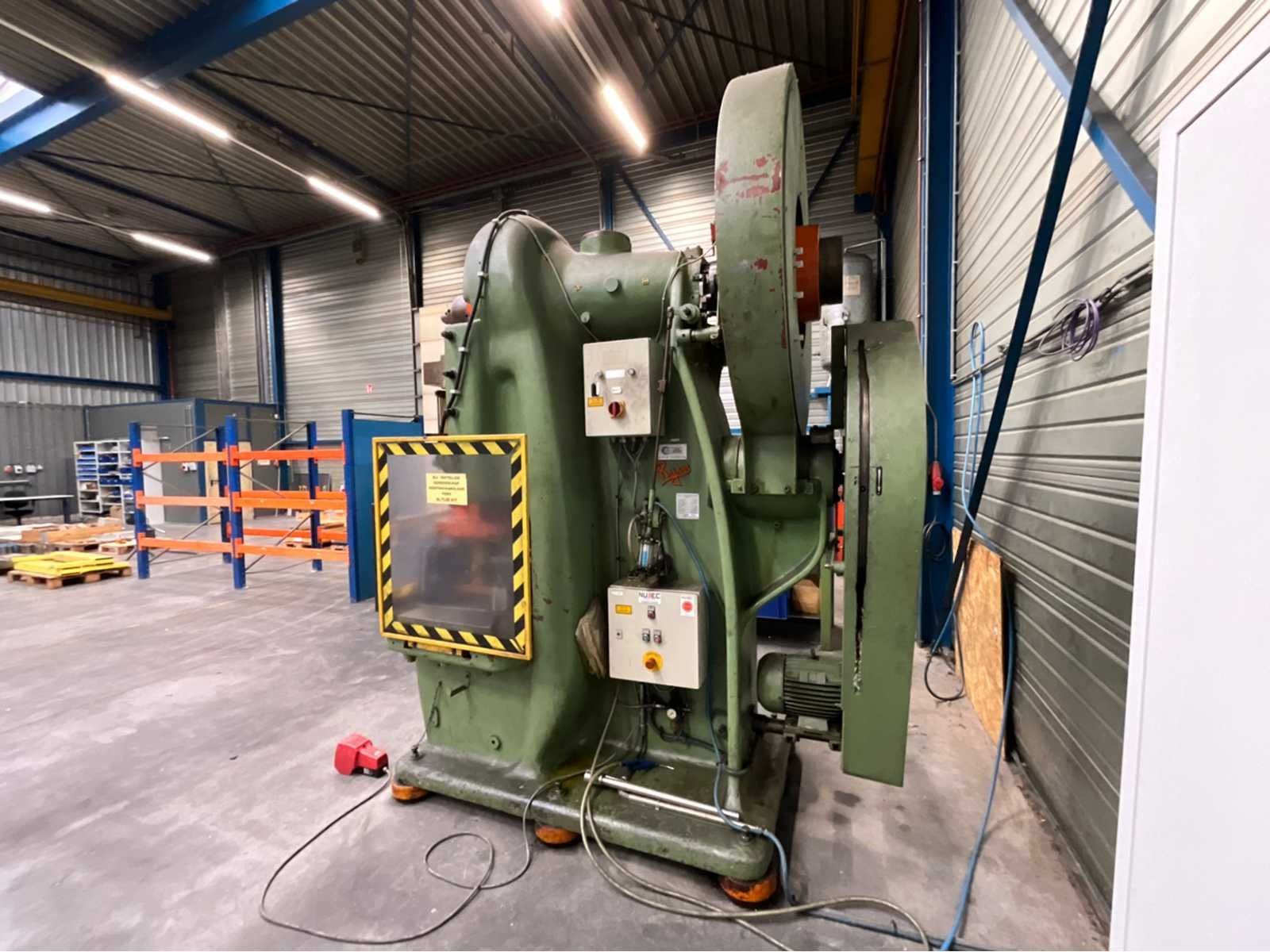 Drukcapaciteit; 1800 kN; aantal,slagen 50; slag verstelbaar 28 - 140 mm; stoter verstelbaar 80 mm; voorzien van T-gleuf opspantafel; veiligheidsscherm; voetbediening; 2x elektro schakelkast; Merk: Rijva Type: EP 180 type 511 Bouwjaar: 1970 Serienummer: 2050 Capaciteit.: 180t Uitlading: 0mm Slag: 140mm Tafel afmeting l: 1050mm Tafel afmeting b: 700mm Motorvermogen (kW): 8.8kW Aansluiting: 400V Machinegewicht: 12000kg Afmeting l: 1300mm Afmeting b: 2300mm Afmeting h: 3100mm