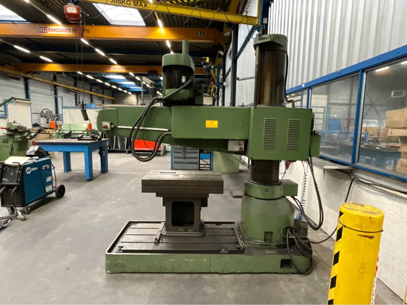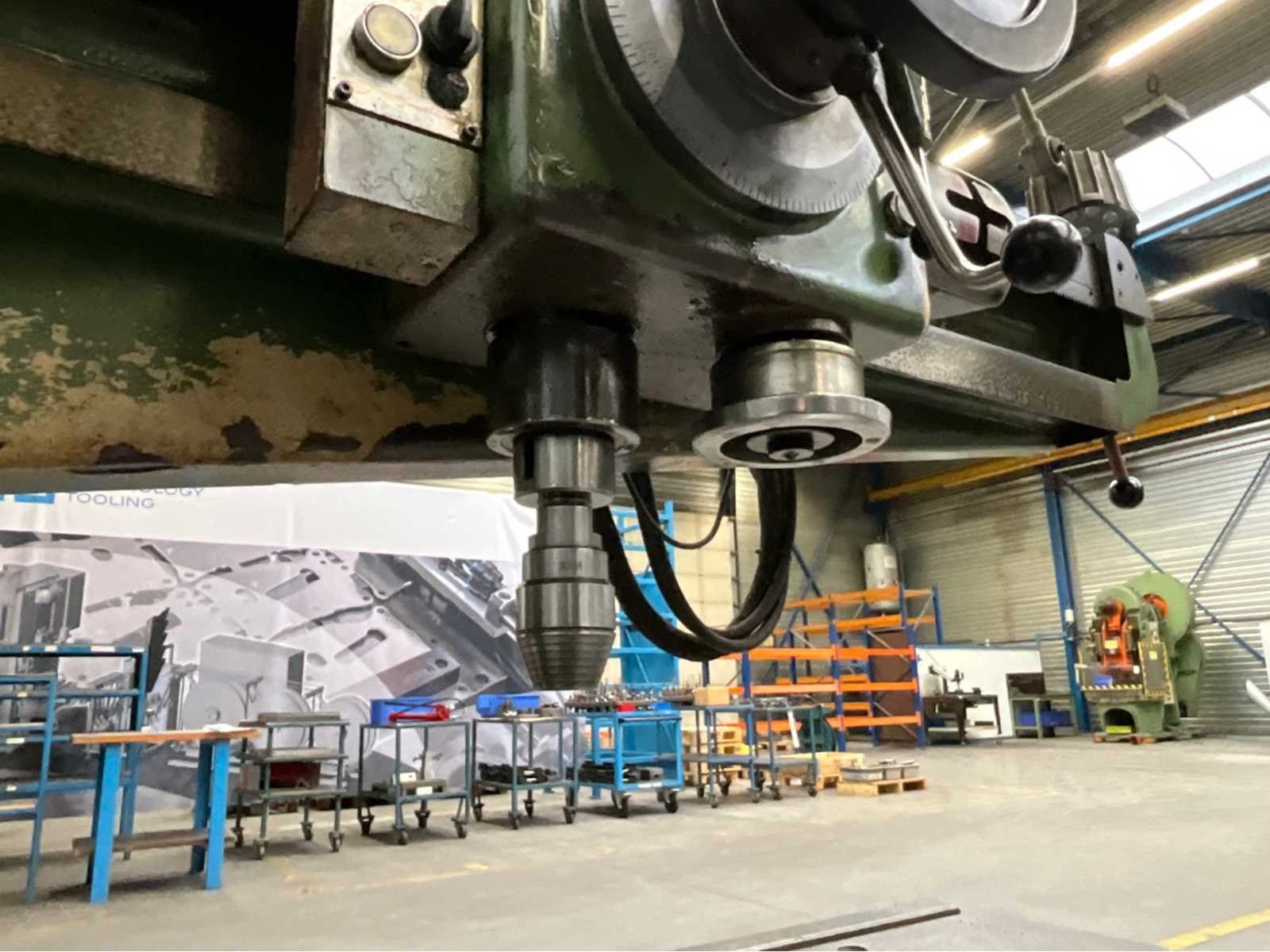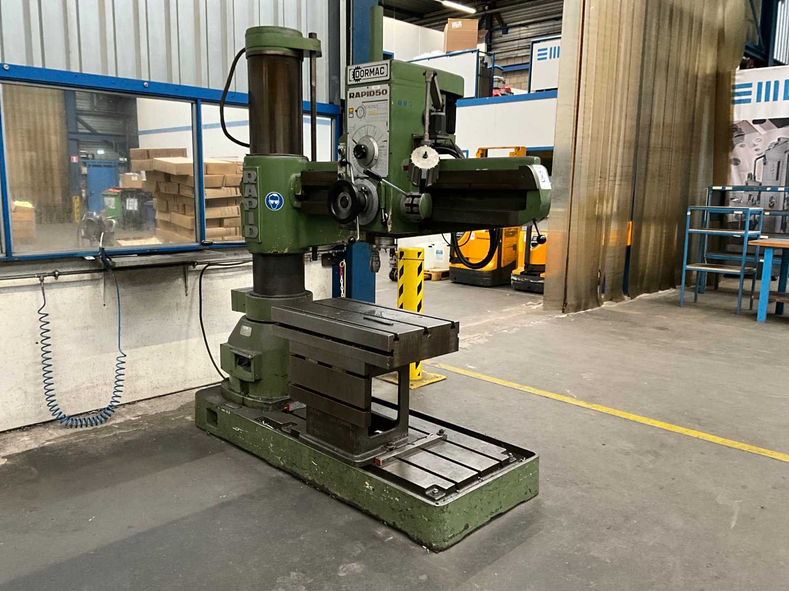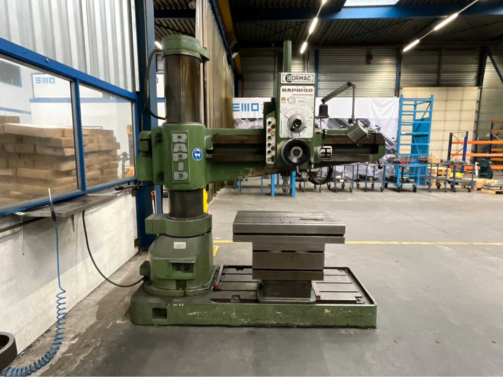 In de hoogte verstelbare radiaalarm; maximale uitlading circa 1000 mm; maximale product hoogte circa 1200 mm; maximale boor diameter 8,5 - 47 mm; voorzien van T-gleuf opspan voet afmeting 770x1300 mm; inclusief T-gleuf opspanblok afmeting 460x850x650 mm; Merk: Dormac Type: Rapid 50 Bouwjaar: 1984 Serienummer: 8202 Aantal snelheden: 12 Snelheid van n =: 40rpm Snelheid tot n =: 1250rpm Aansluiting: 400V Afmeting l: 800mm Afmeting b: 2100mm Afmeting h: 2400mm