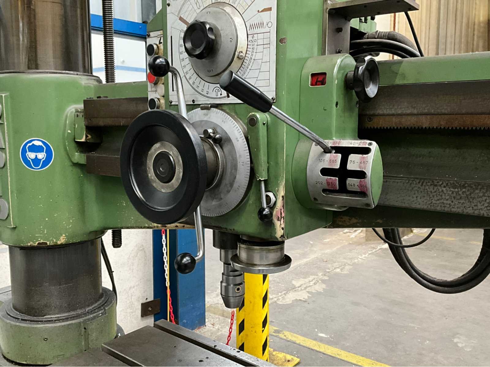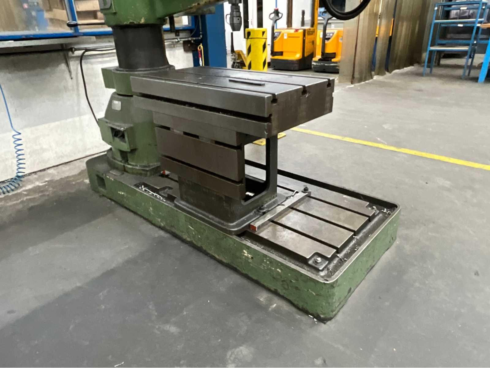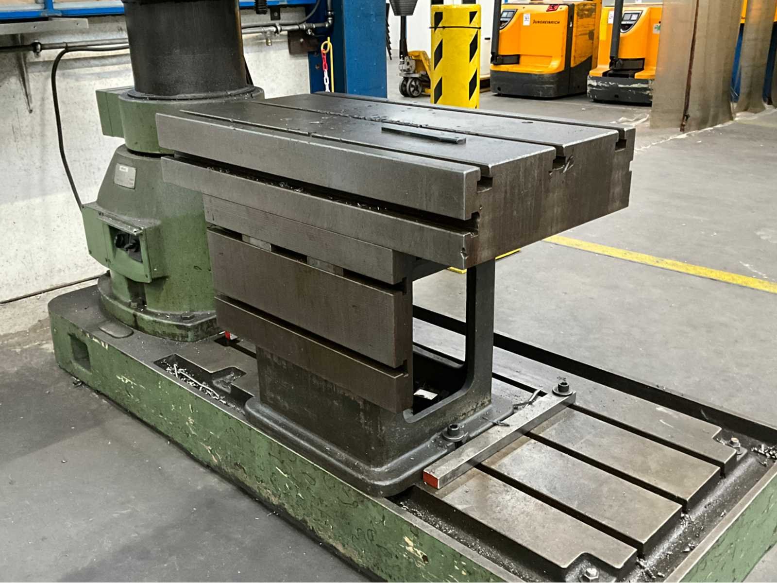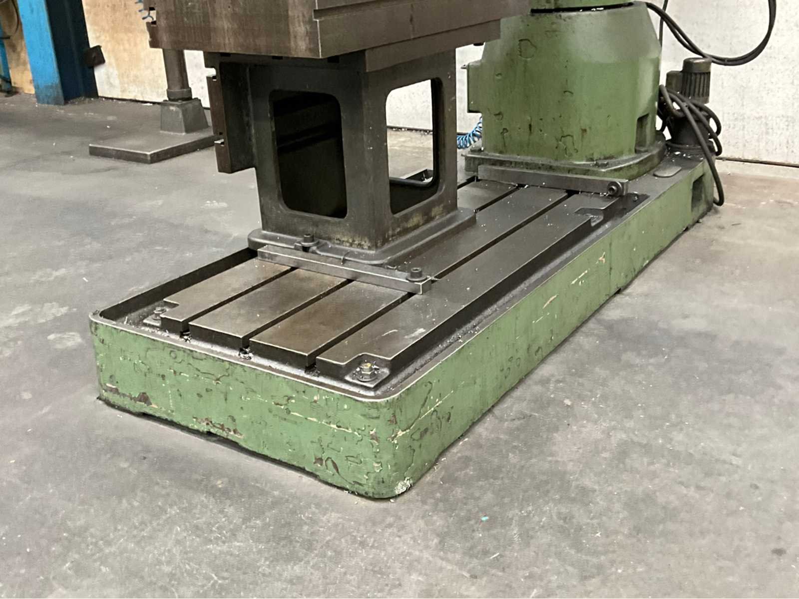 In de hoogte verstelbare radiaalarm; maximale uitlading circa 1000 mm; maximale product hoogte circa 1200 mm; maximale boor diameter 8,5 - 47 mm; voorzien van T-gleuf opspan voet afmeting 770x1300 mm; inclusief T-gleuf opspanblok afmeting 460x850x650 mm; Merk: Dormac Type: Rapid 50 Bouwjaar: 1984 Serienummer: 8202 Aantal snelheden: 12 Snelheid van n =: 40rpm Snelheid tot n =: 1250rpm Aansluiting: 400V Afmeting l: 800mm Afmeting b: 2100mm Afmeting h: 2400mm
