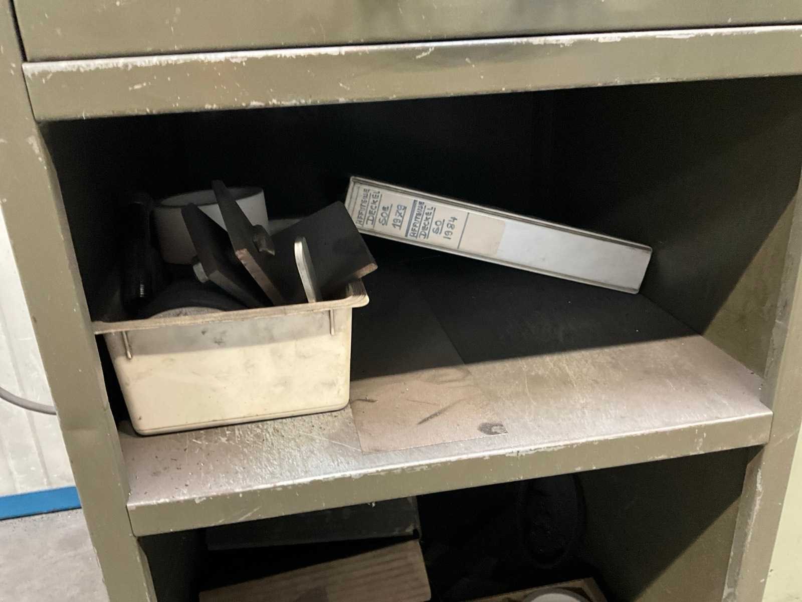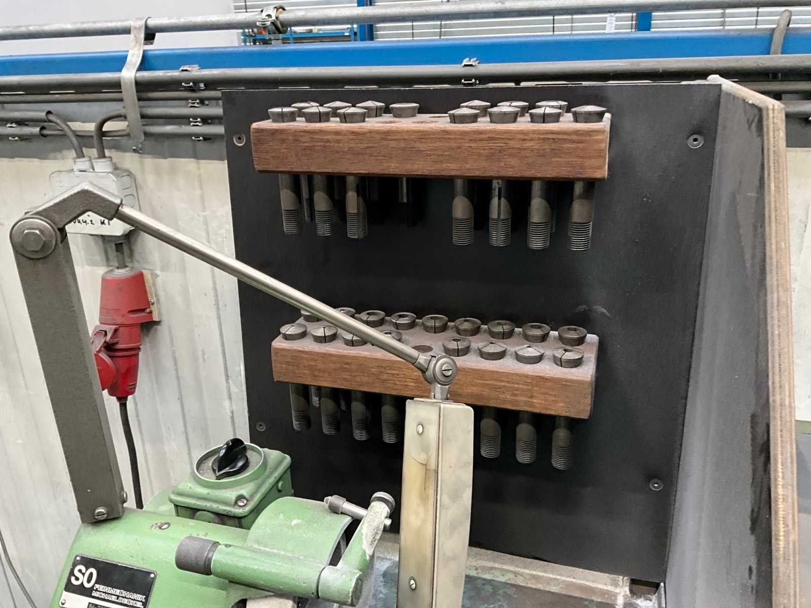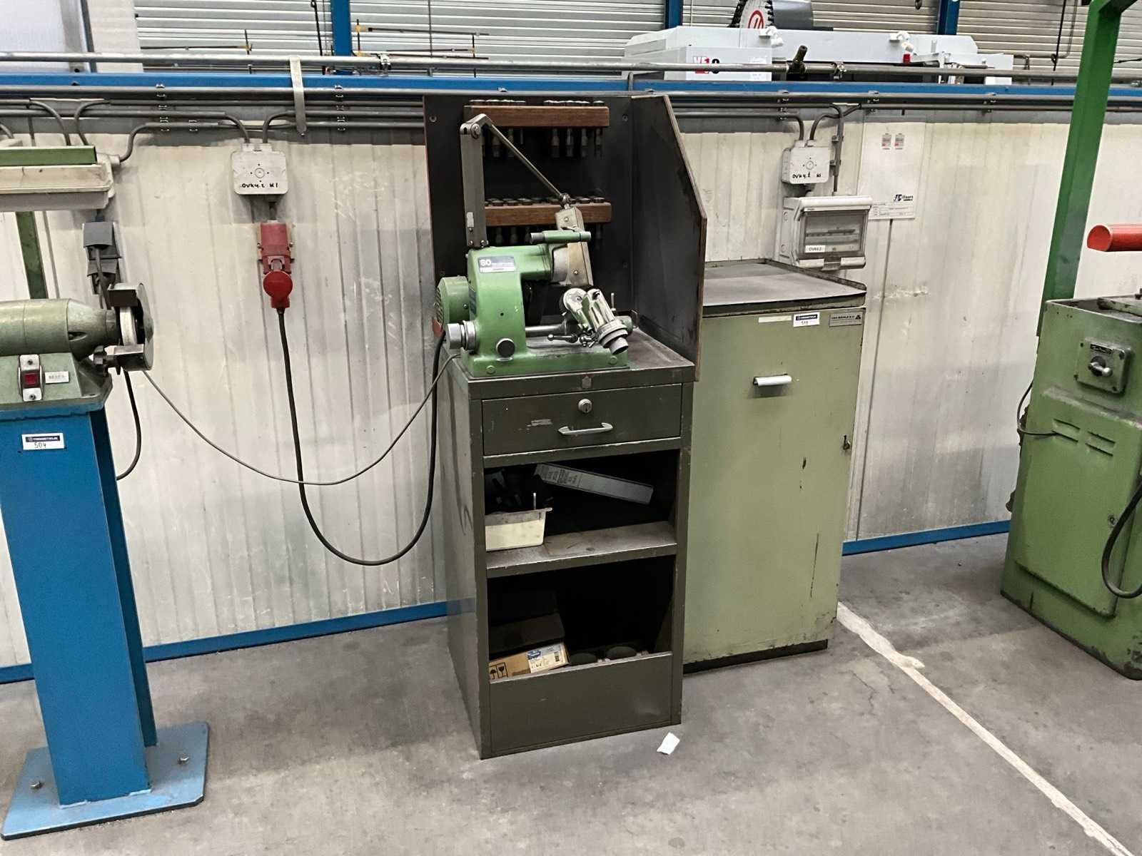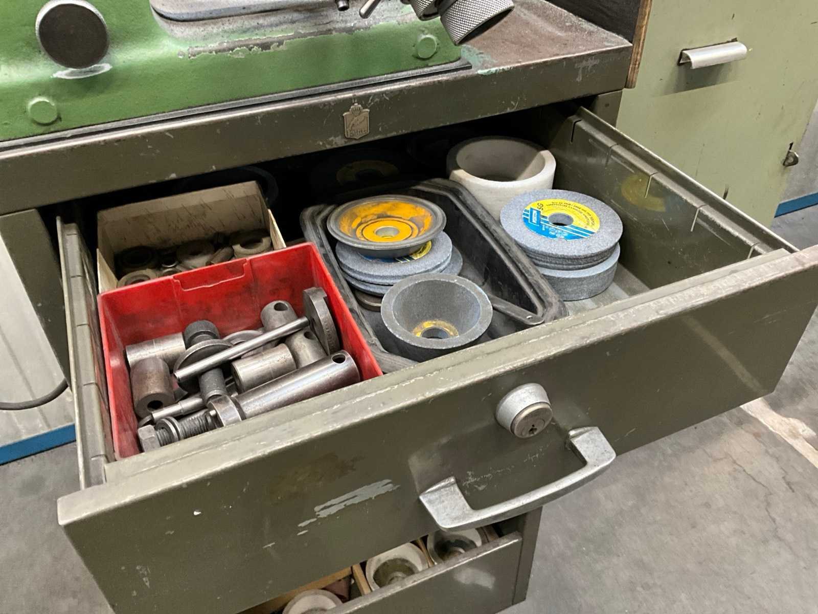 Inclusief diverse spantangen op de achterwand; inclusief staal onderkast voorzien van lade; diverse inhoud waaronder bevestigingsmaterialen en aangebroken slijpstenen; Merk: Michael Deckel Type: S0 Bouwjaar: 1984 Serienummer: 22028 Aansluiting: 400V