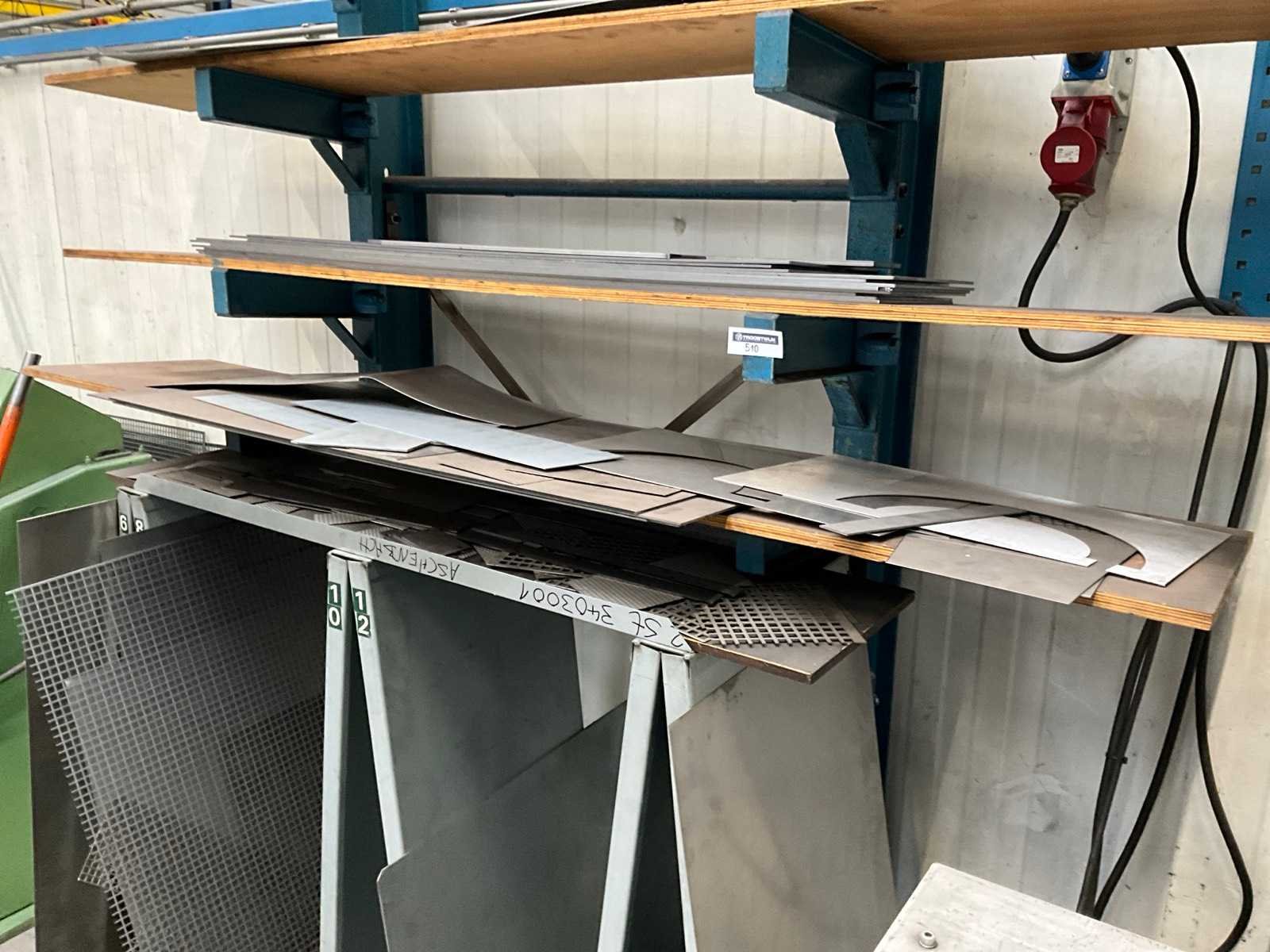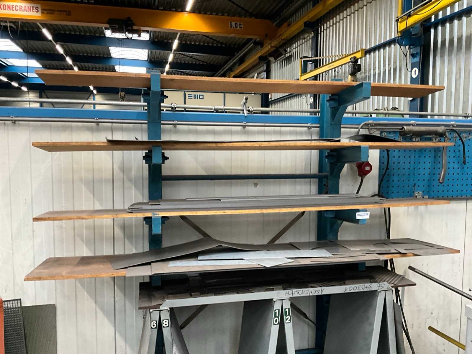 Bestaande uit 2 staanders elk voorzien van 4 draagarmen; draagarmlengte 300 mm; inclusief diverse aangebroken plaatmaterialen in de stelling en achter de machine; totaalafmeting 1200x900x2250 mm;