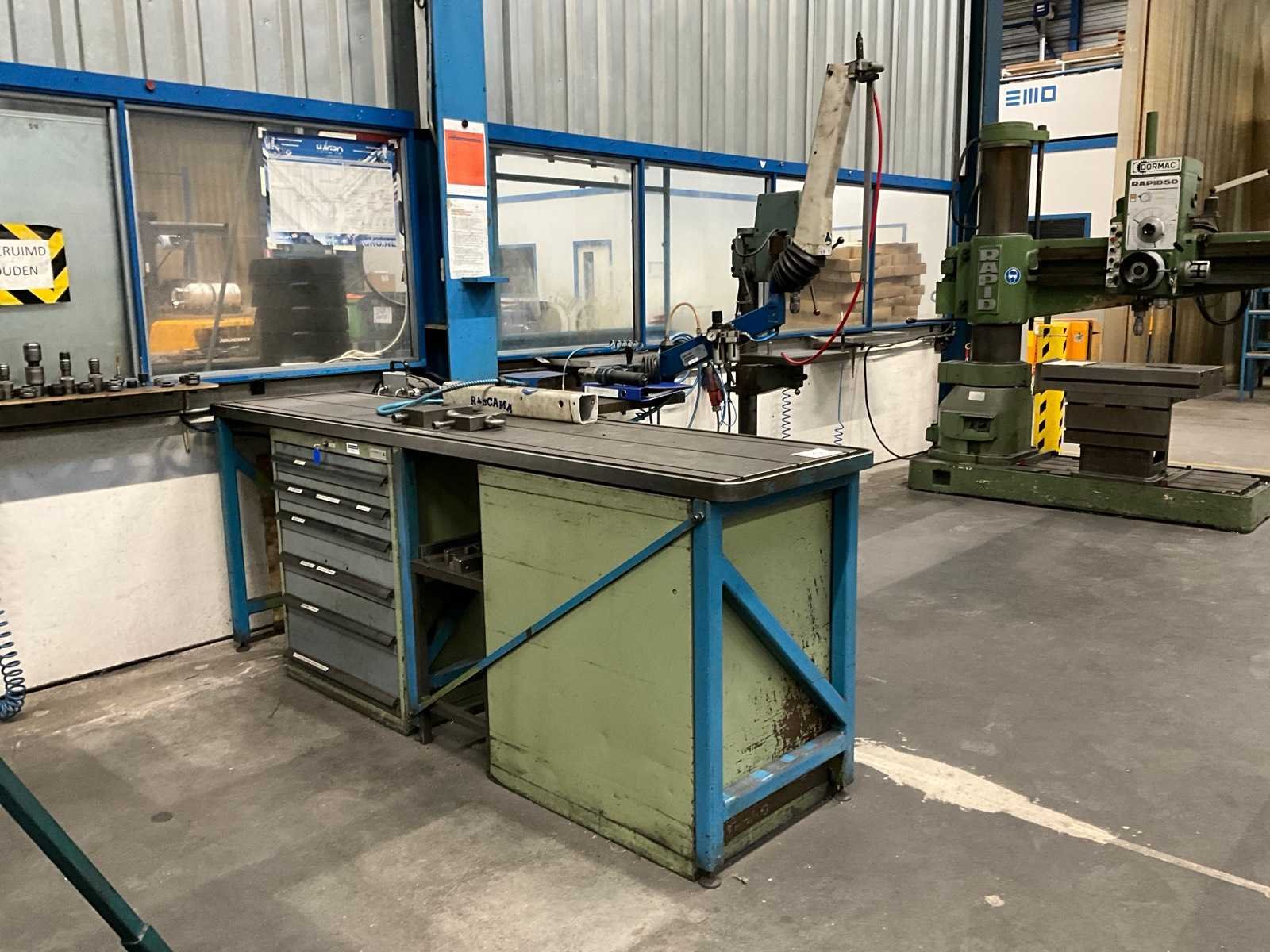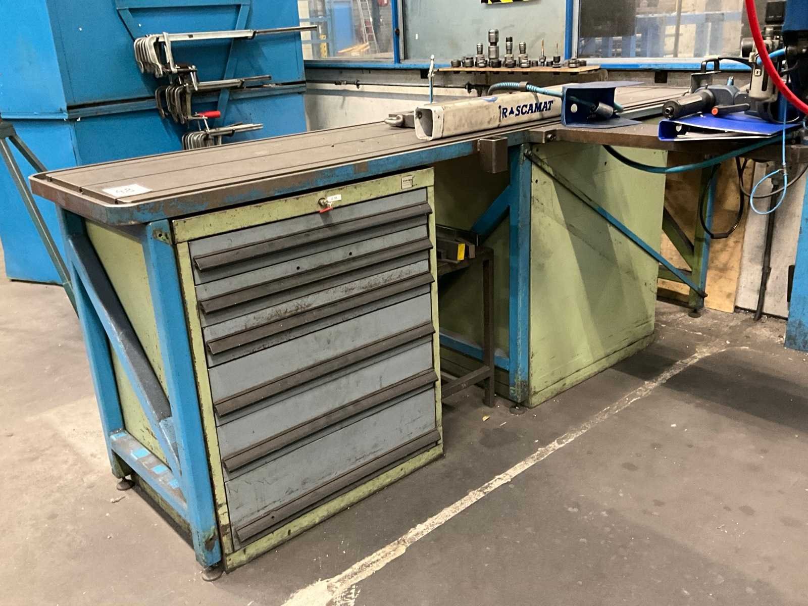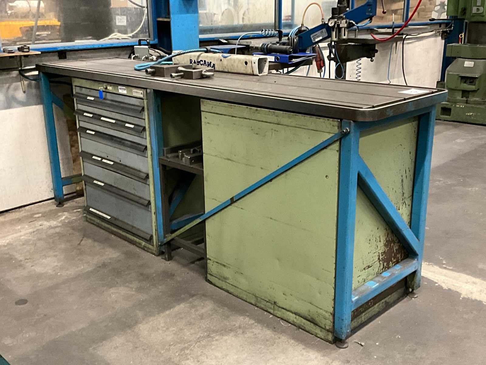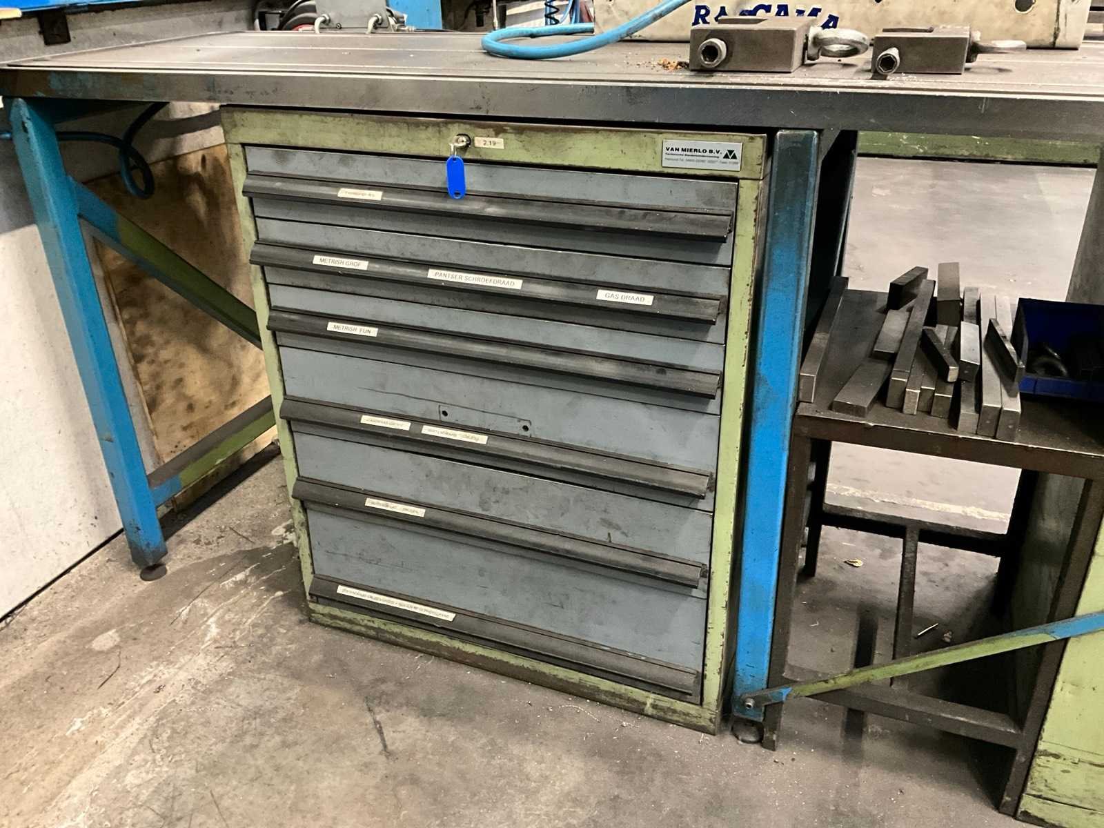 Werktafel voorzien van T-gleuf opspan tafel afmeting circa 2460x600 mm; tafel voorzien van tapunit / taparm Tecnospiro Rascamat (volgens opgave mogelijk defect); 5 laden gereedschaps ladenkast inclusief inhoud boren en snijgereedschappen; 5 laden gereedschaps ladenkast inclusief inhoud boren;