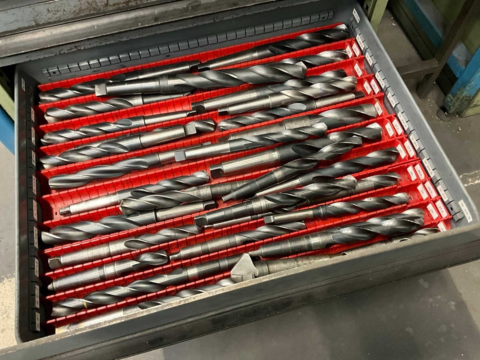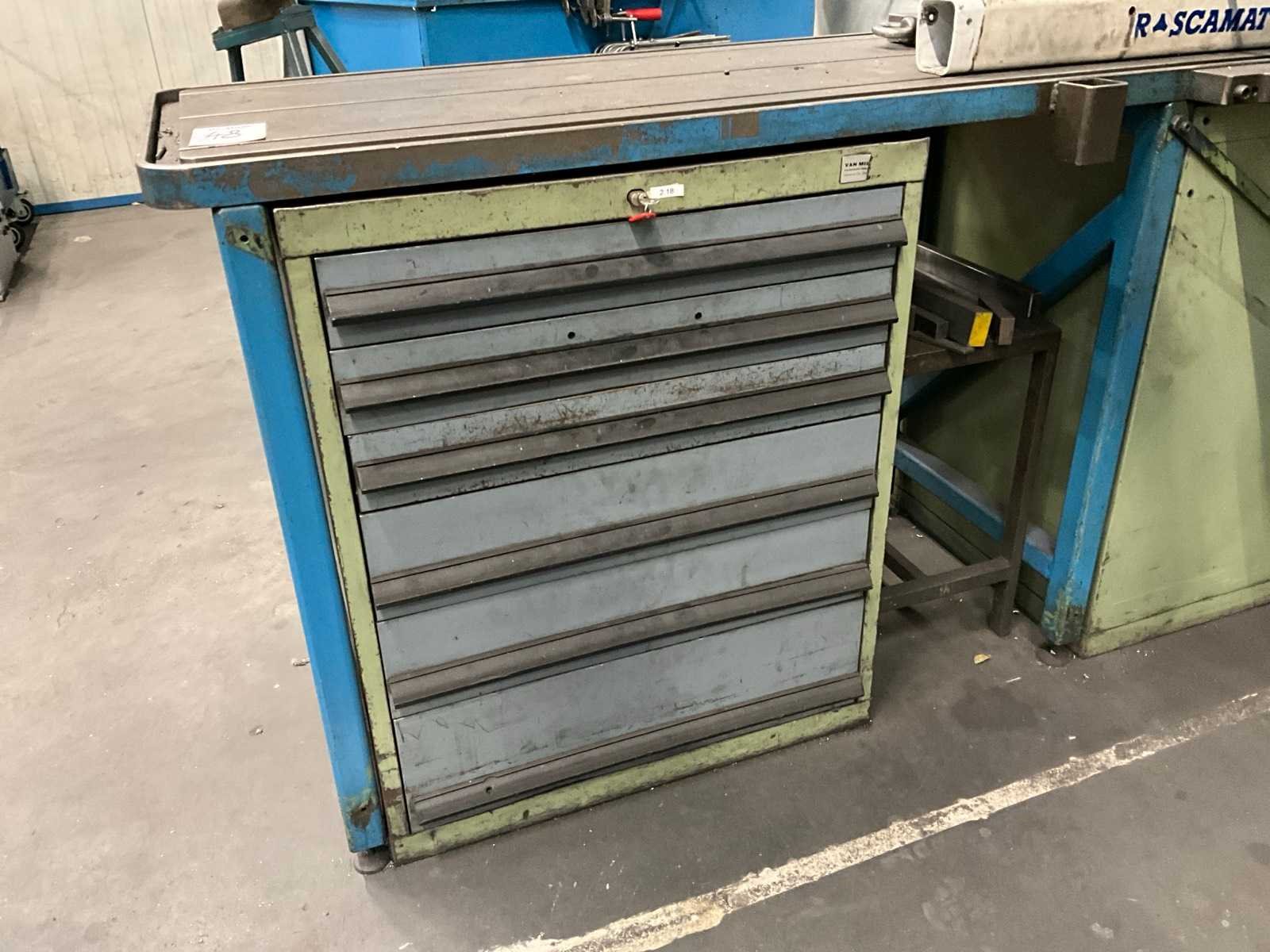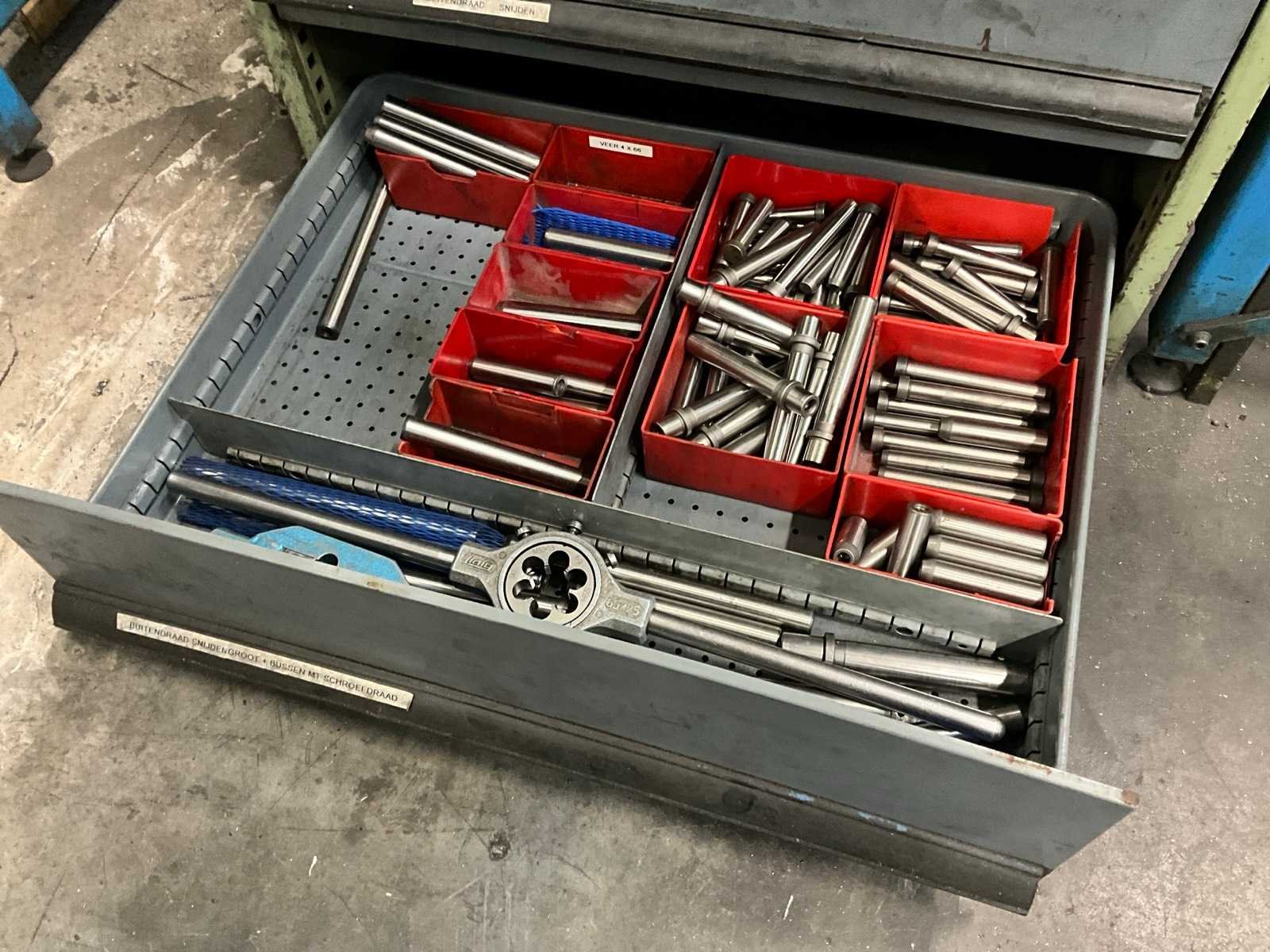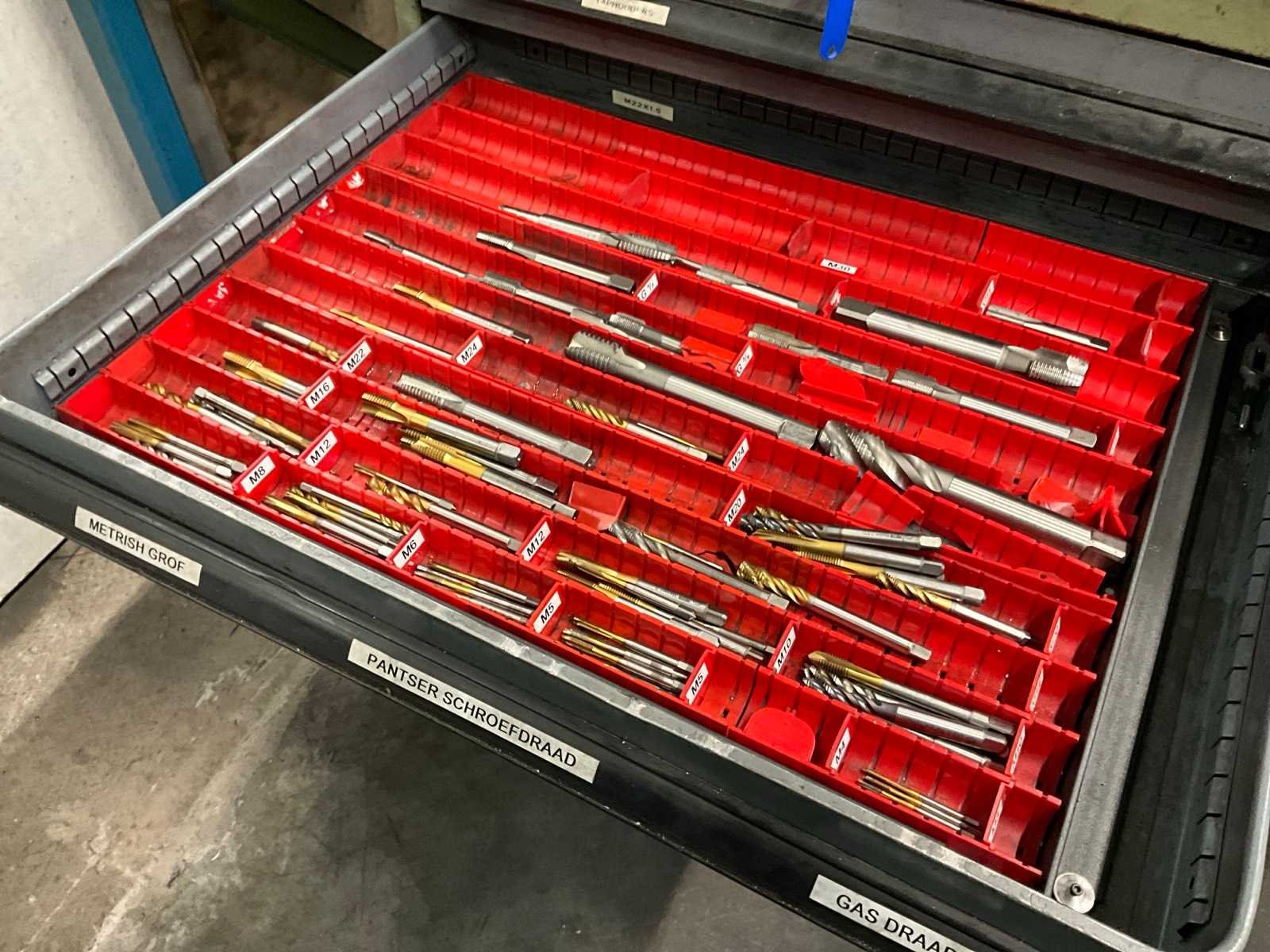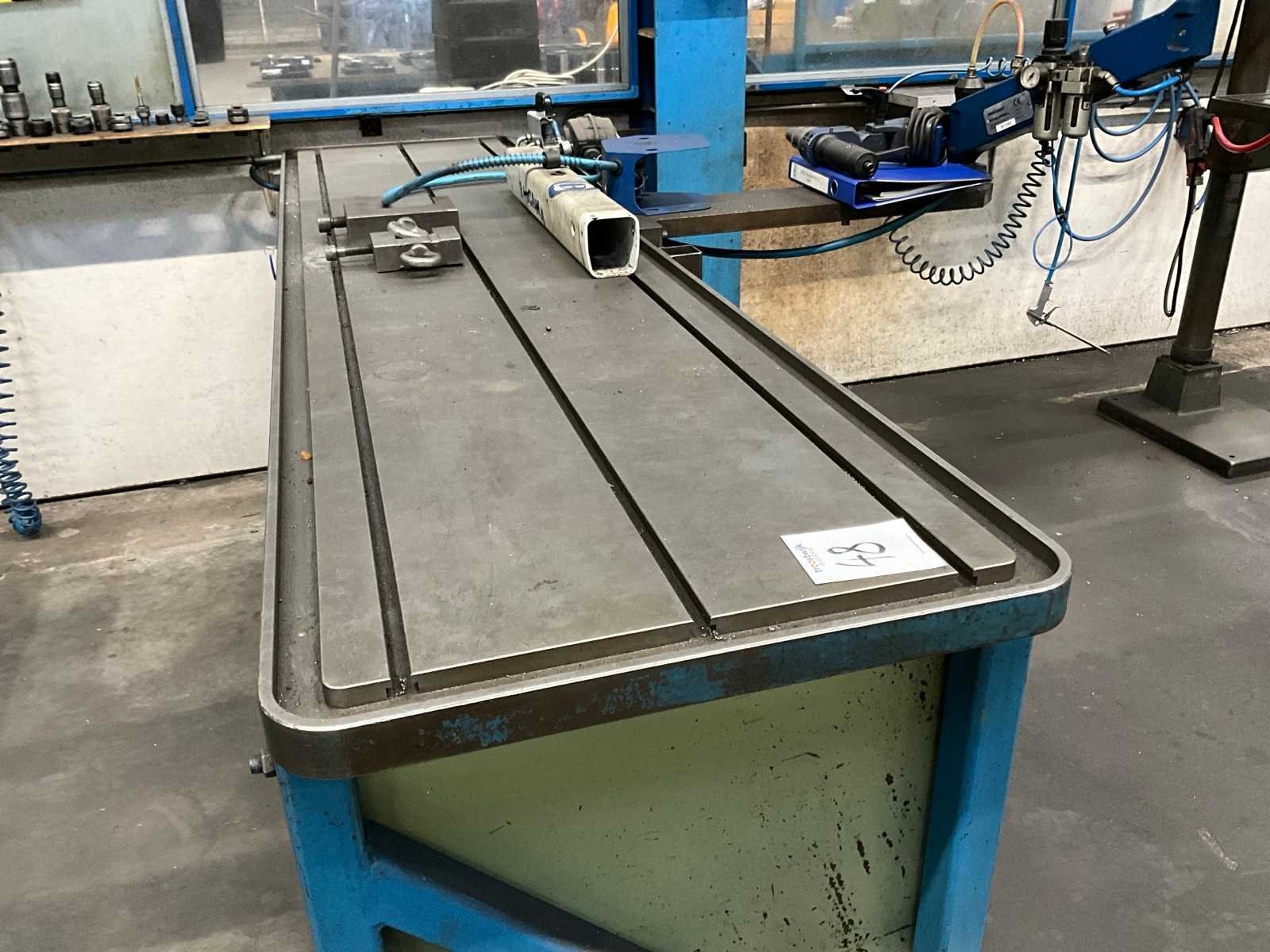 Werktafel voorzien van T-gleuf opspan tafel afmeting circa 2460x600 mm; tafel voorzien van tapunit / taparm Tecnospiro Rascamat (volgens opgave mogelijk defect); 5 laden gereedschaps ladenkast inclusief inhoud boren en snijgereedschappen; 5 laden gereedschaps ladenkast inclusief inhoud boren;