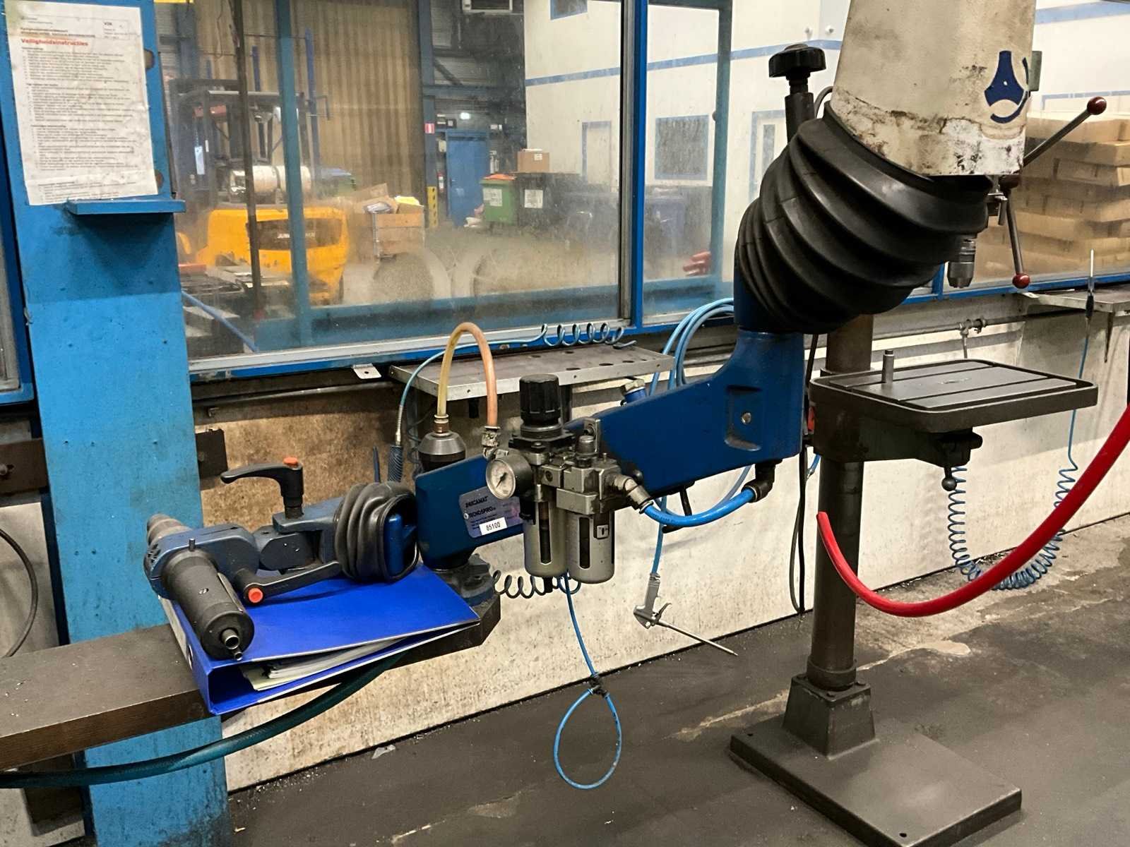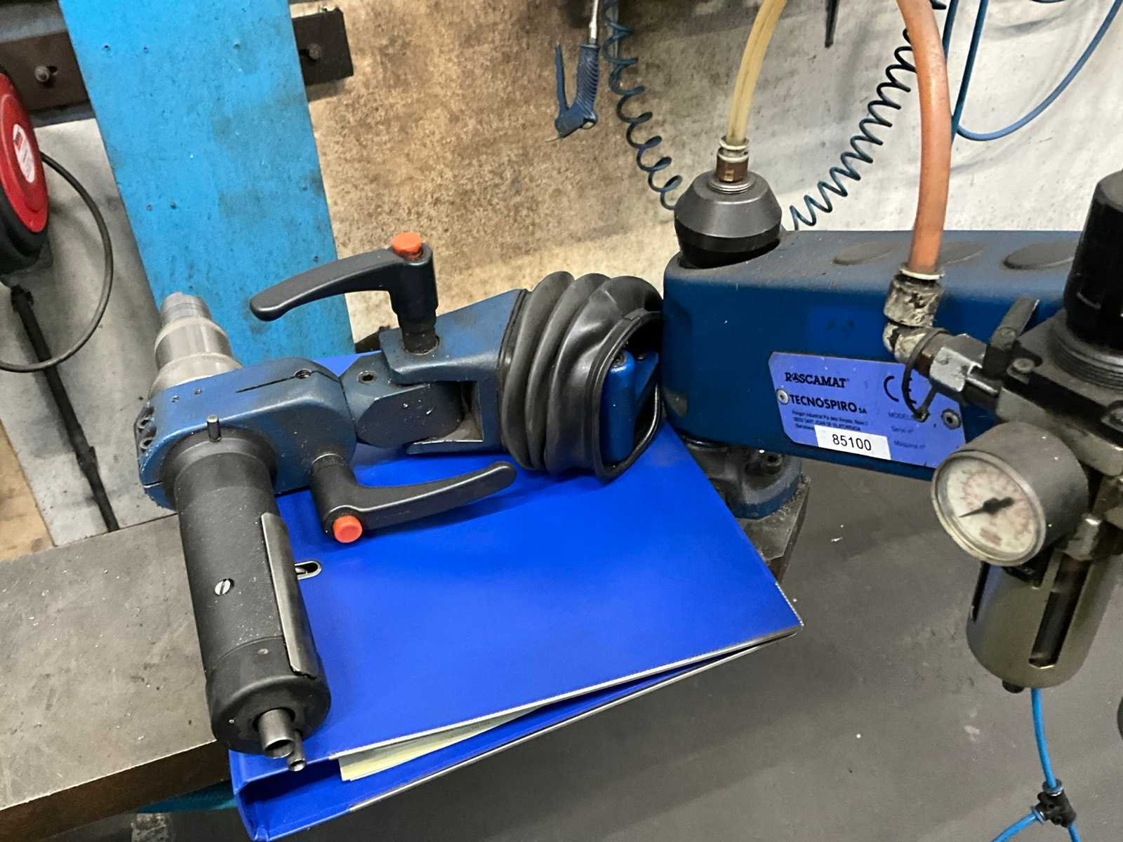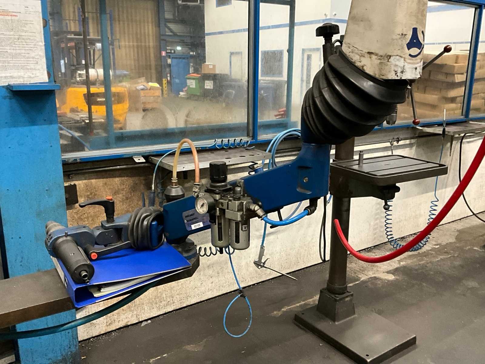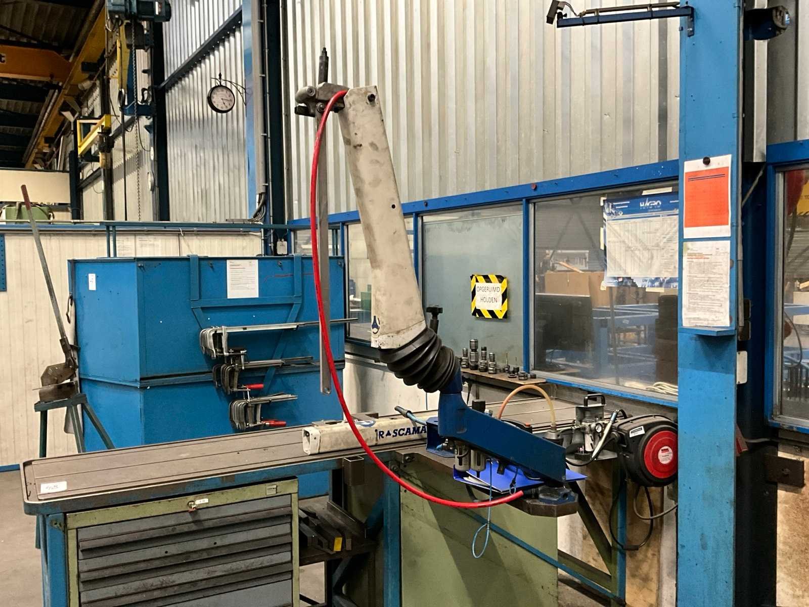 Werktafel voorzien van T-gleuf opspan tafel afmeting circa 2460x600 mm; tafel voorzien van tapunit / taparm Tecnospiro Rascamat (volgens opgave mogelijk defect); 5 laden gereedschaps ladenkast inclusief inhoud boren en snijgereedschappen; 5 laden gereedschaps ladenkast inclusief inhoud boren;
