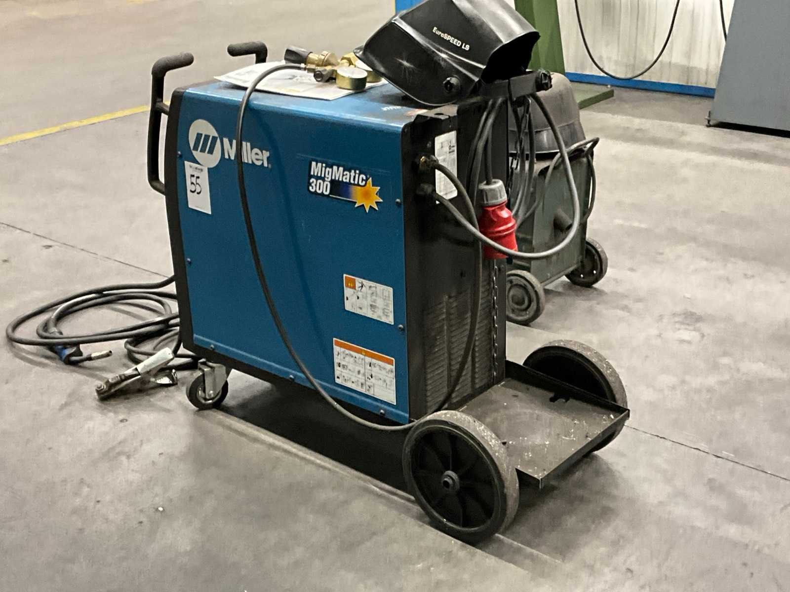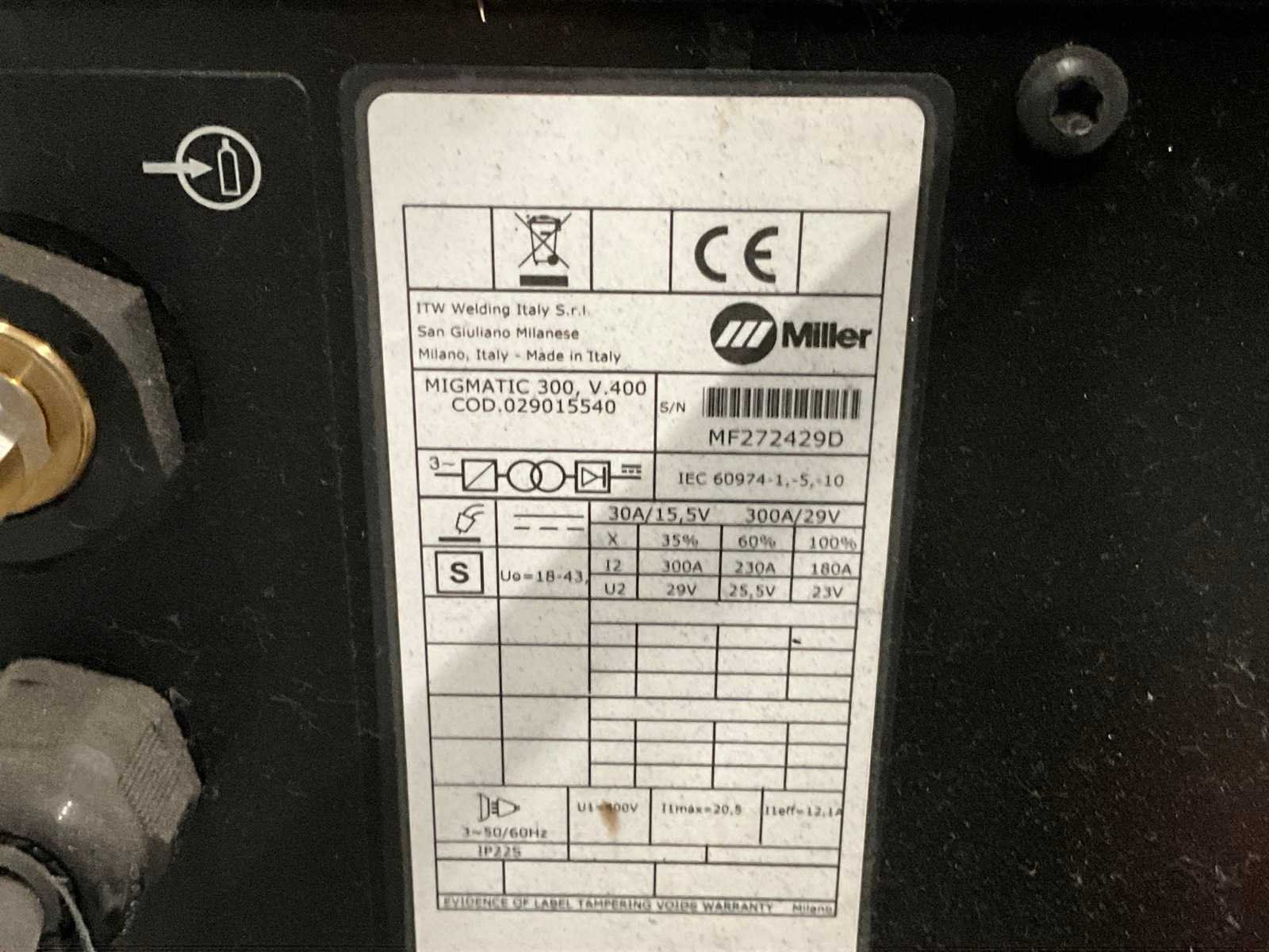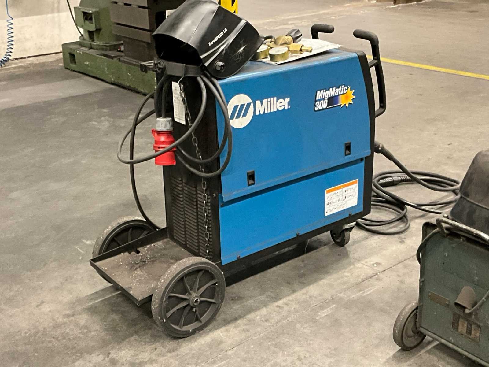 Verrijdbaar; inclusief lashelm; lastoorts; leidingen; drukregelaar; zonder gasfles; Merk: Miller Type: MigMatic 300 Max. lasvermogen: 300A Aansluiting: 400V Afmeting l: 400mm Afmeting b: 1300mm Afmeting h: 800mm